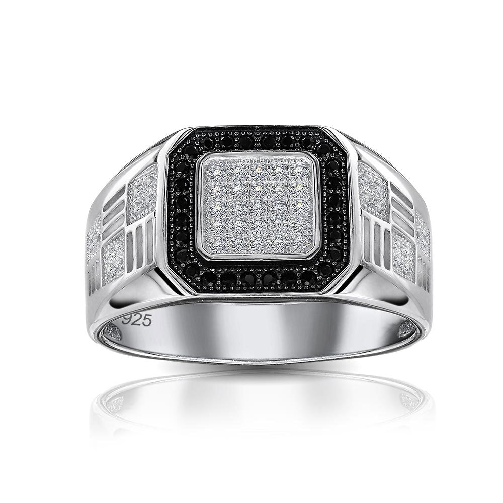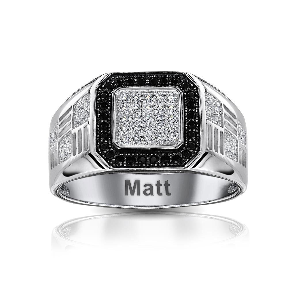 • Impress the special man in your life with this elegant men's engagement ring, featuring a striking two-tone black and clear square design adorned with sparkling pave CZs on a polished .925 silver band.