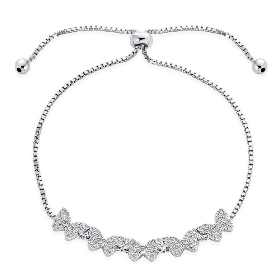 - The butterfly symbolizes spring and beauty. Our rhodium-plated adjustable bracelet features a sparkling cubic zirconia butterfly on a modern box chain. The lariat style with a silver-tone bead ensures a firm fit. Adjustable from 7 to 10 inches, it fits nearly any wrist. Perfect for adding a touch of elegance to any outfit.