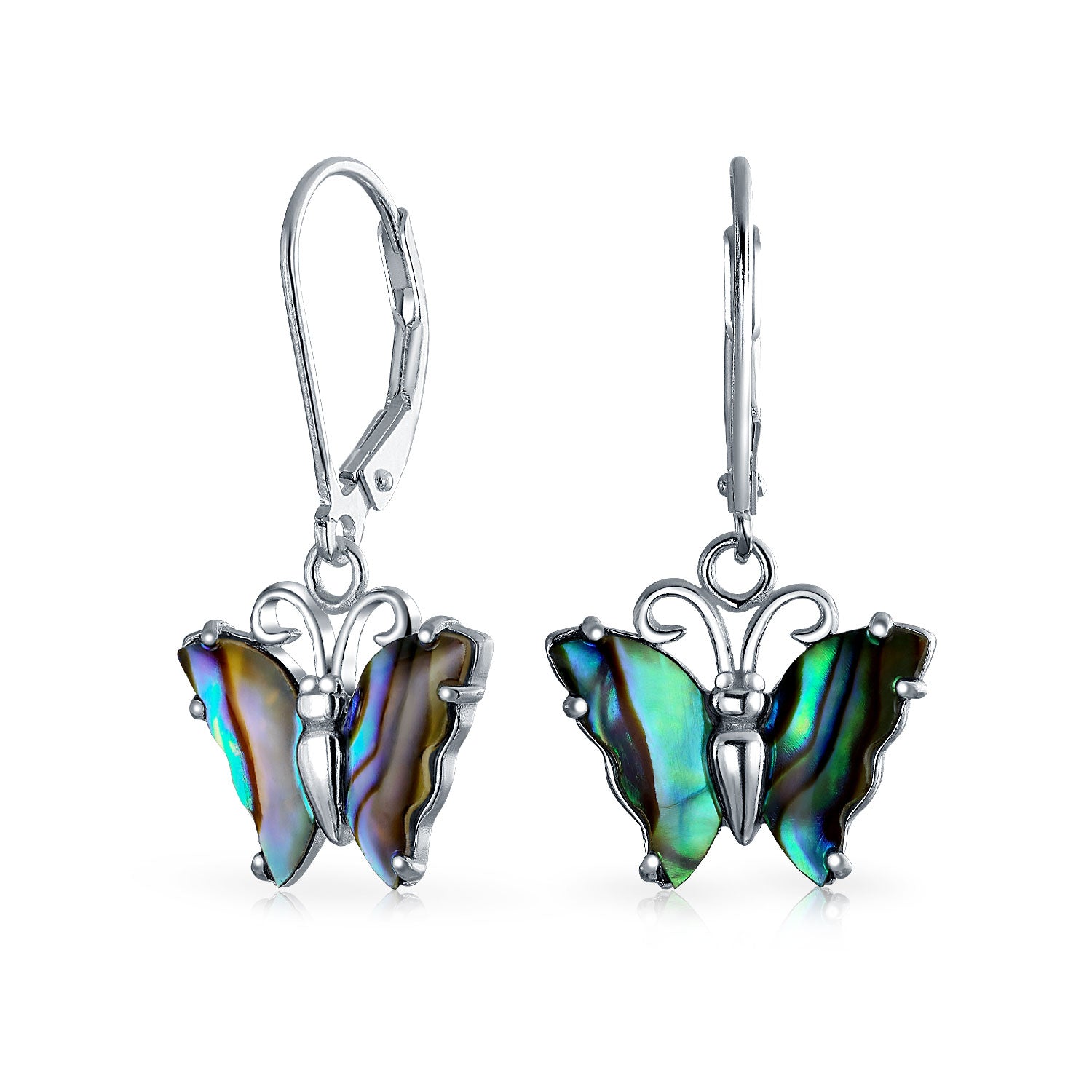 - Add a touch of springtime elegance with a nautical flair to your look with these .925 silver dangle earrings. Featuring a captivating butterfly design adorned with natural abalone shell wings, they shimmer beautifully in tones of green and blue, making them the perfect accessory for any outfit.