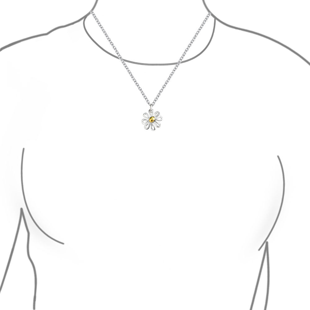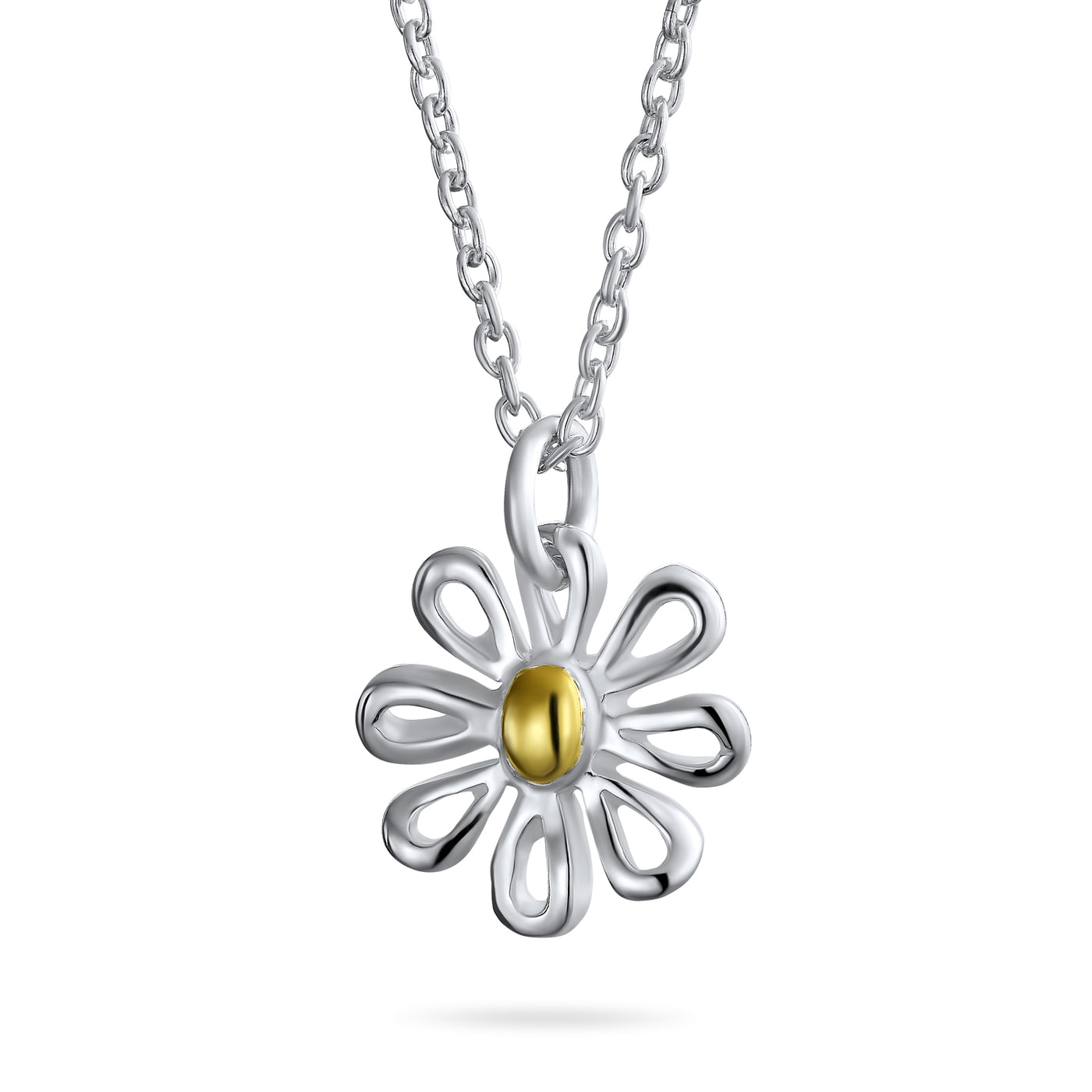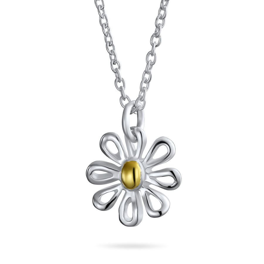 - Embrace floral elegance year-round with our daisy pendant necklace. Crafted in sterling silver with a gold-plated center, this 16-inch necklace features a contemporary open design, perfect for a springtime gift. Pair it with our exquisite flower jewelry collection for a complete look.