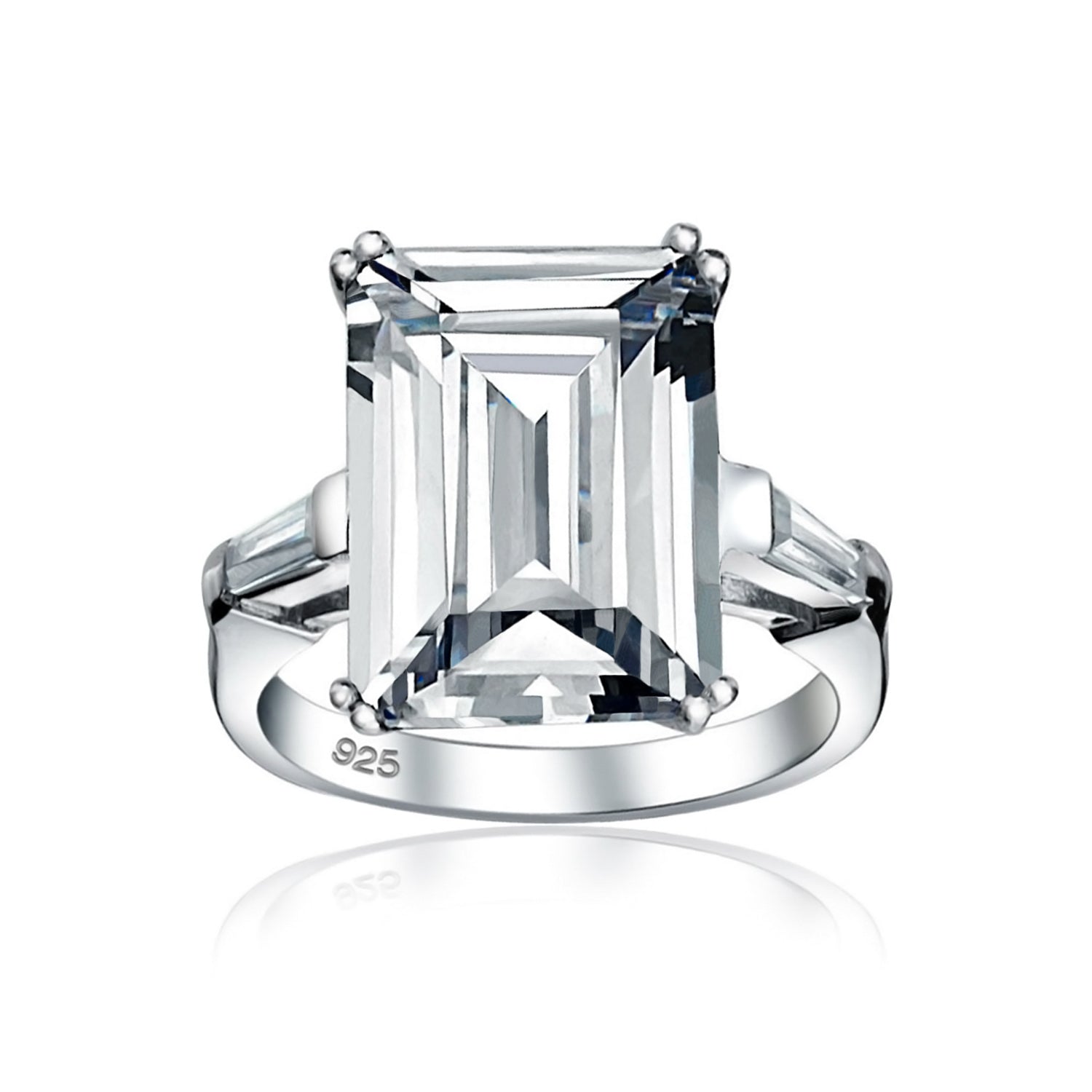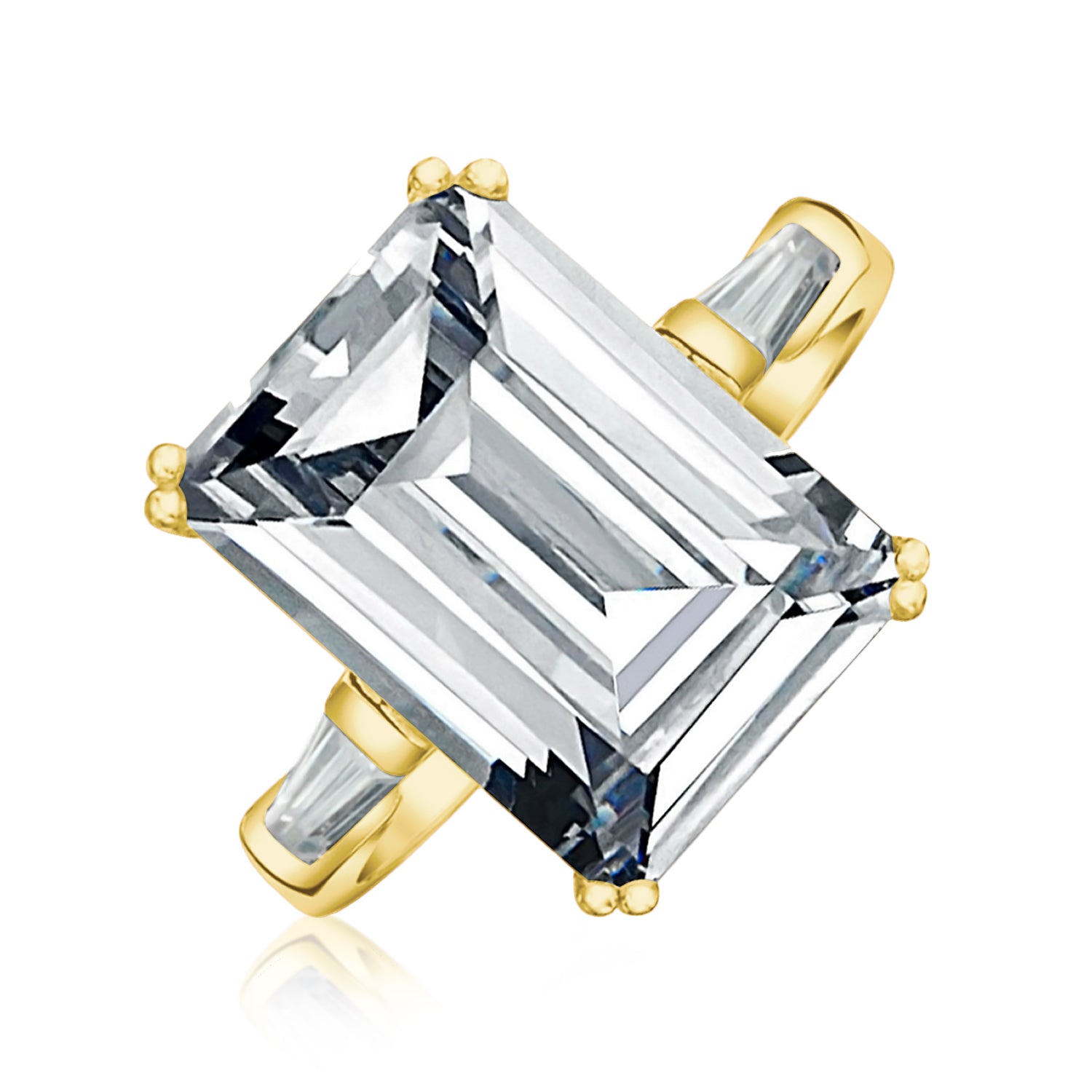 - Make her proposal unforgettable with this dazzling Art Deco-inspired engagement ring. Featuring a brilliant 10CT emerald-cut cubic zirconia center stone, this sterling silver ring exudes Hollywood glamour and sophistication. The classic four-prong setting is accented by two baguette CZ stones, adding depth and elegance to the design. Crafted from .925 sterling silver and plated in luxurious 14K yellow gold (or rhodium for a sleek finish), this ring measures 14mm x 10mm and captures the light beautifully. Perfect for brides-to-be, fashionistas, or anyone who loves timeless elegance, this ring promises to impress and delight for a lifetime of memories.