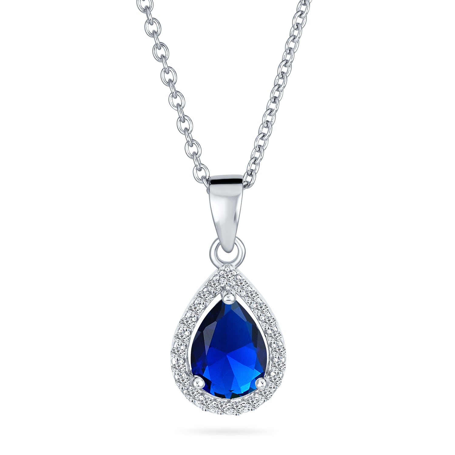 - Feel blissful and elegant with our enchanting Blue Simulated Sapphire Teardrop CZ Pendant. Crafted in .925 Sterling Silver, it dazzles with a medium Simulated Sapphire teardrop CZ stone. Surrounded by mini clear round CZs in a pave crown setting, it offers a chic look. Perfect for weddings, this affordable pendant makes a fabulous statement. Ideal for any outfit or as a holiday gift.
