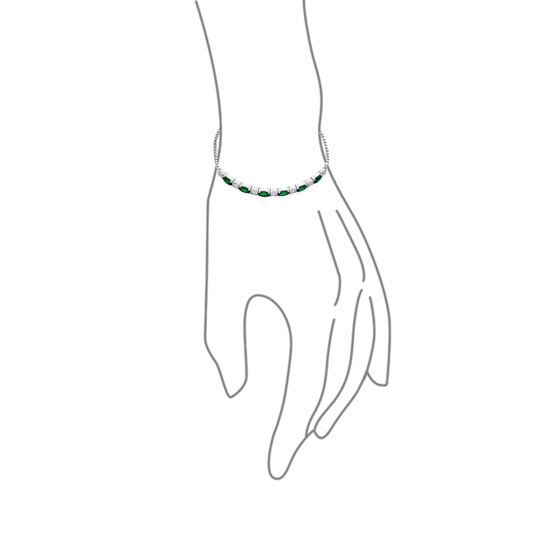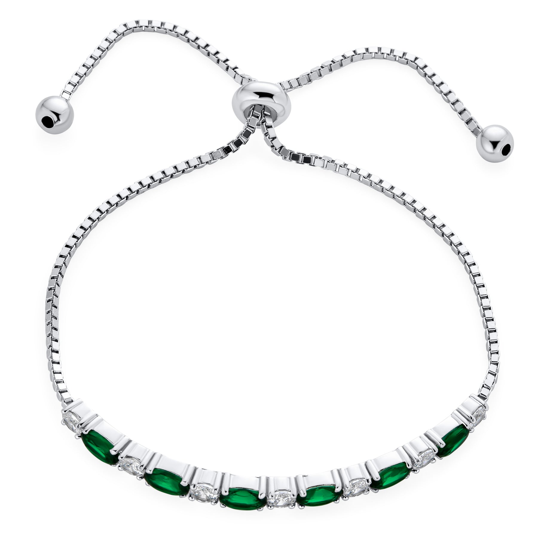 - Discover a modern twist on the classic tennis bracelet, perfect for diamond lovers! This adjustable bracelet features prong-set oval green glass and round clear cubic zirconia gems. The box chain offers a contemporary, clean look. Lariat styling with a silver bead and rubber lining ensures a secure fit. Adjustable from 7 to 10 inches, it fits nearly any wrist.