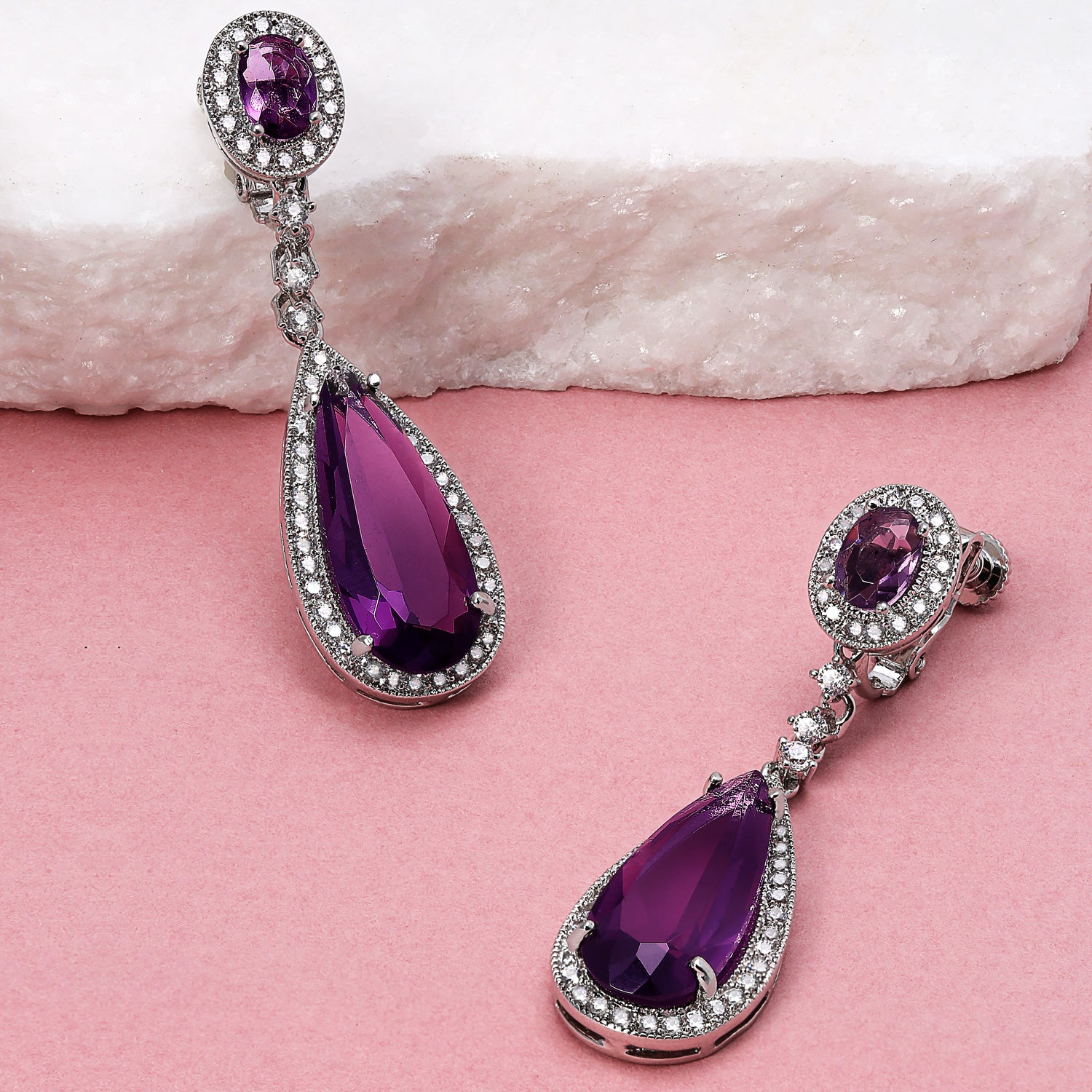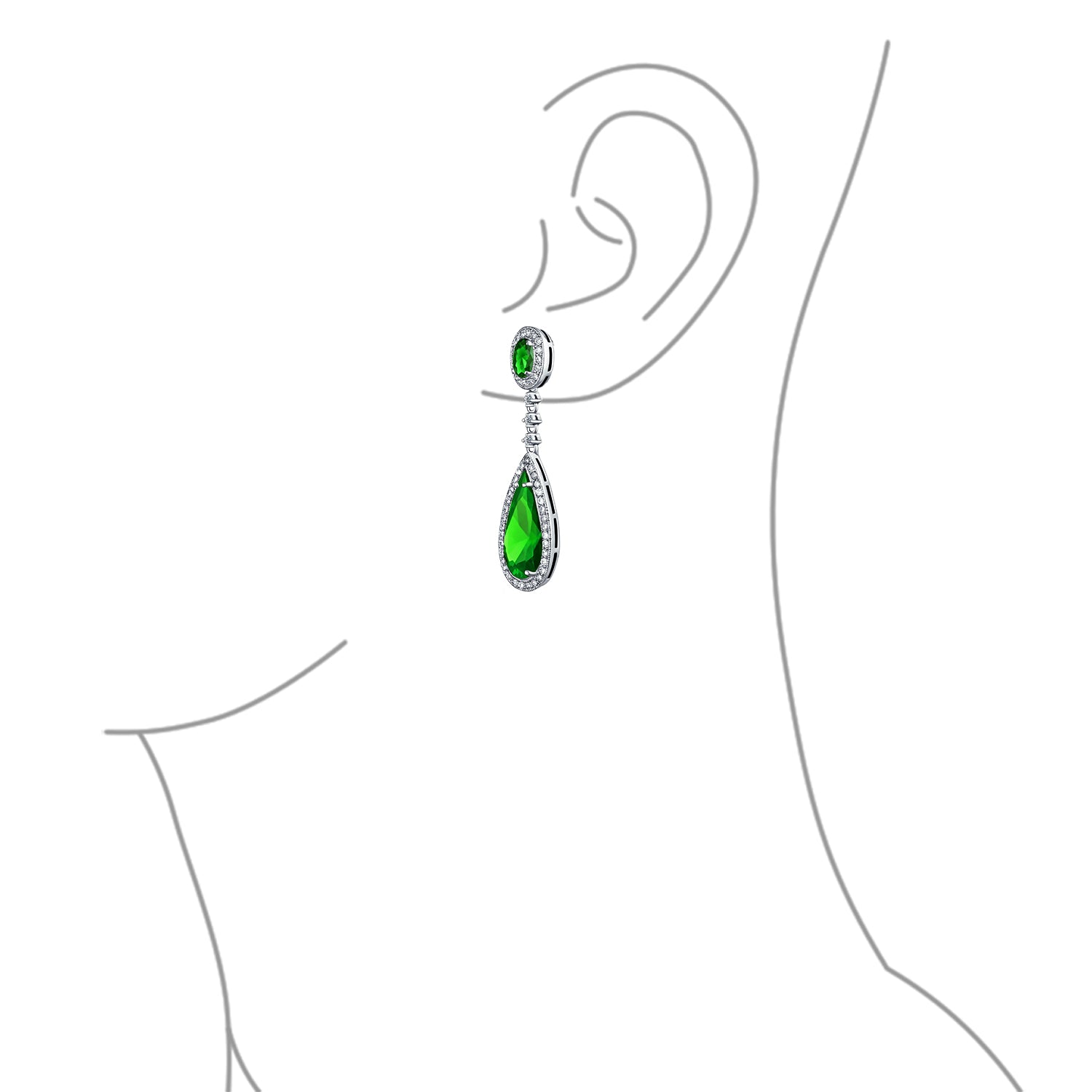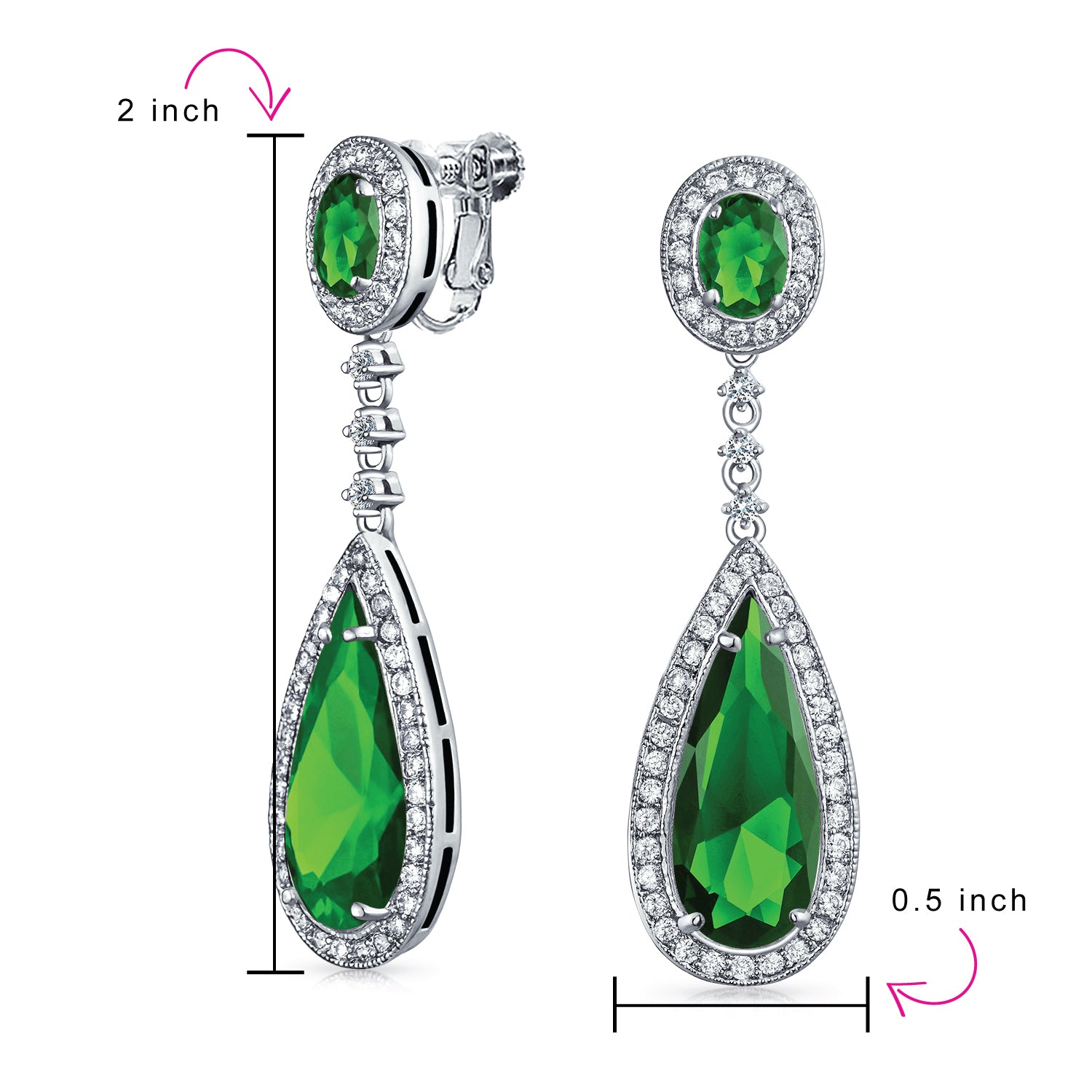 - Celebrate your May birthday in style with our stunning Simulated Emerald cubic zirconia earrings. These must-have fashion accessories make a sensational May birthstone gift. Each dangle earring features Simulated Emerald green teardrop and oval CZ stones, accented by a halo of clear cubic zirconias. Our chandelier drop earrings hang with a screw-back clip-on fastening for adjustable comfort. These lightweight Simulated Emerald chandelier earrings offer a classic style. Perfect for various outfits, they add a special touch to your prom ensemble, sparkling all night long.