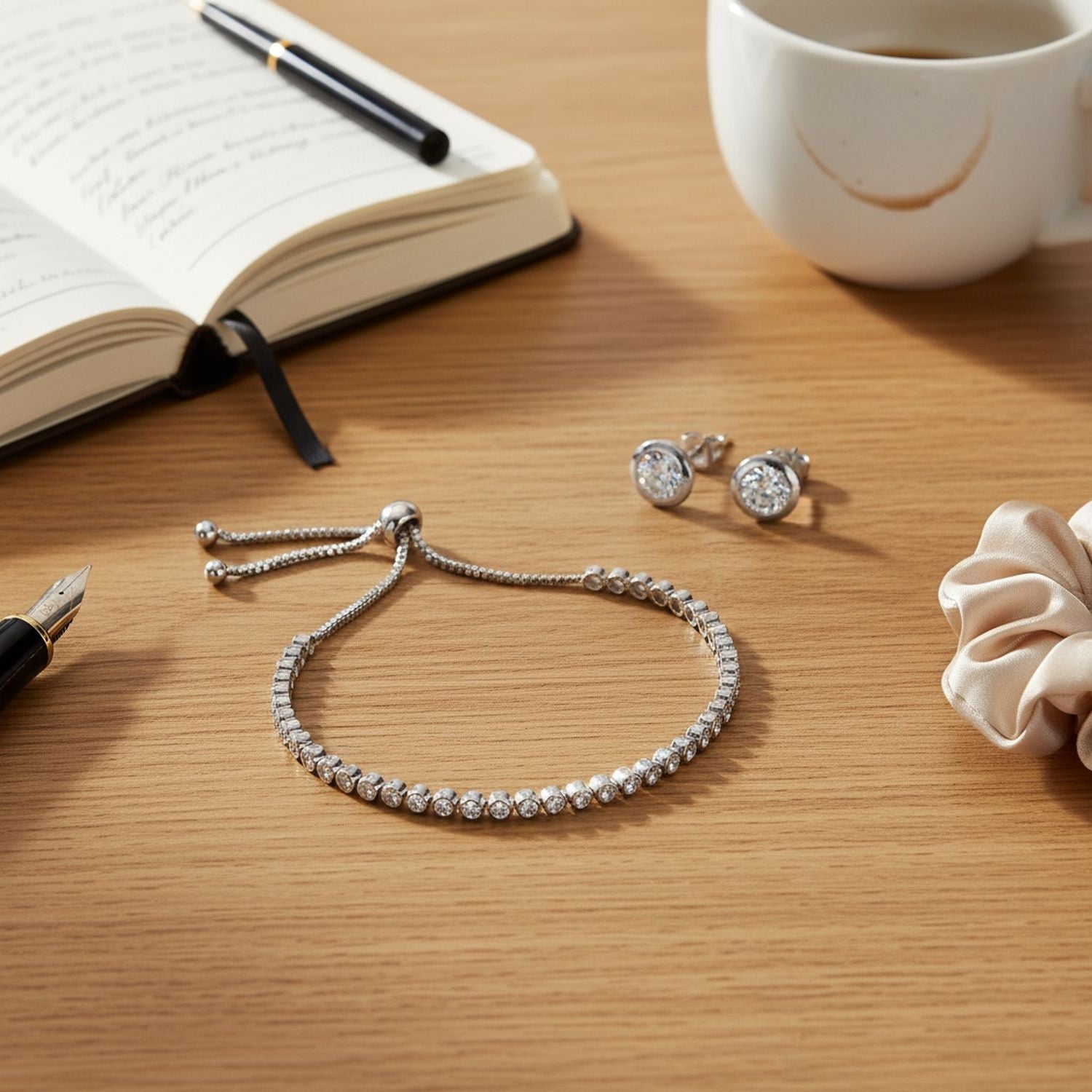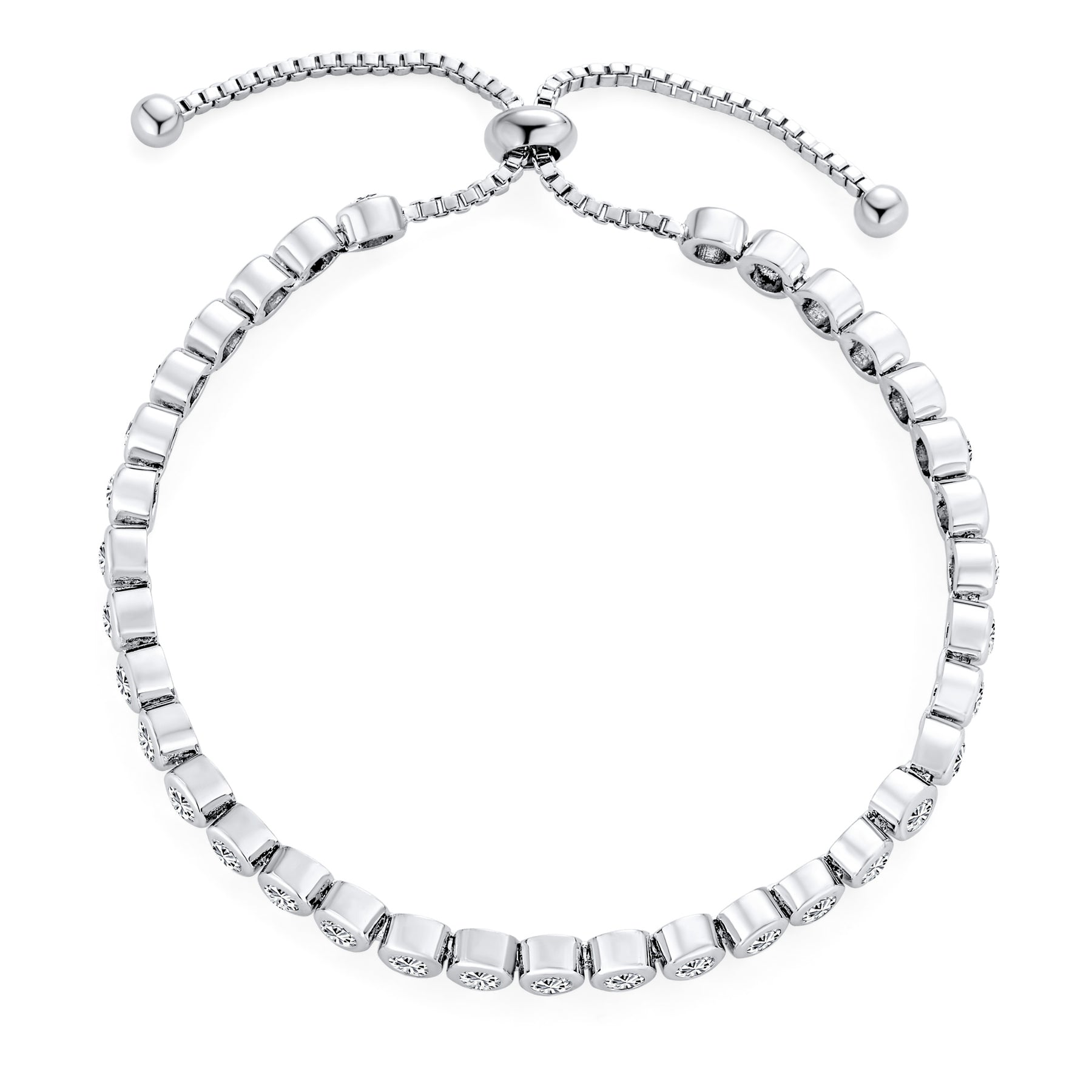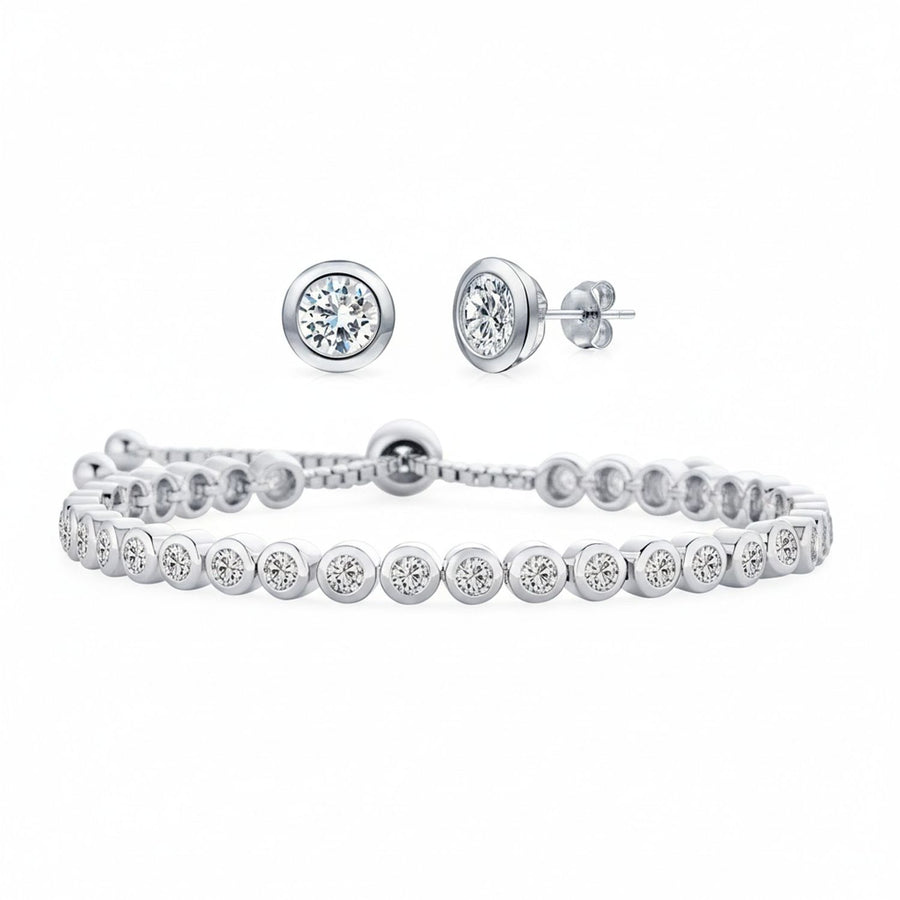 - Add timeless sparkle with this elegant jewelry set featuring a rhodium-plated bubble CZ tennis Bolo bracelet and classic 7mm bezel-set CZ stud earrings. The bracelet dazzles with 34 round-cut stones and an adjustable sliding clasp for a perfect fit, while the sterling silver stud earrings showcase a brilliant round CZ for a sophisticated, versatile look. Perfect for weddings, proms, or gifting, this set combines glamour and everyday elegance.