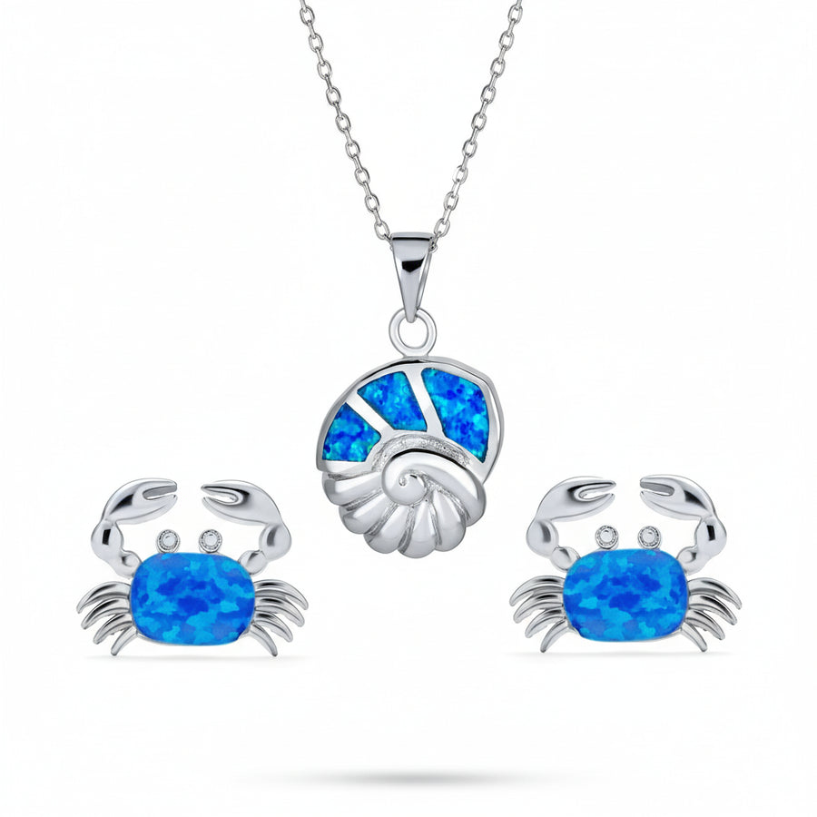 - Bring the beauty of the ocean to your jewelry collection with this enchanting sterling silver set, featuring a large created blue opal nautilus shell pendant necklace and matching crab stud earrings. The pendant showcases iridescent blue opal inlay, capturing the shimmer of the sea, while the crab earrings feature sparkling blue opal bodies for a playful, beach-inspired touch. Crafted from rhodium-plated .925 sterling silver, both pieces offer lasting shine and comfort. Perfect for women and teens, this versatile set makes a thoughtful gift for October birthdays, nautical lovers, or anyone who adores ocean-themed jewelry.