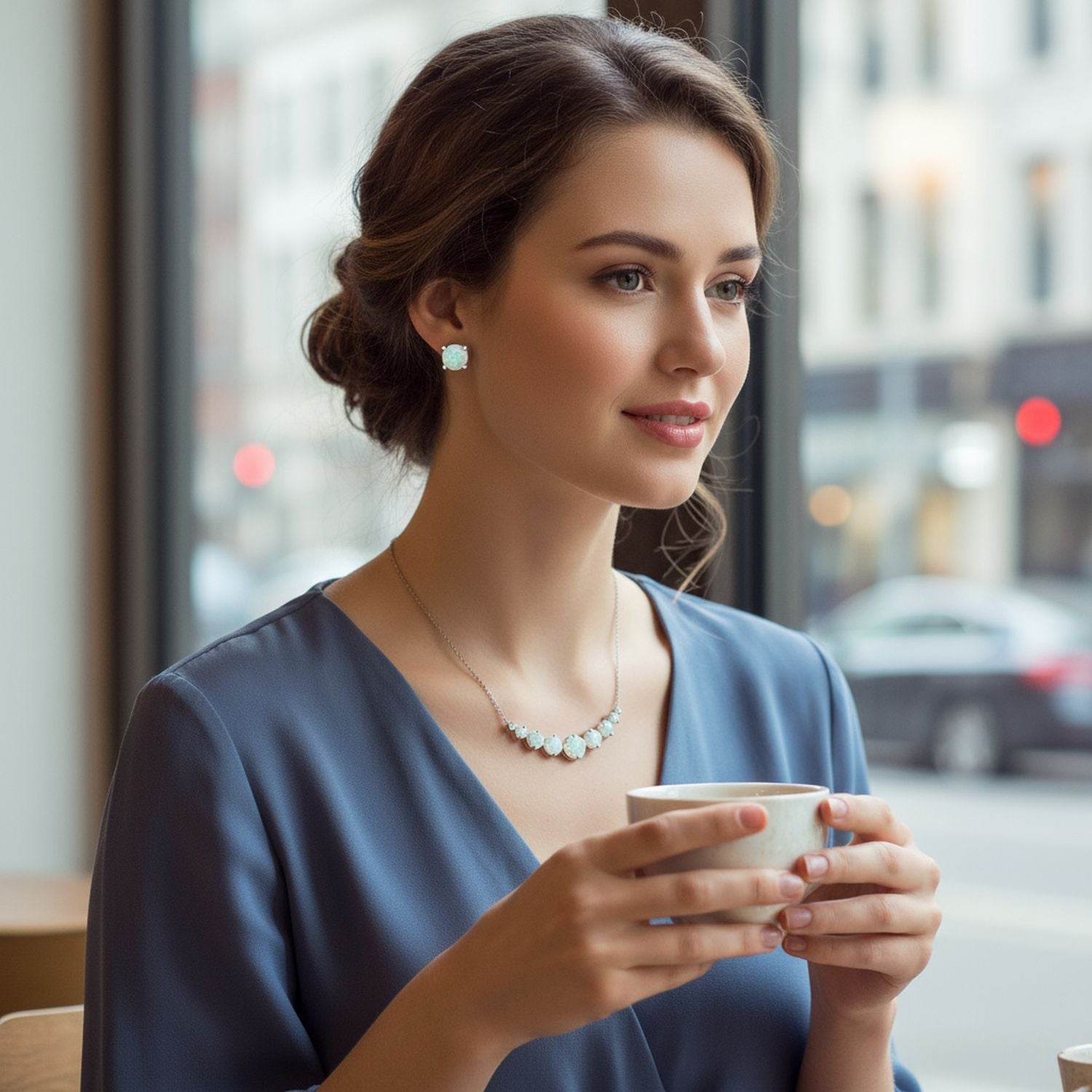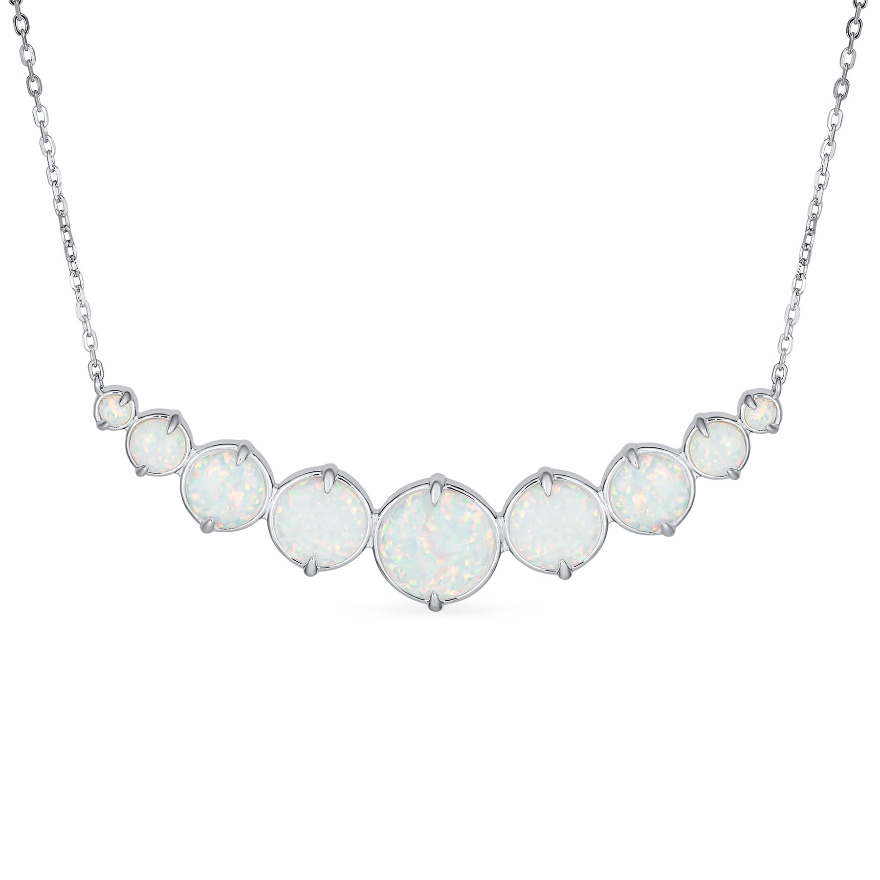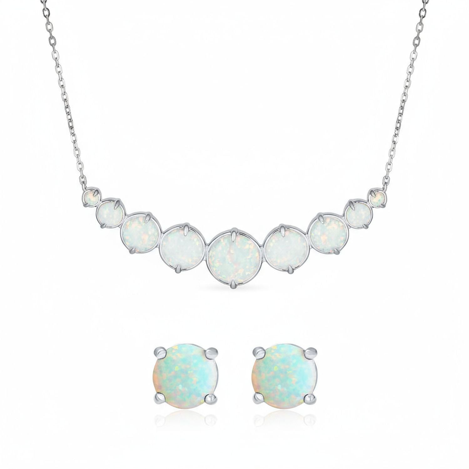 - This elegant jewelry set includes a statement station necklace with 9 opalescent round created opals that change color with the light, paired with matching round created white opal stud earrings. Hypoallergenic, lead-free, nickel-free, and stamped .925 for quality craftsmanship, this versatile set complements any outfit, from office attire to evening wear, making it a perfect gift for anyone with pierced ears.