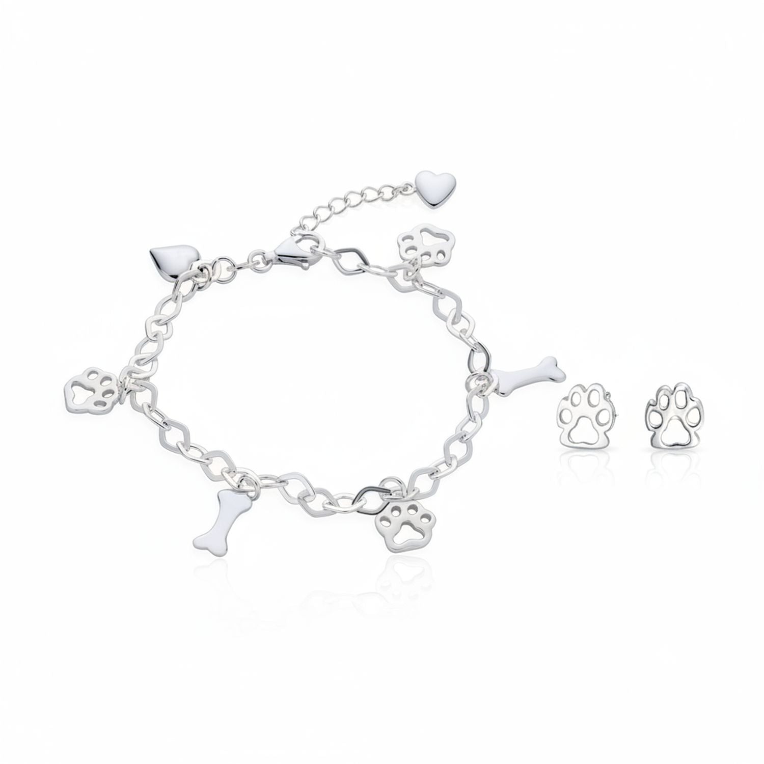 - Show your love for furry friends with this playful sterling silver set. The link bracelet features hearts, dog bones, and cutout paw prints, while the matching stud earrings showcase charming paw details. Perfect for dog lovers, this cute and stylish set adds a touch of whimsy to any outfit and makes a delightful gift.