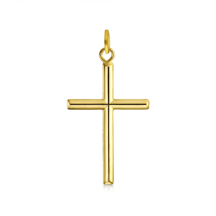 - Style and spirituality merge in this mirror-finish gold cross pendant. Solid 14K yellow gold shines brilliantly, resisting scratches and tarnish. Naturally hypoallergenic, it's safe for sensitive skin. Wear this classic cross to showcase your devotion and style.