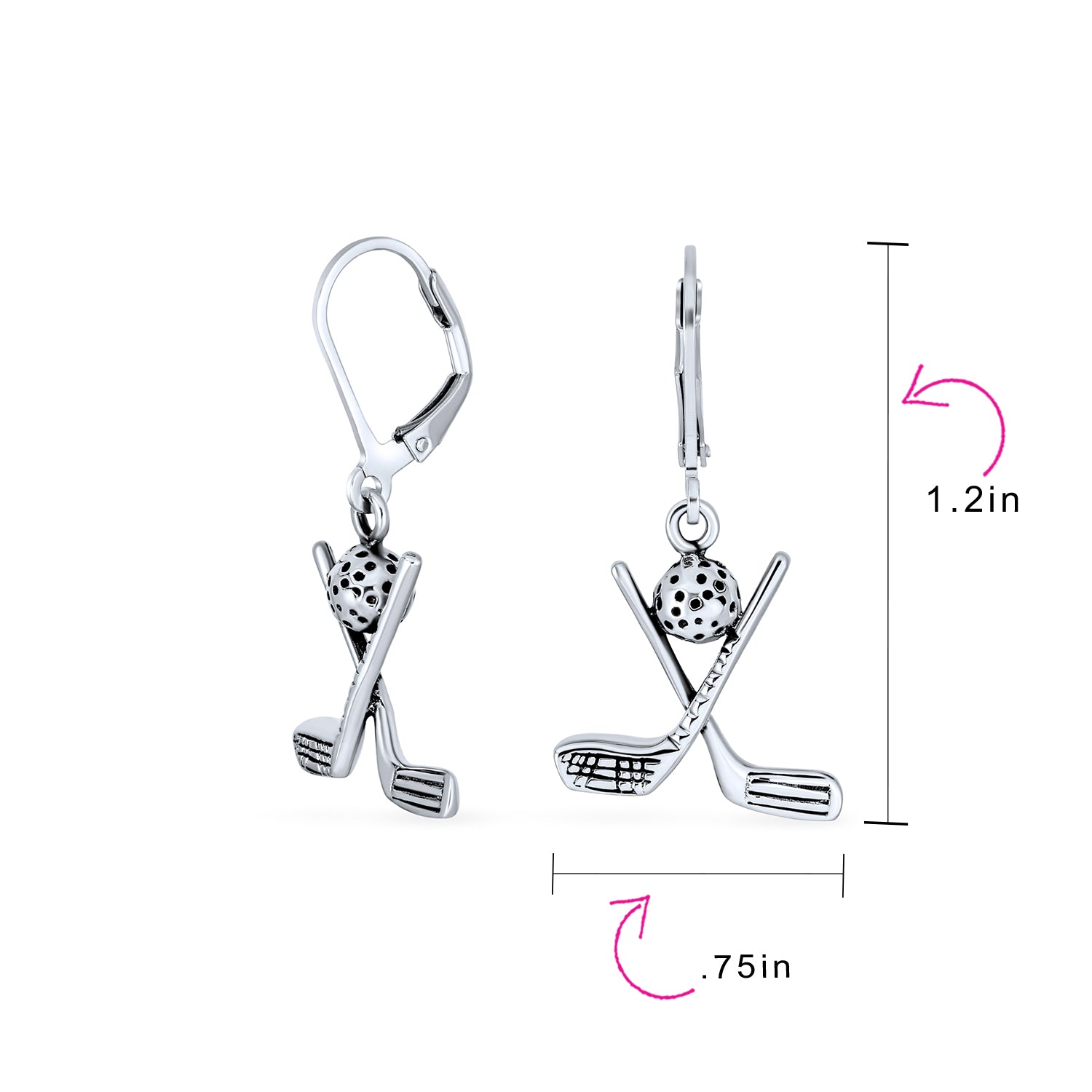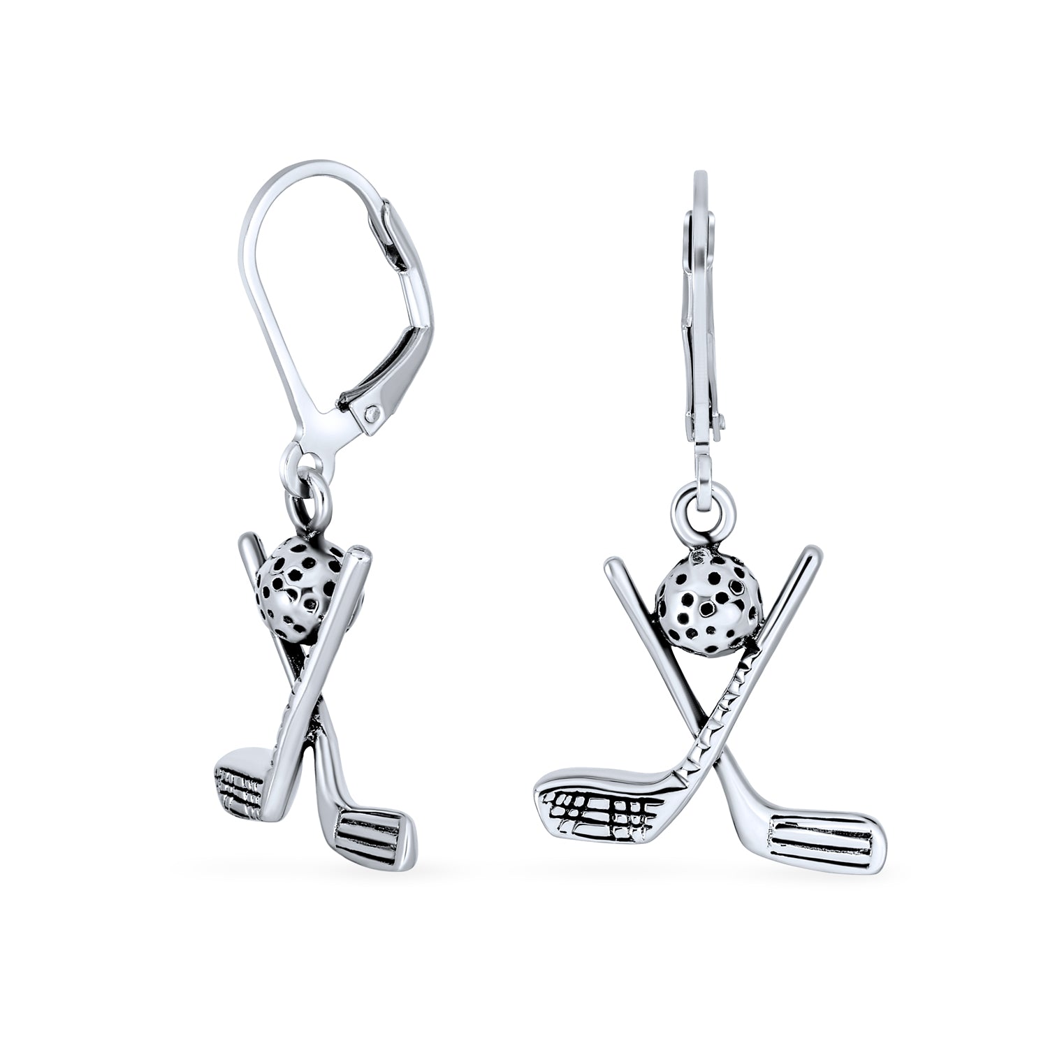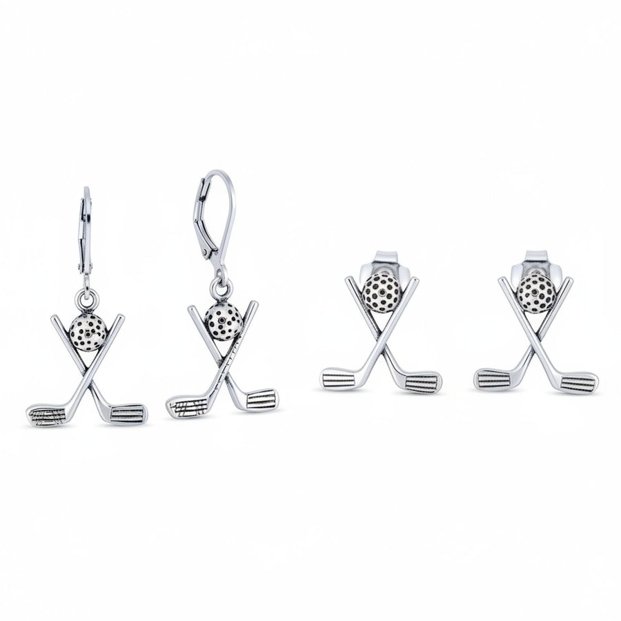 - This sterling silver earring set includes a pair of oxidized drop earrings with crisscrossed golf clubs and dangling golf balls, along with coordinating stud earrings featuring a classic golf ball motif. Both designs showcase attention to detail and provide a chic, sporty look for golf enthusiasts of all ages.