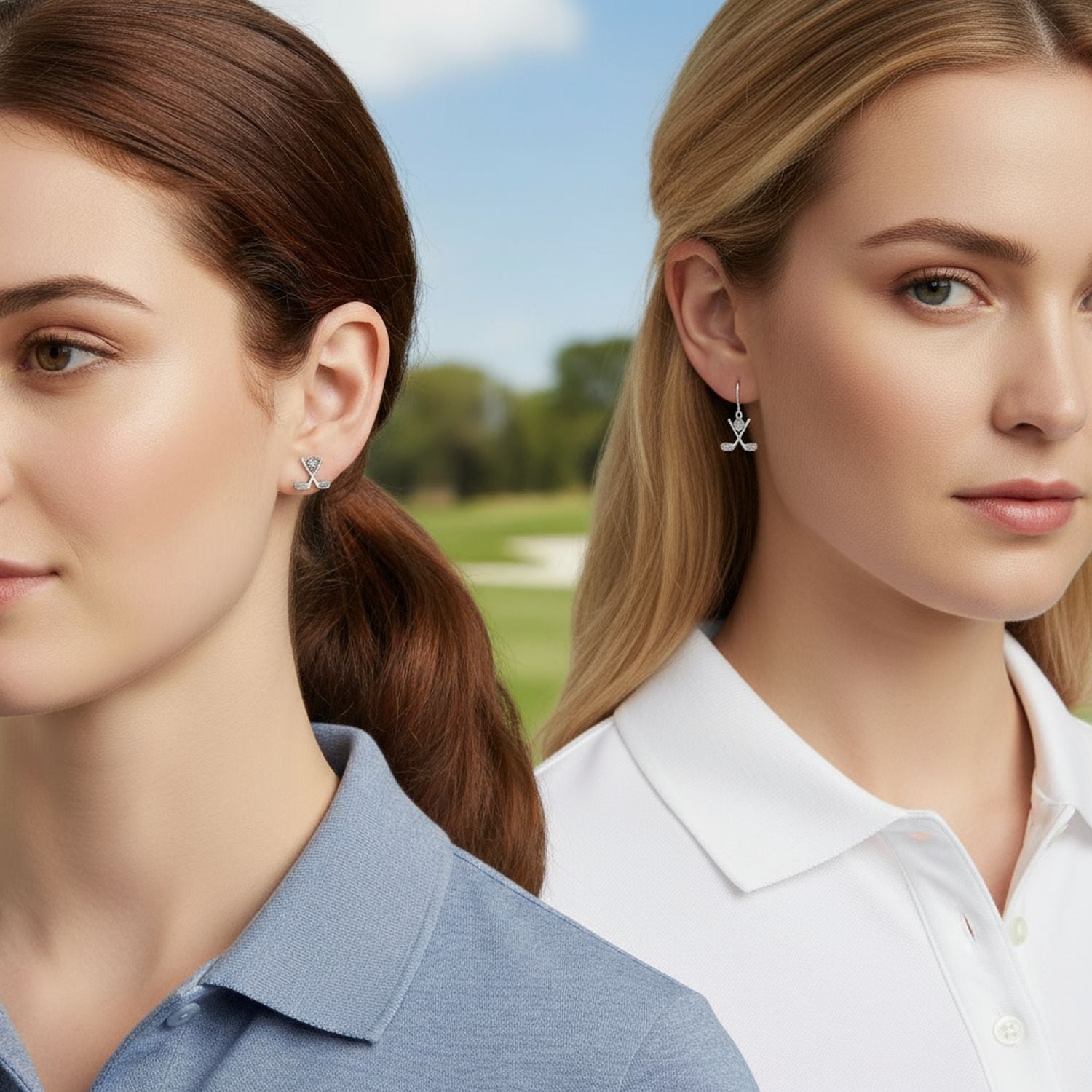 - Celebrate your love of golf with this stylish set of two sterling silver earrings, perfect for women golfers and sports enthusiasts. The set features a pair of oxidized drop earrings with crisscrossed golf clubs and dangling golf balls, paired with matching stud earrings showcasing a classic golf ball design. Crafted from high-quality .925 sterling silver, both styles offer lasting shine, comfort, and lightweight wear. Whether on the course, at a golf event, or as a thoughtful gift for Mother’s Day, birthdays, or any golf lover, this versatile earring set combines fashion and sport in a charming, wearable design.