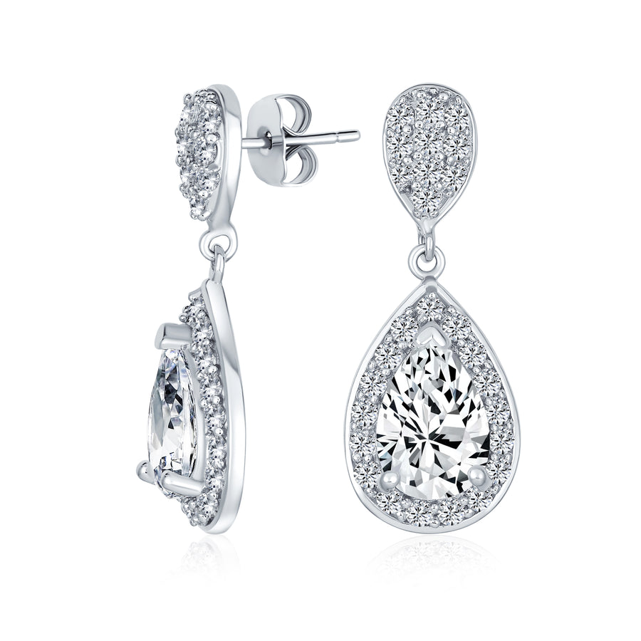 - Embrace your inner princess with our stunning pave cz bridal teardrop earrings. Mesmerizing rhodium plated sterling silver dangle earrings will give any diva a chic sparkling look. Perfect for bridal jewelry earrings or as birthstone gifts, our cubic zirconia double teardrop earrings will prove the perfect addition to any jewelry box.