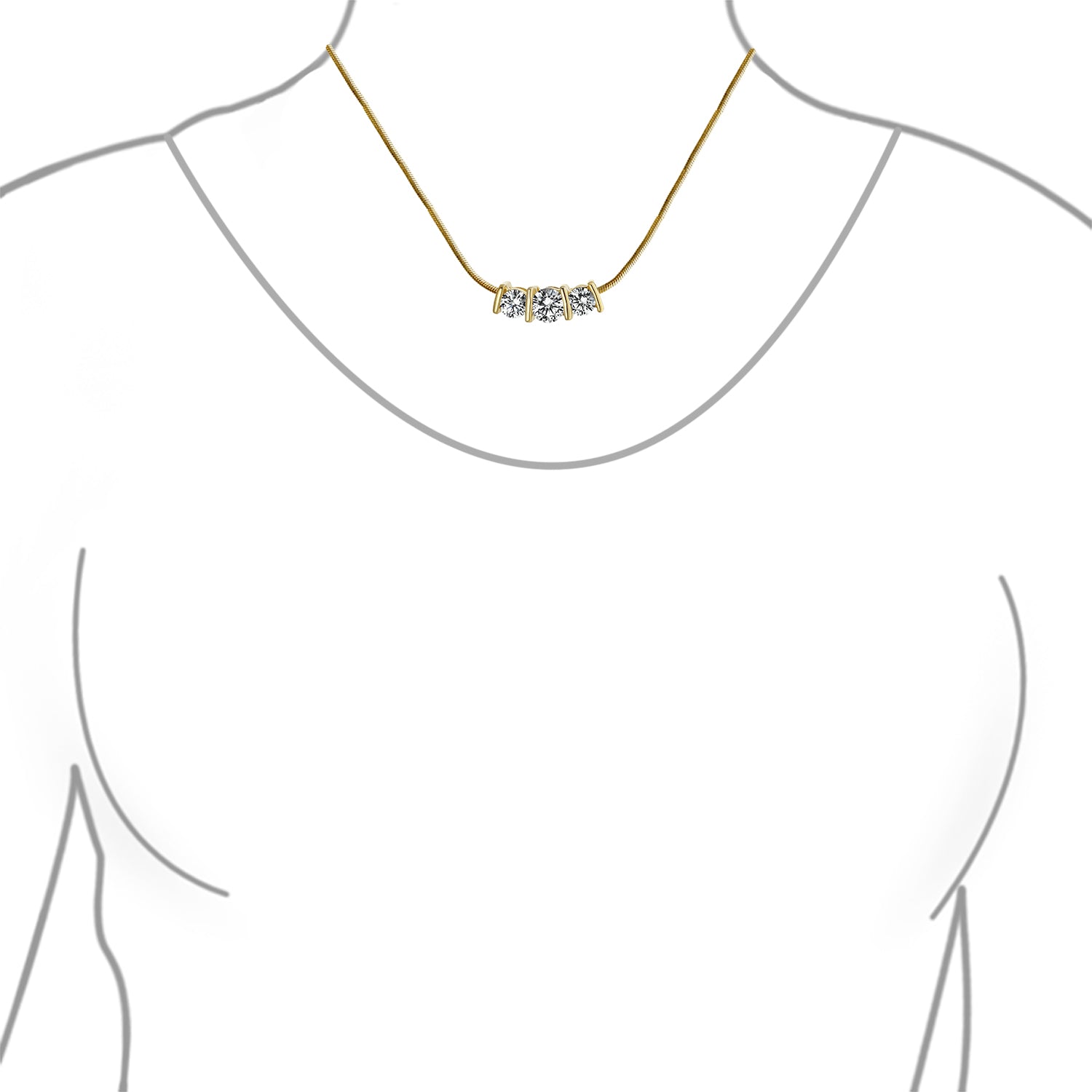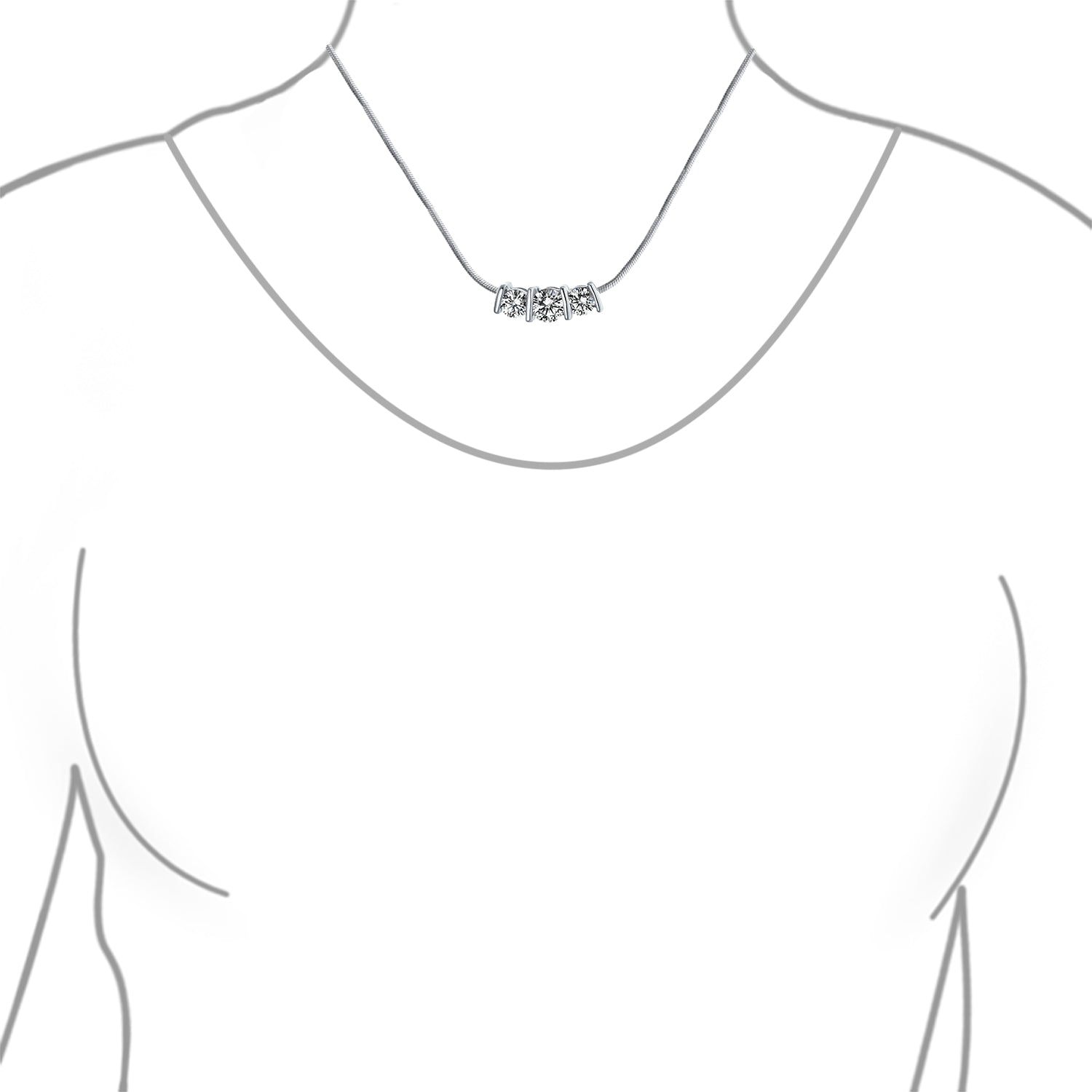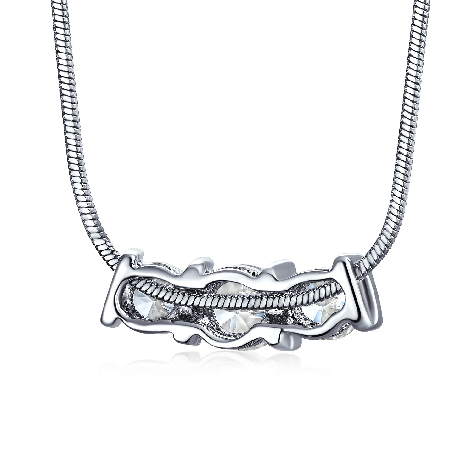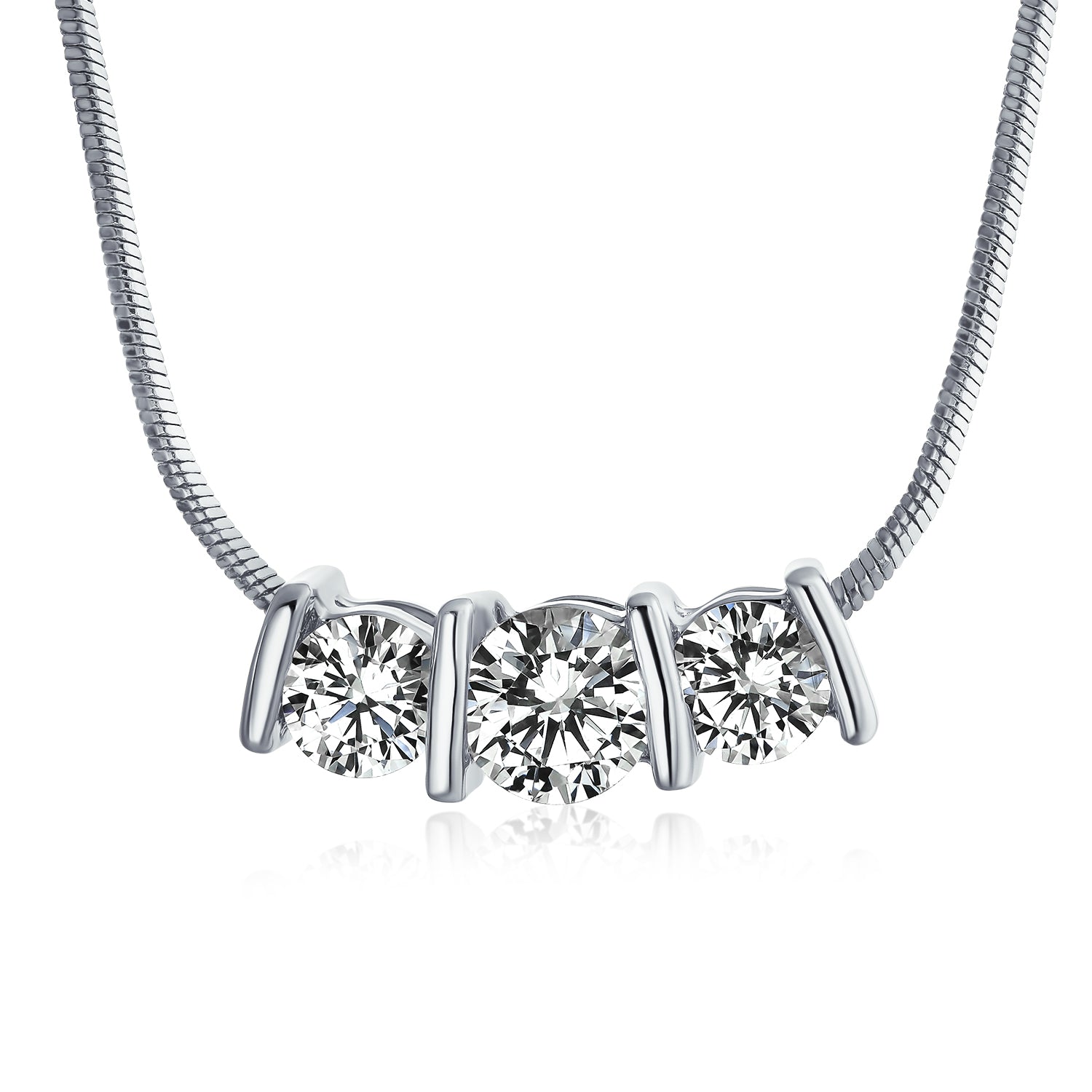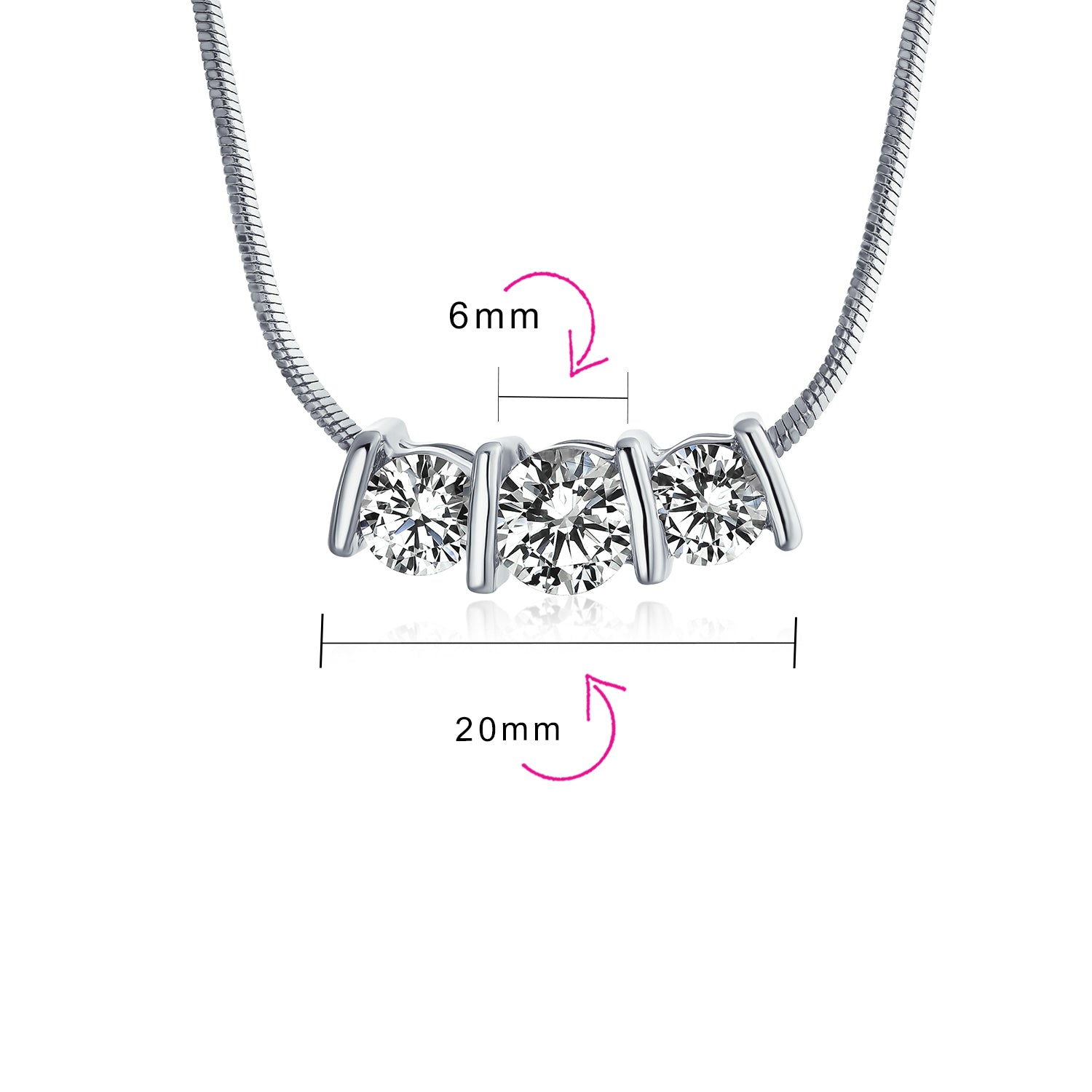 - This chic rhodium-plated brass necklace features three glistening CZ stones, creating a classic yet contemporary look. The pendant hangs from a delicate silver-tone snake chain. The center 6mm stone is flanked by two 5mm CZ stones for extra sparkle. Perfect for both casual and formal wear.