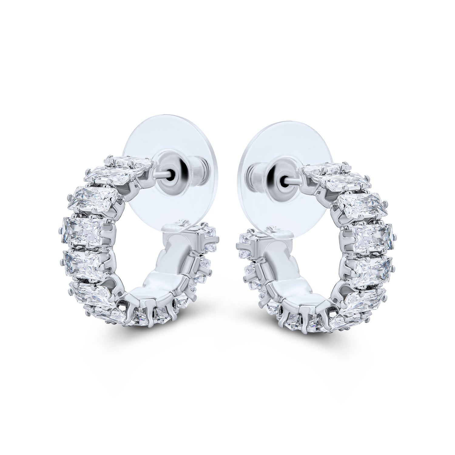 - These stunning bridal hoop earrings are affordable luxury. Rhodium plated with sparkling cubic zirconia rectangles, they exude elegance. Post back closures ensure secure wear, making these silver-toned earrings a must-have for any occasion.