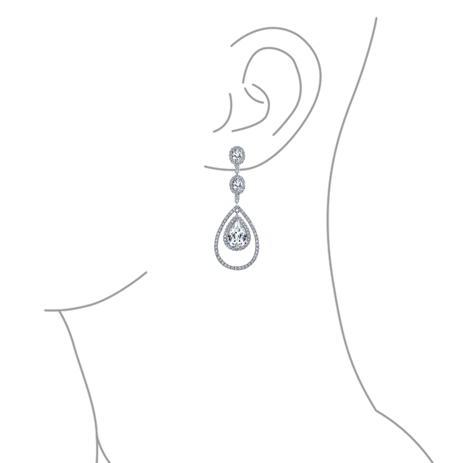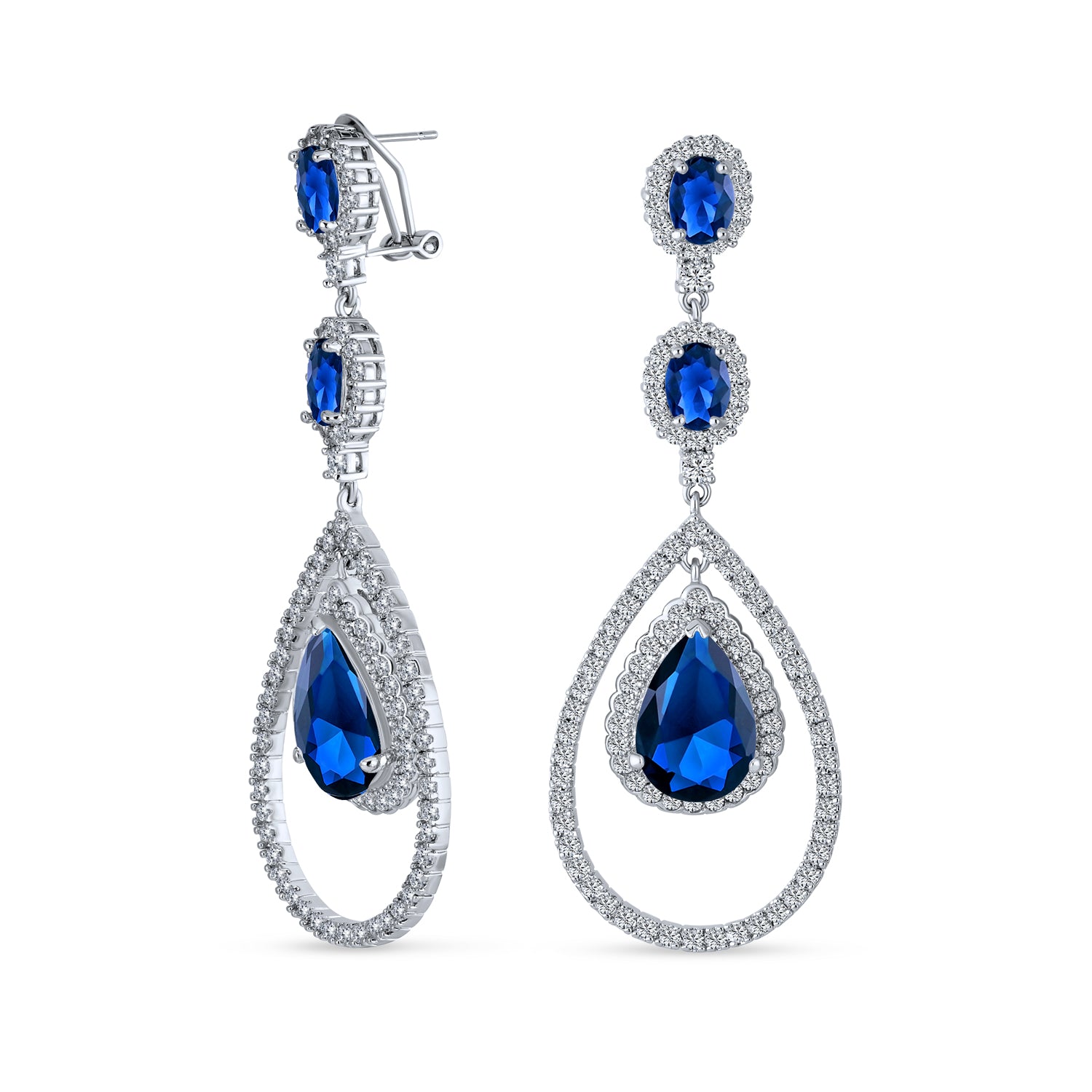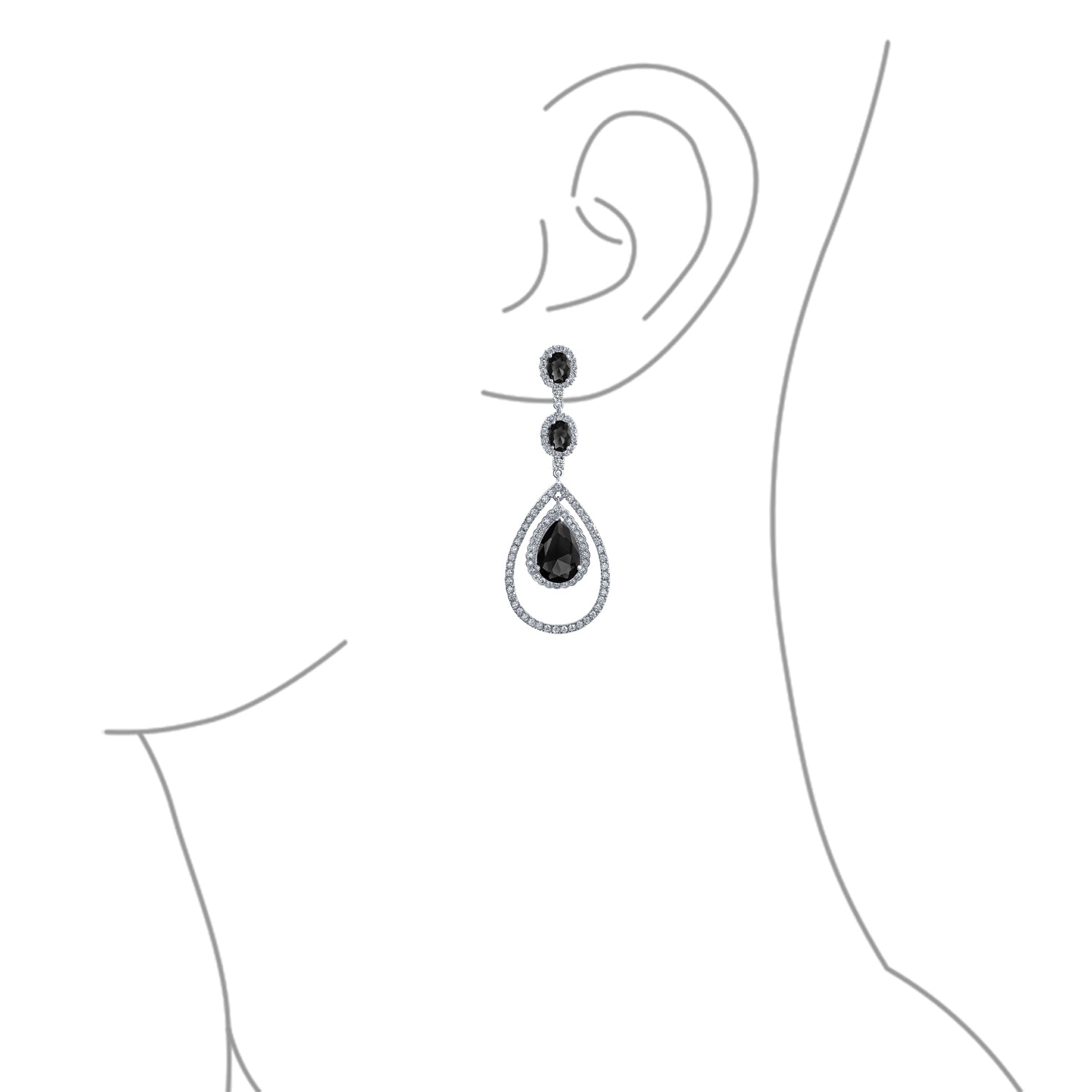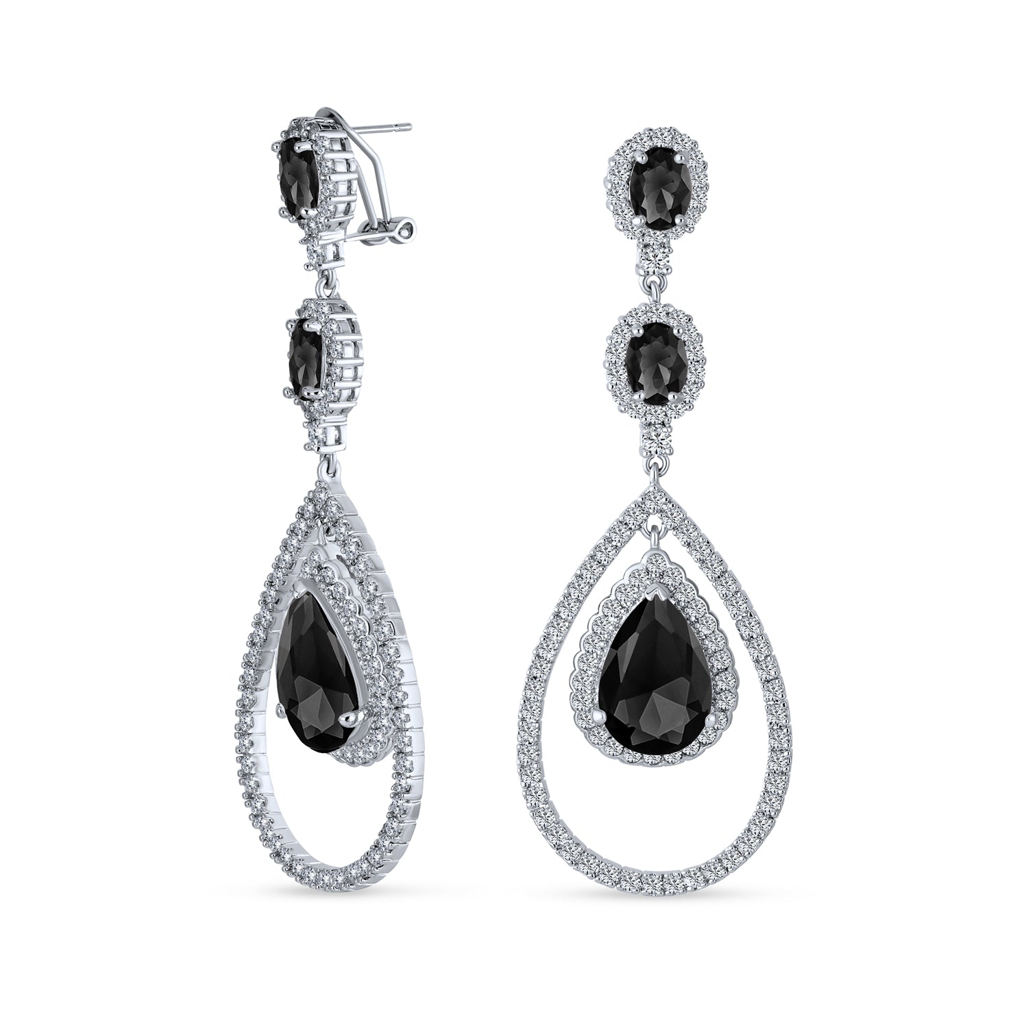 - Secure Omega back clip for stabilizing earring. Formal special occasion big long elegant AAA cubic zirconia Art Deco halo dangling evening earrings with large pear shape czs center drops is prefect for glam, cocktail, holiday or bridal party. Comes in many simulated black onyx birthstones colors.