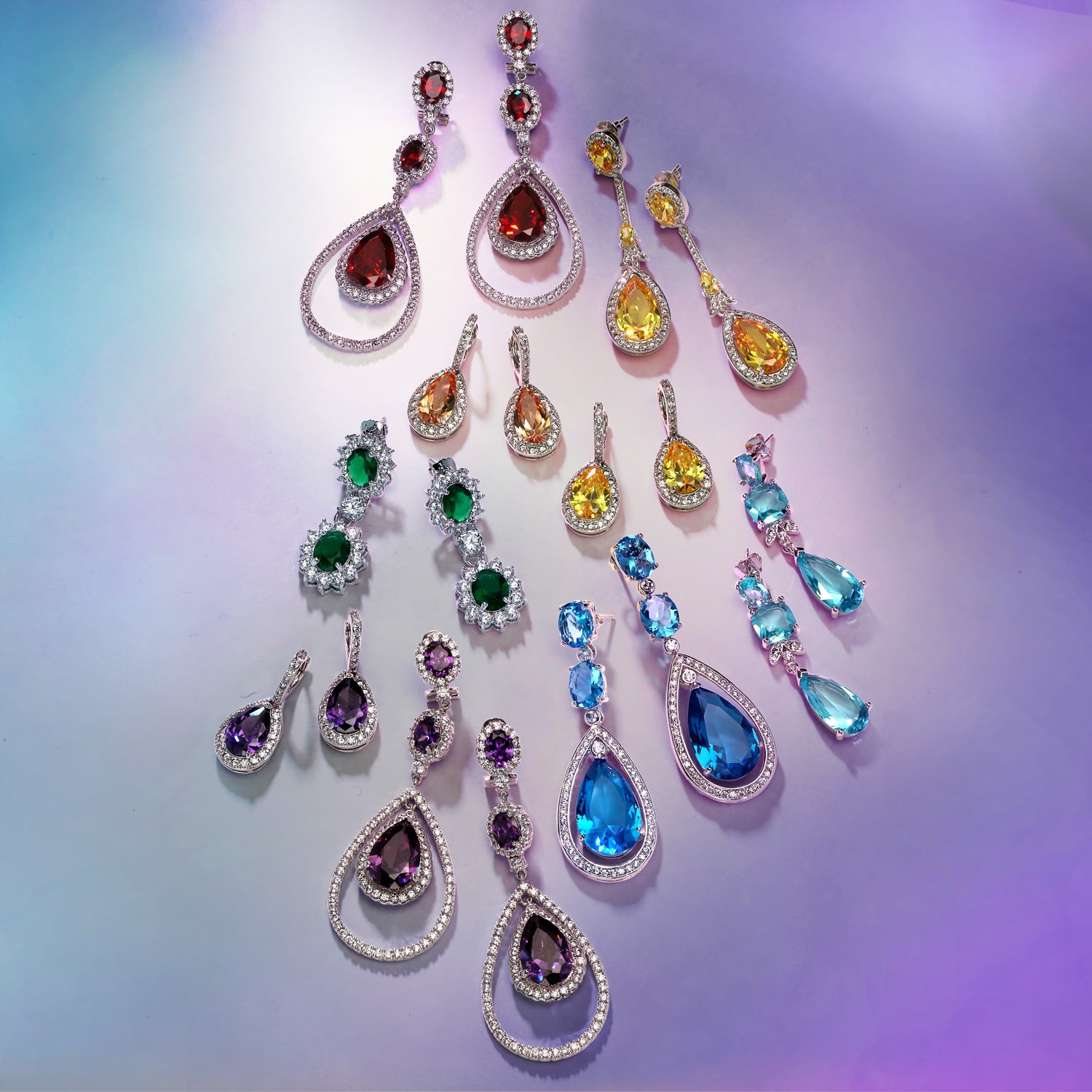 - Indulge in a royal look with these purple Simulated Amethyst chandelier drop earrings. Fit for a Queen, these earrings are stunning. Featuring triple Simulated Amethyst stones, they are beguiling and alluring. Two oval stones crowned in Cubic Zirconia drop to a larger pear-shaped stone. The open design ensures they sparkle and shine like the real thing. Made of high-quality brass and silver-plated for extra shine. Secure post back ensures comfort and security. Perfect for weddings, bridal parties, and February birthdays. Get your own gorgeous Simulated Amethyst chandelier drop earrings today. For pierced ears only.