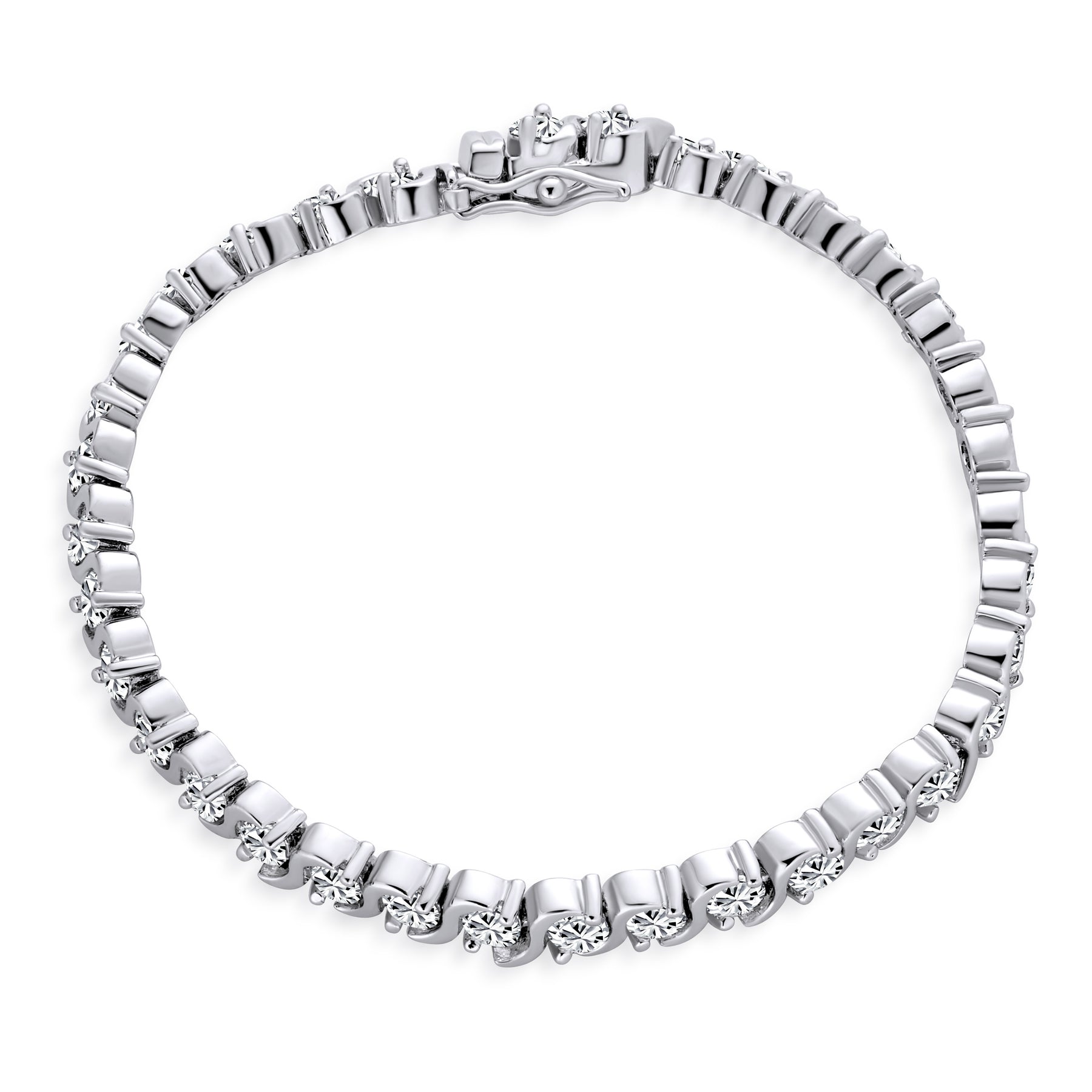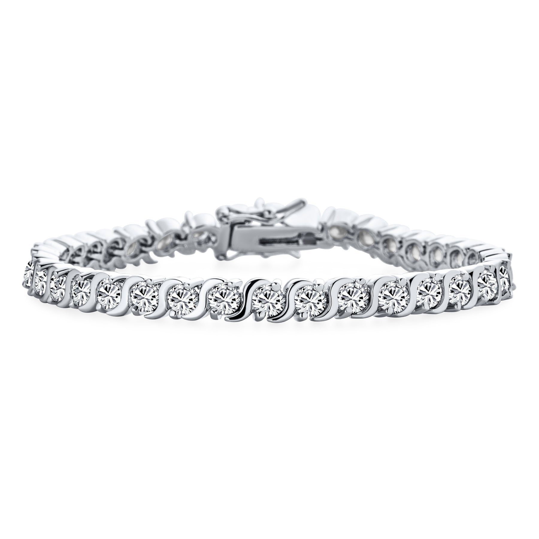 - Shine in our Silver Classic CZ Tennis Bracelet, featuring high-polished silver and clear cubic zirconia stones. Feel like royalty. This elegant, affordable bracelet has a unique silver wave design between CZs. Perfect for bridal parties and holiday gifts. Secure with a chic box, tongue, and safety clasp. A lovely link chain adds classic style. Ideal for Mother's Day gifts.
