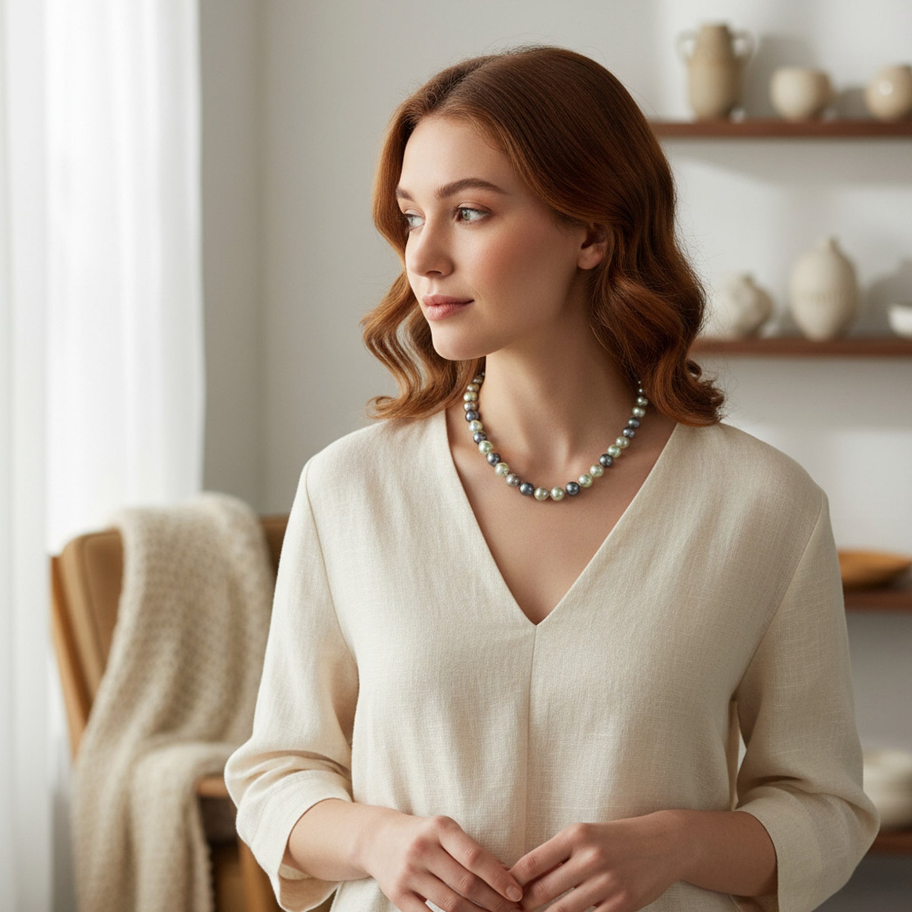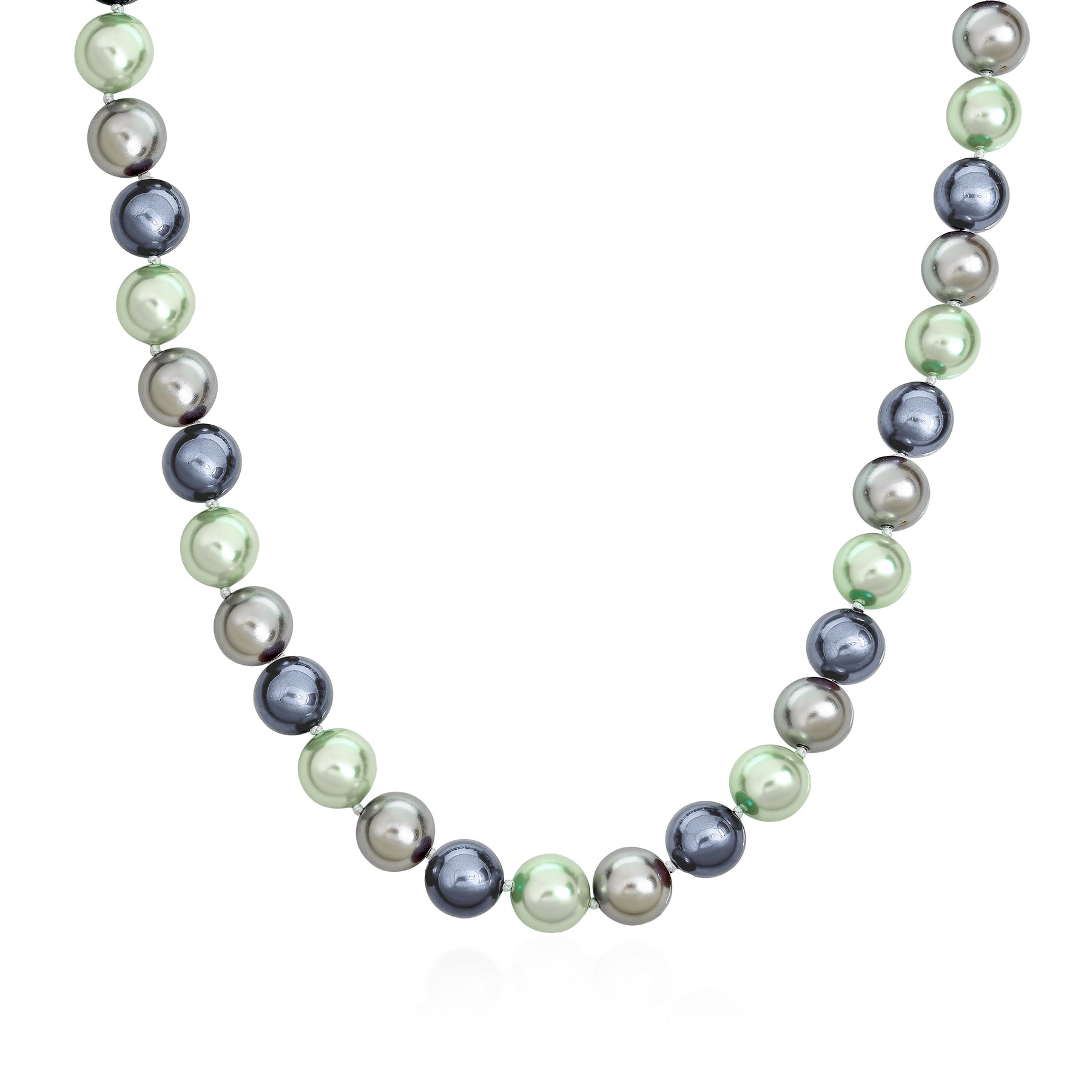 - Get a classic look with some modern color. Our large pearl necklace is a gorgeous strand of pale blue, navy, and classic white Simulated Pearls that connect with a gleaming clasp. Despite the distinct look that the substantial 14 millimeter Simulated Pearls bring to our pearl jewelry, this is still a piece that can work with all sorts of looks. Let a chunky pearl necklace add the perfect amount of sass to your office style. Or, pair it with a glamorous gown or cocktail dress for a big event, and to go a traditional route with an untraditional accessory. A multicolor pearl necklace in these shades even works as bridal jewelry if you are looking for your something blue. So wherever you plan to wear it, get this piece today and start offering up your own pearls of fashion wisdom.