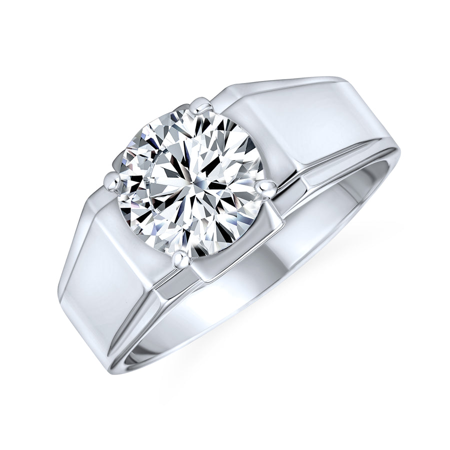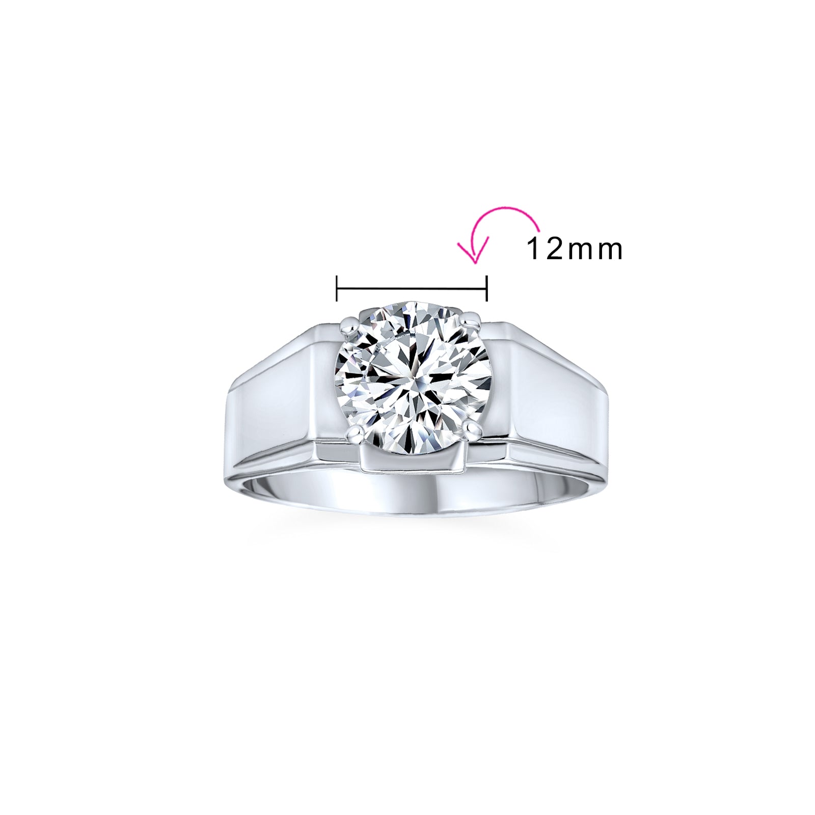 - Make a bold statement with this stunning 6 carat round CZ men's engagement ring. The wrap-around design leads to a four-prong solitaire setting, showcasing a large radiant cubic zirconium. Finished with rhodium plating for a polished look and tarnish resistance, this ring is perfect for those looking for a modern and stylish piece. Ideal for same-sex couples or bold females looking to take charge of their proposal, this ring can be personalized with engraving to add a special touch. Show him you care with this unique and eye-catching ring.