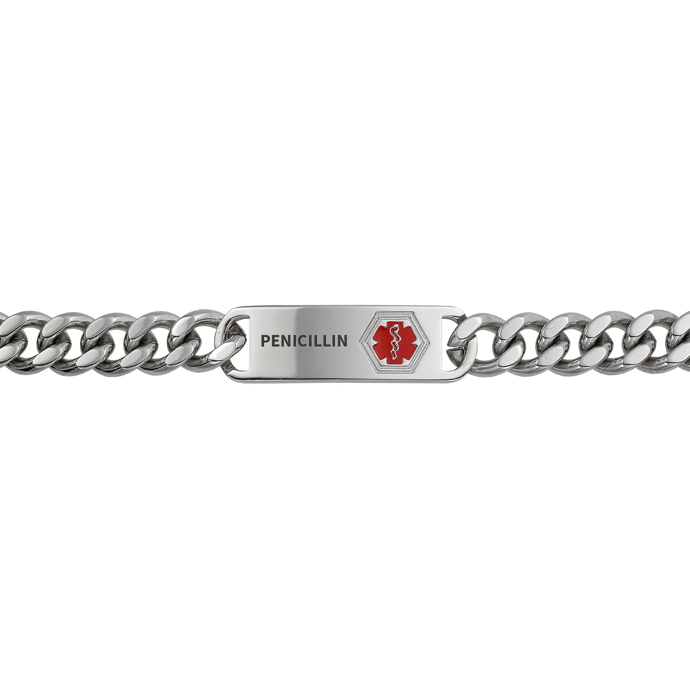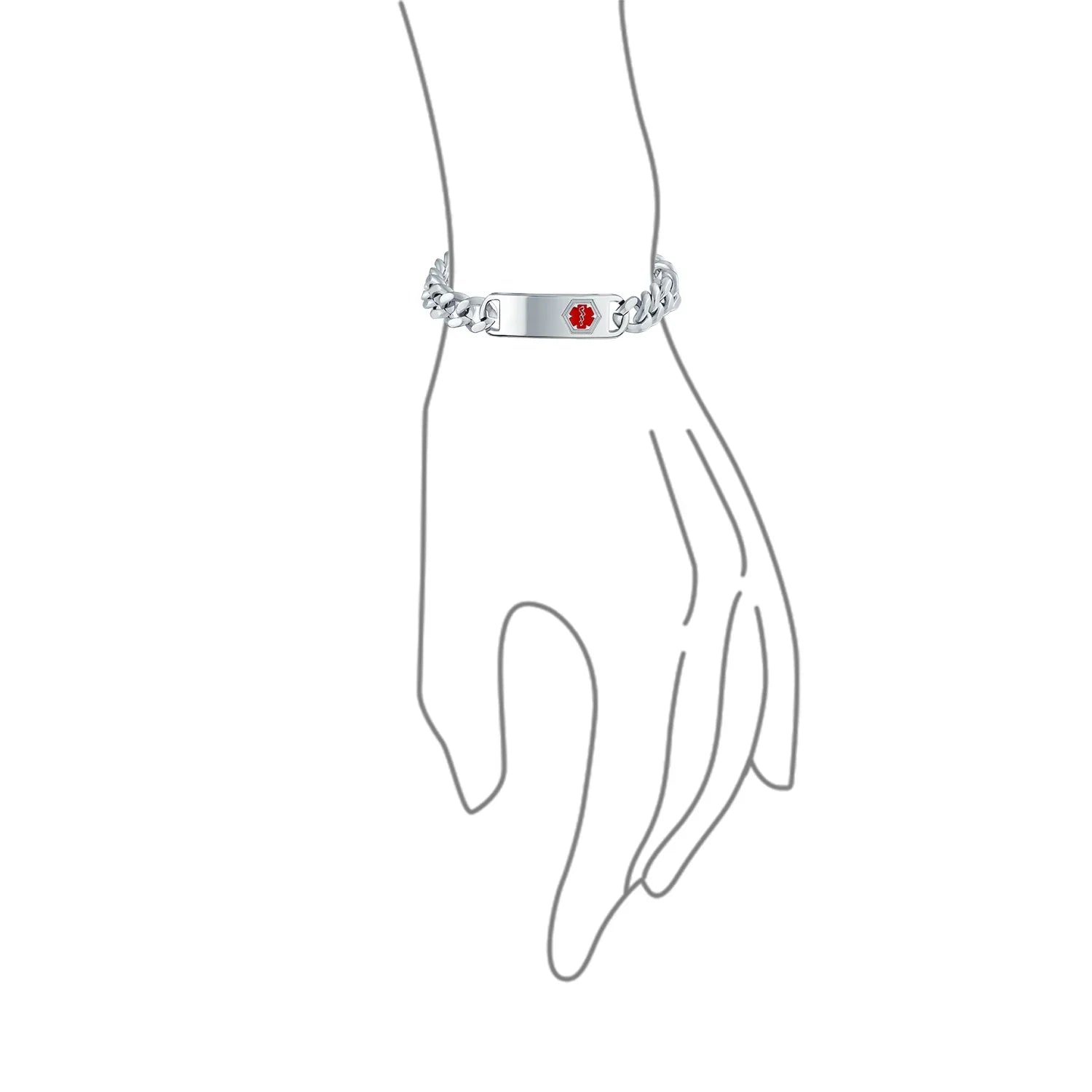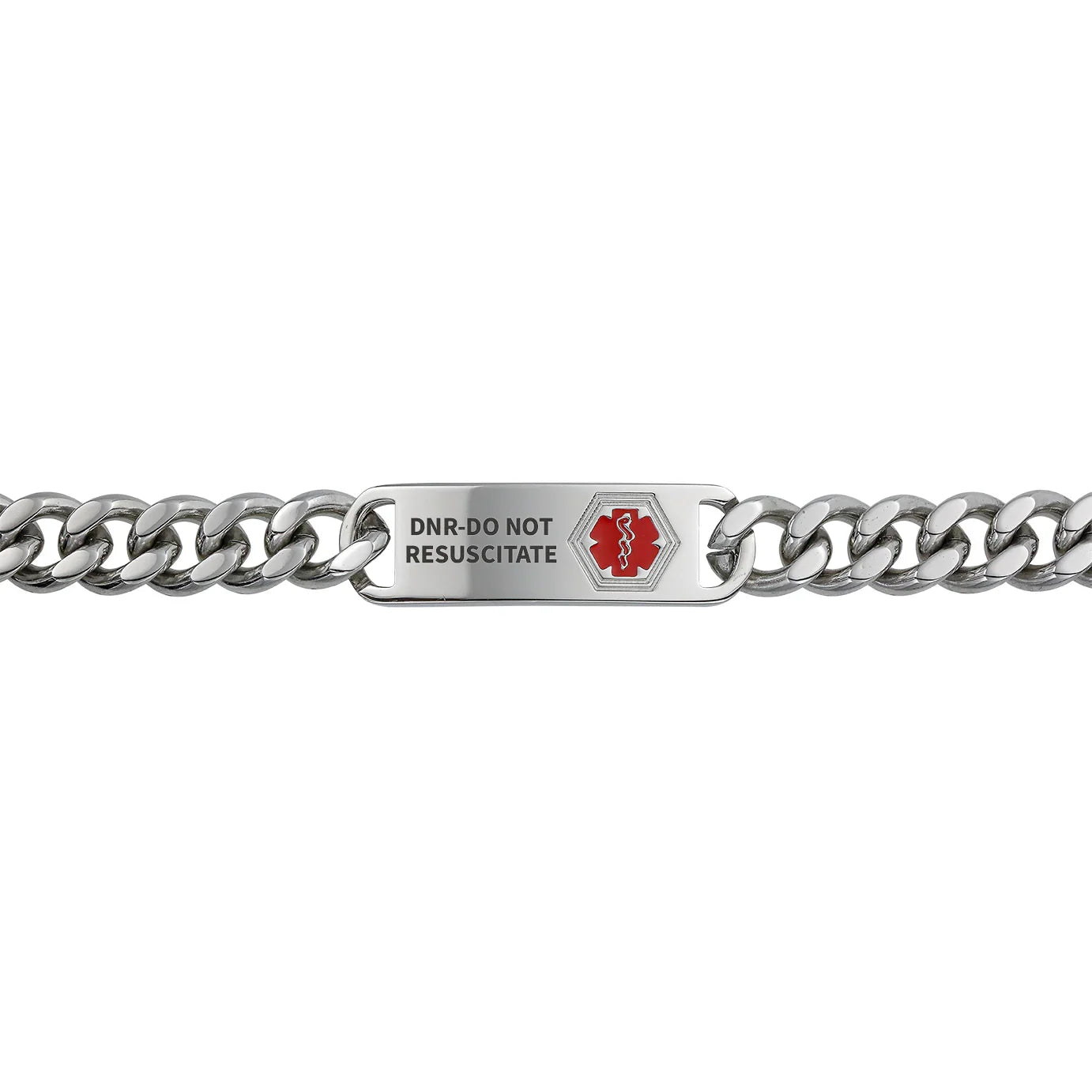 • Material: Stainless Steel, HYPOALLERGENIC lead-free, non-fading, non-rusting, non-green, Non-irritating to Skins., Secure and convenient fold over clasp for easy and reliable closure. Measure: 8.5 Inch Length, 0.5 Inch Wide, Name Plate ID Bar 1