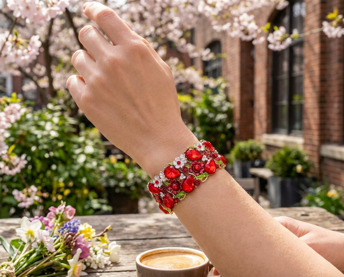 - Adore red? Our statement jewelry is perfect for you. Featuring red Simulated Garnet stones, pink and red flowers, and green leaves. Sparkling red crystals adorn the flowers. Slightly pliable for a comfortable fit on various wrist sizes. Ideal for January birthdays, this simulated garnet CZ bracelet is exquisite. Perfect for Mother's Day, paired with a bouquet of red flowers.