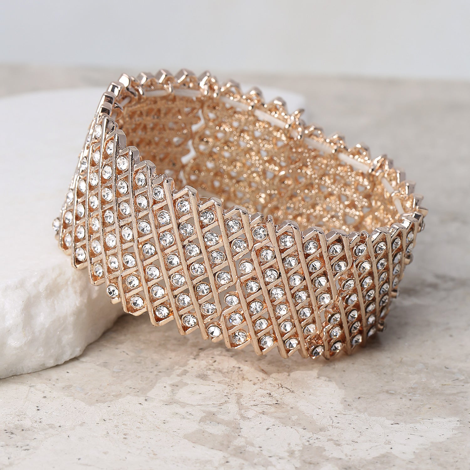- Adjustable Stretch Bracelet for cocktail party is studded with dazzling crystals in gold, rose gold, silver, iridescent aurora borealis for an eye-catching sparkle with every movement, creating a dramatic look.