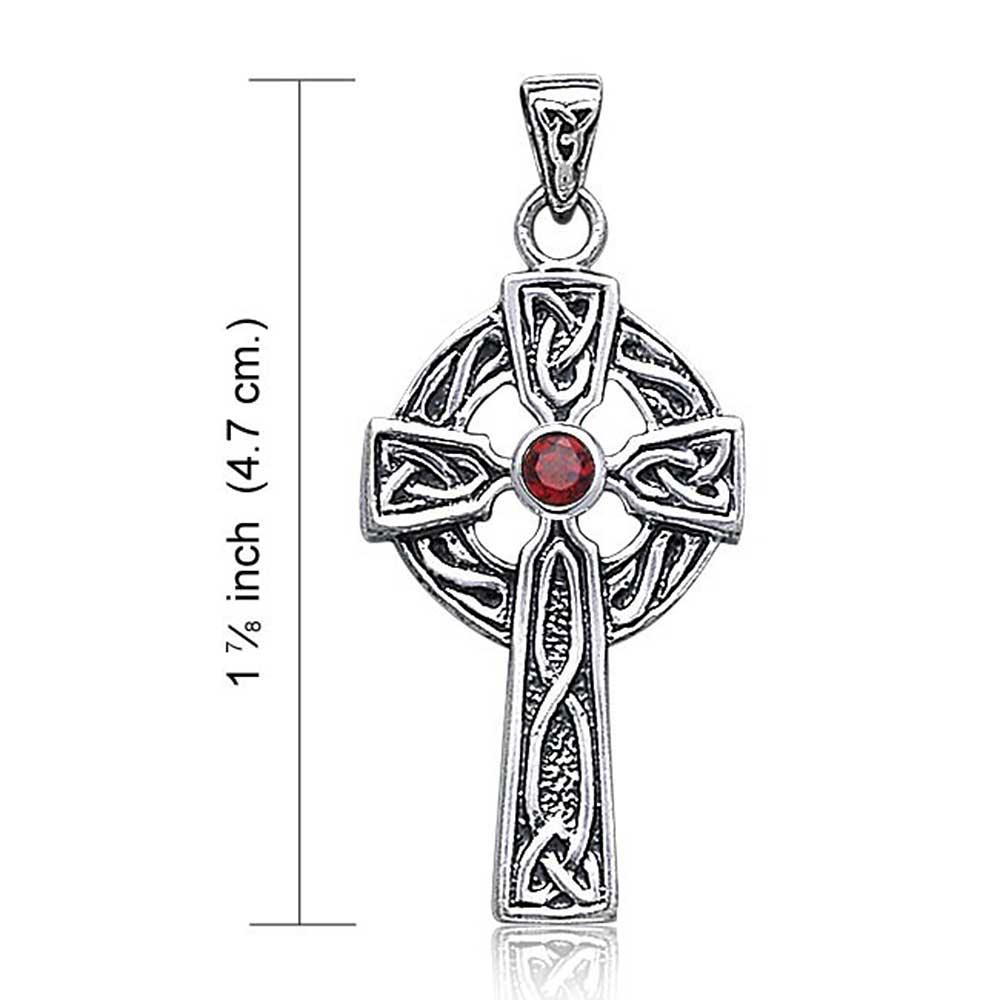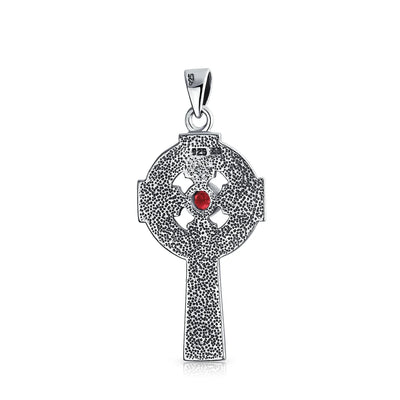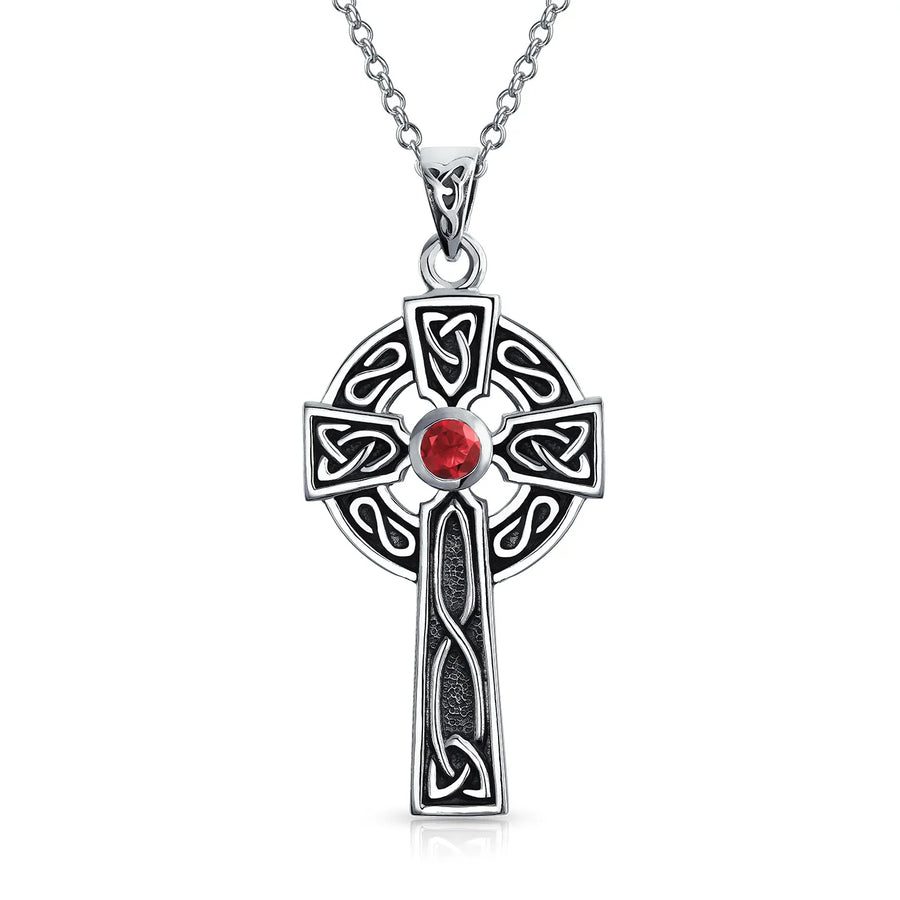 • Antique-style Celtic infinity cross featuring an intricate open design in blackened sterling silver, exuding old-world romance. Enhanced with a red CZ center, representing the January birthstone, it's a perfect addition to our Celtic jewelry collection.