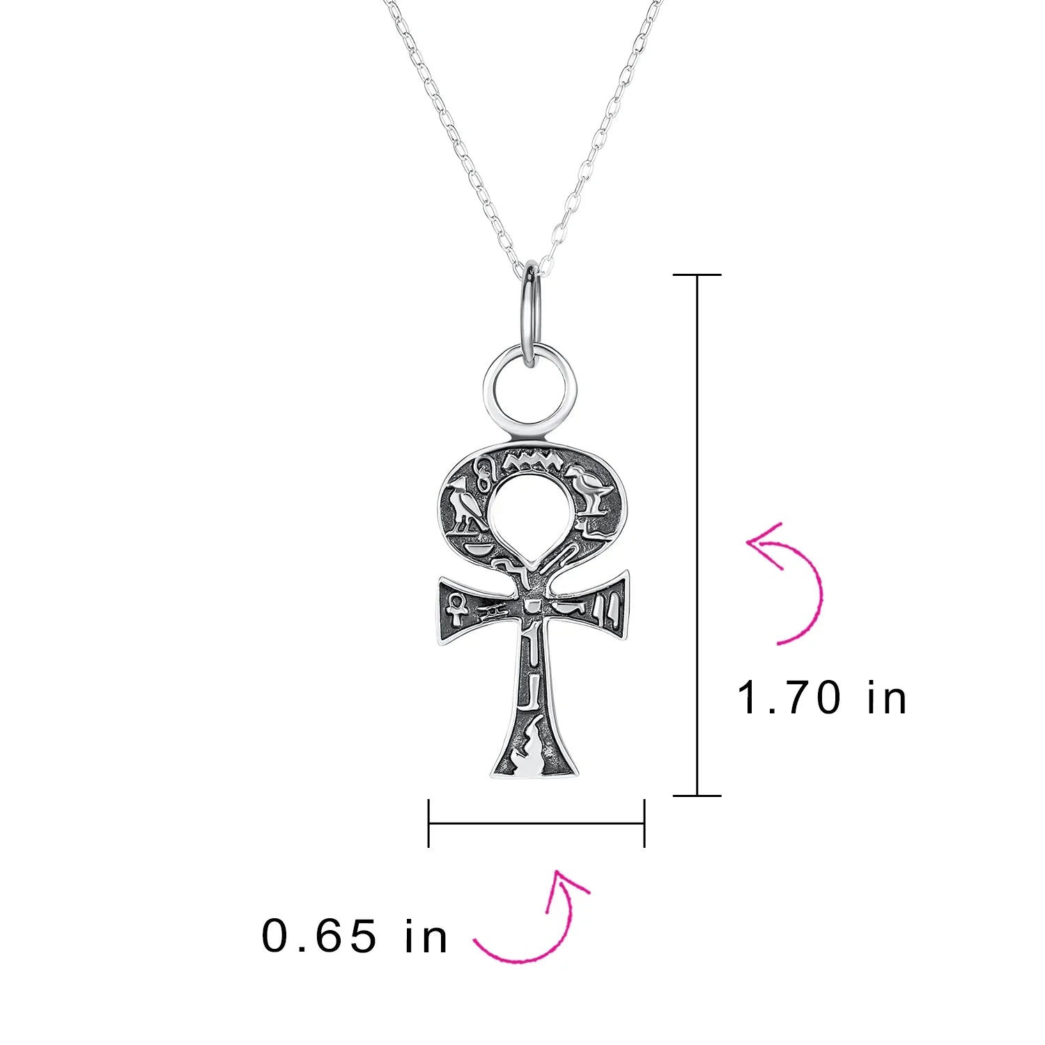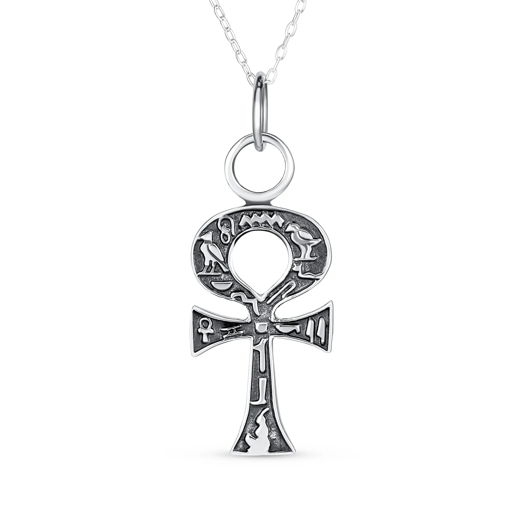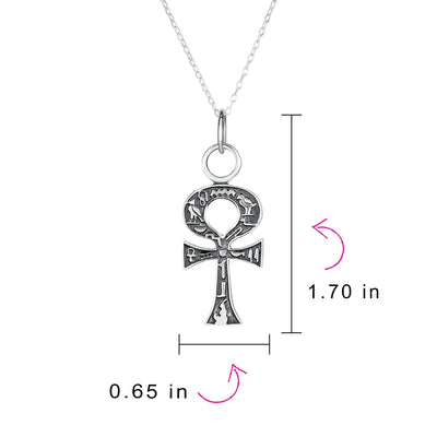 - Discover our exquisite .925 Silver Ankh Cross Pendant, symbolizing eternal life from ancient Egyptian culture. Crafted from high-quality .925 Sterling Silver, it features a stunning Antique Style finish. Explore intricate hieroglyphics, including water, reeds, textiles, a basket, a vulture, and a quail. Perfect for those who appreciate ancient cultures and seek spiritual or exotic accessories. This elegant and meaningful ankh cross pendant is a remarkable treasure. Comes with an 18 Inch rolo chain for a complete and stylish look.
