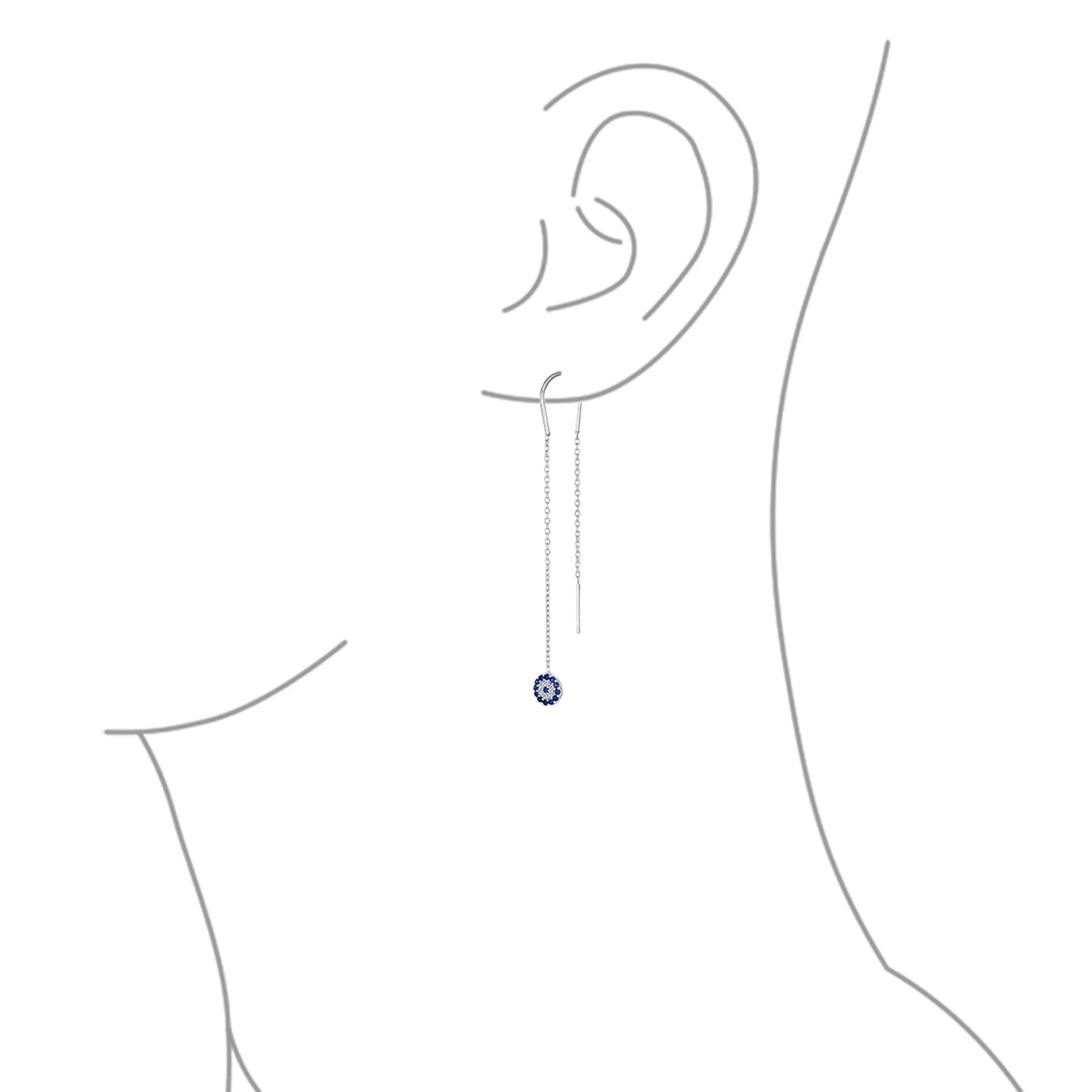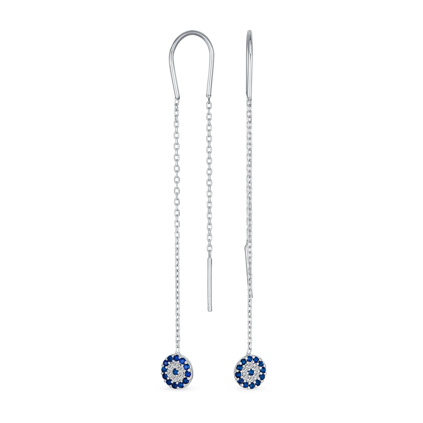 - Our CZ Threader dangle earrings feature a sleek silhouette with a CZ round medallion resembling an evil eye. These long chain earrings add a modern touch to any outfit. Simulated sapphire CZs frame her face beautifully. Style these sterling silver earrings with updos to keep evil spirits away.