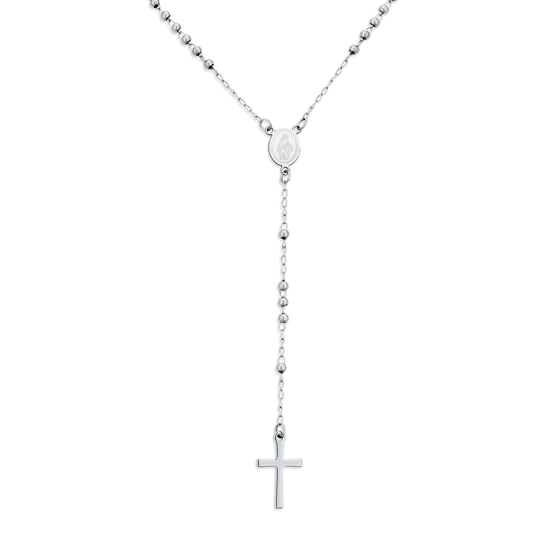 - Our Christian beaded rosary necklace is lightweight and easy to wear. It secures with a lobster claw clasp. Featuring a depiction of the Virgin Mary, this timeless piece suits women of all ages. Perfect as Christmas or Easter jewelry. Ideal for those who cherish religious necklaces. Show your faith with our modern, silver-toned stainless steel rosary beads. Cross jewelry and rosaries are always classic.