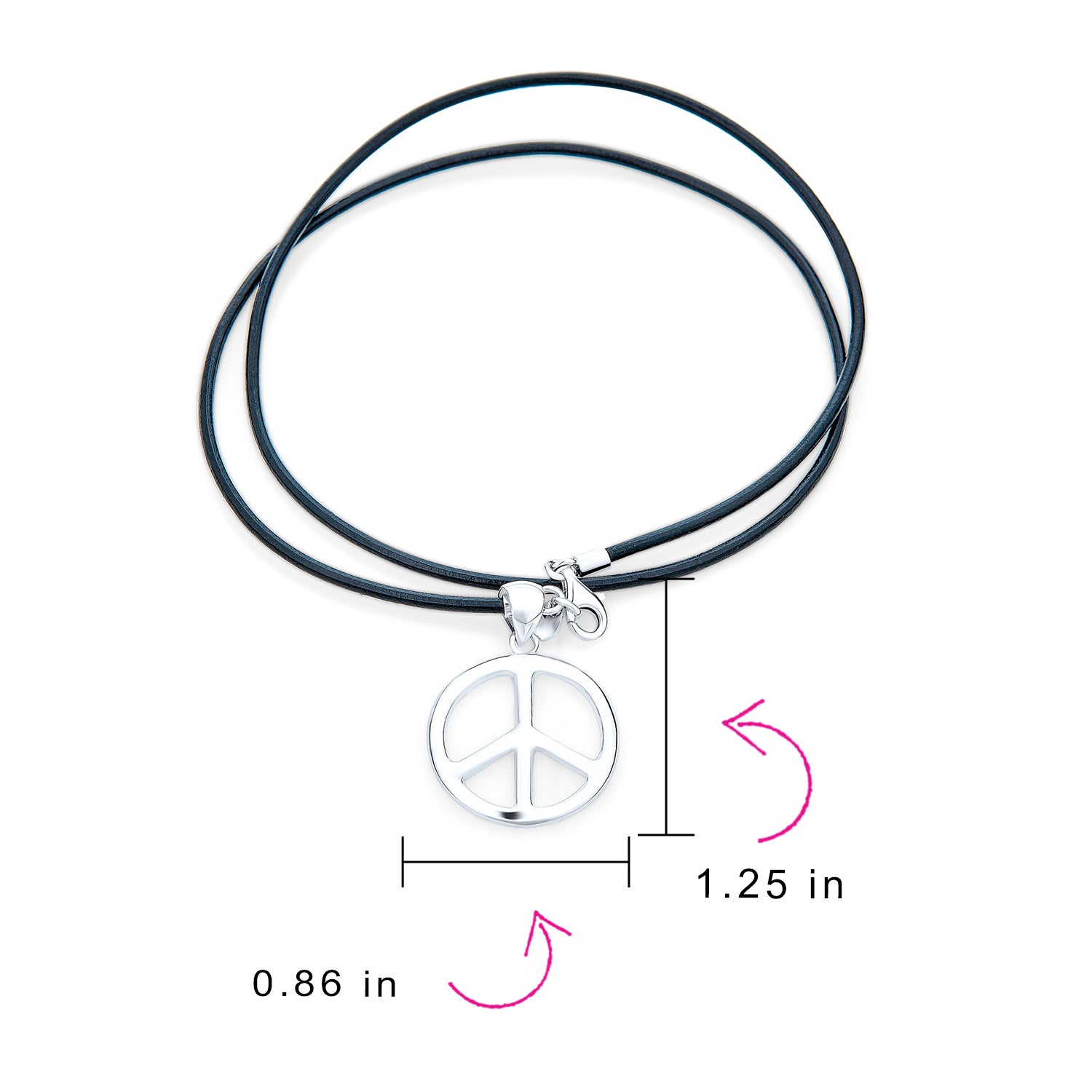 - Enhance your jewelry collection with this elegant peace sign pendant. Crafted from polished .925 Sterling Silver, it shines beautifully. Peace symbols are timeless and always in style. Express your love for peace with this classic necklace. The 18-inch leather cord ensures it dAngles perfectly. Ideal for daily wear or as a thoughtful gift. Get your peace charm necklace today and spread the message of peace.