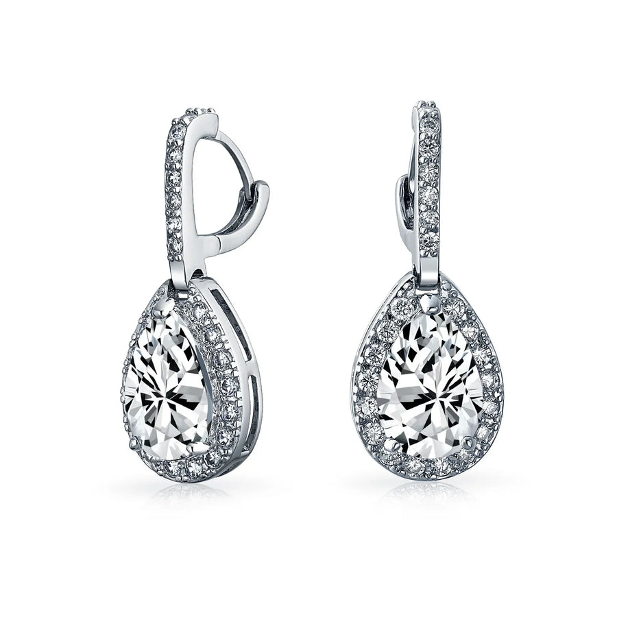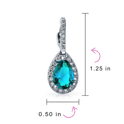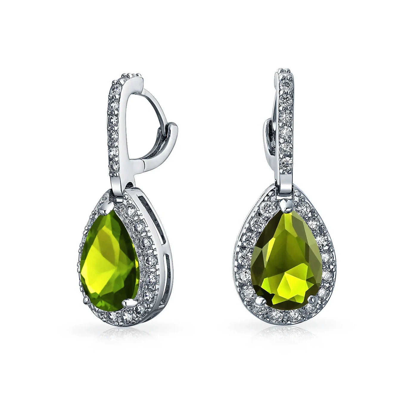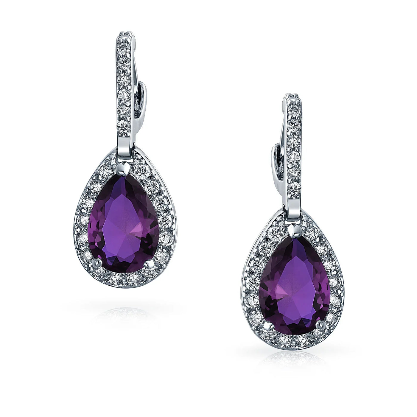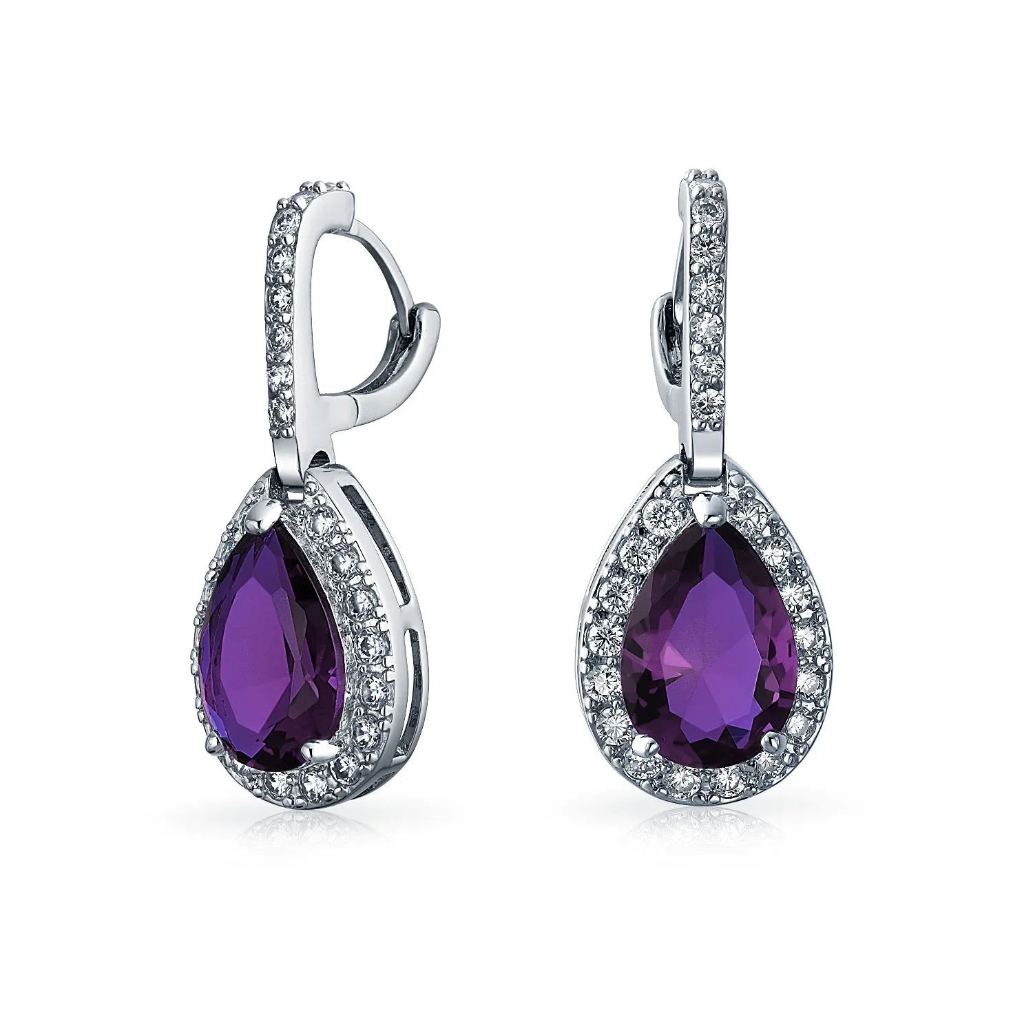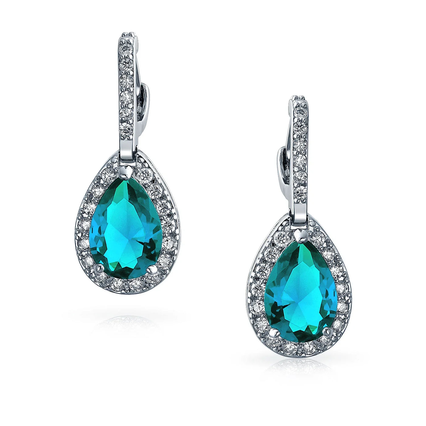- Elevate your formal look with these stunning Formal Art Deco Estate Style Teardrop CZ dangling snap hinge huggies earrings. Perfect for prom, evening wear, cocktail parties, holidays, or as a bridal party gift. Available in a variety of simulated CZ birthstone month colors, these earrings are sure to add a touch of elegance to any outfit. Featuring a dazzling simulated-diamond AAA CZ teardrop centerpiece with a CZ halo, these earrings are a must-have for anyone looking to make a statement. Ideal for those with an April birthday, these earrings will give you a ravishing glow for any special occasion.