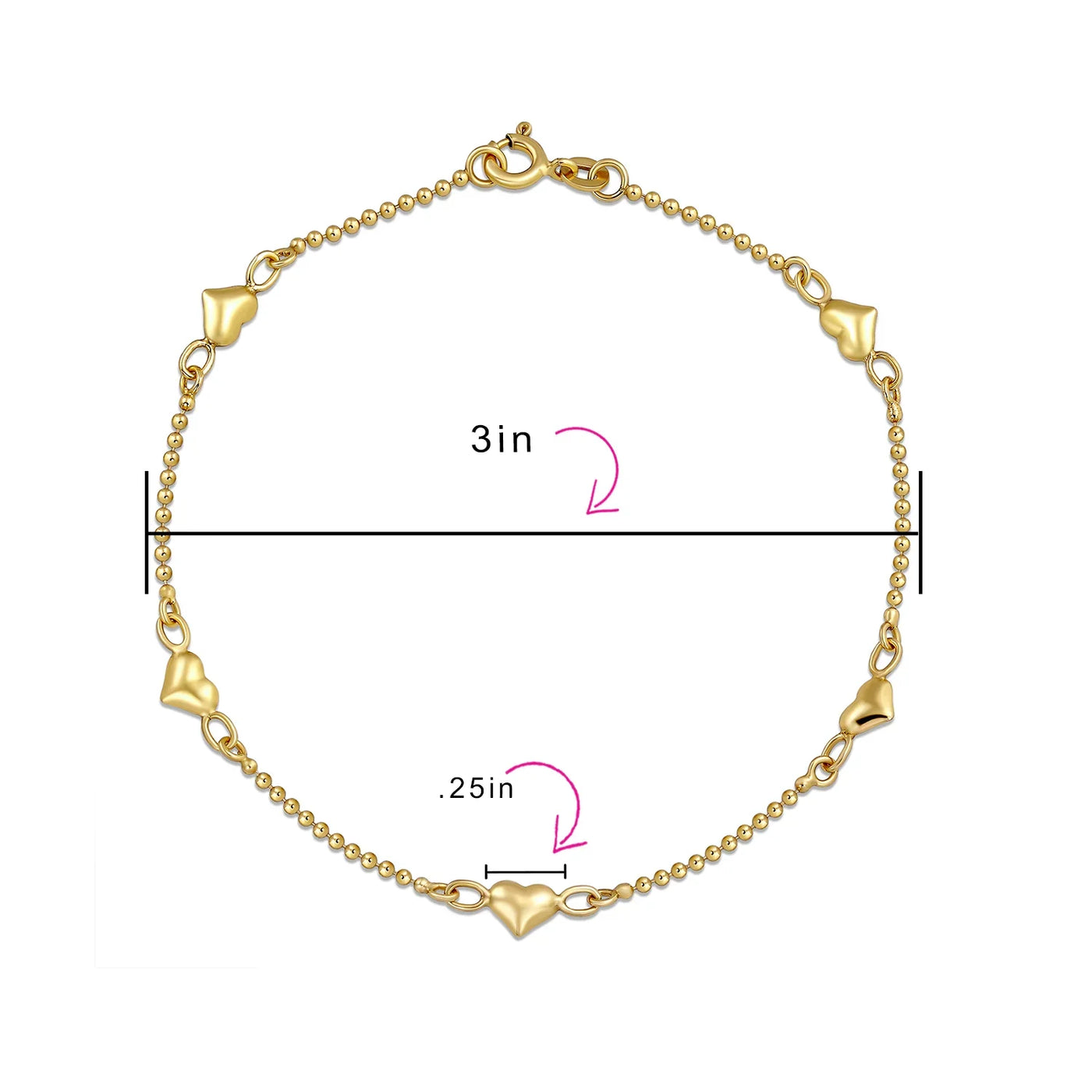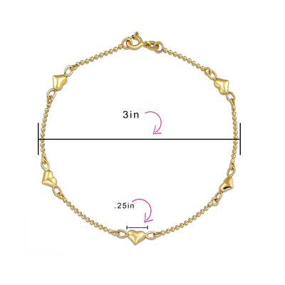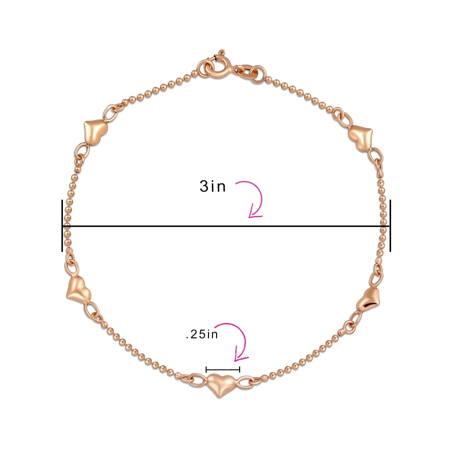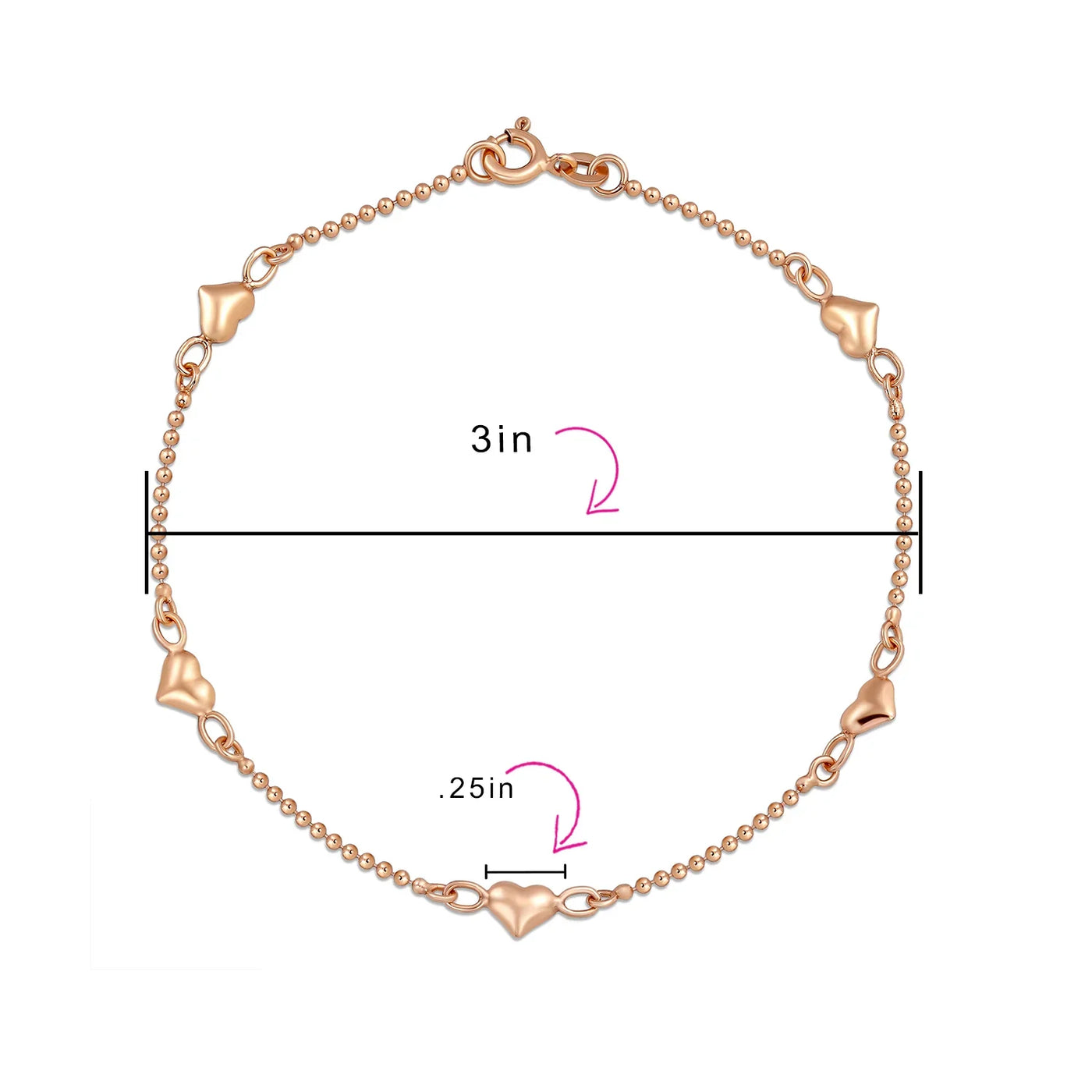 - Delicate but strong puff heart anklet with shot bead chain and 1inch extender for comfort fit Available rose gold vermeil thickness 2.5 microns of gold heavy quality plating made to last