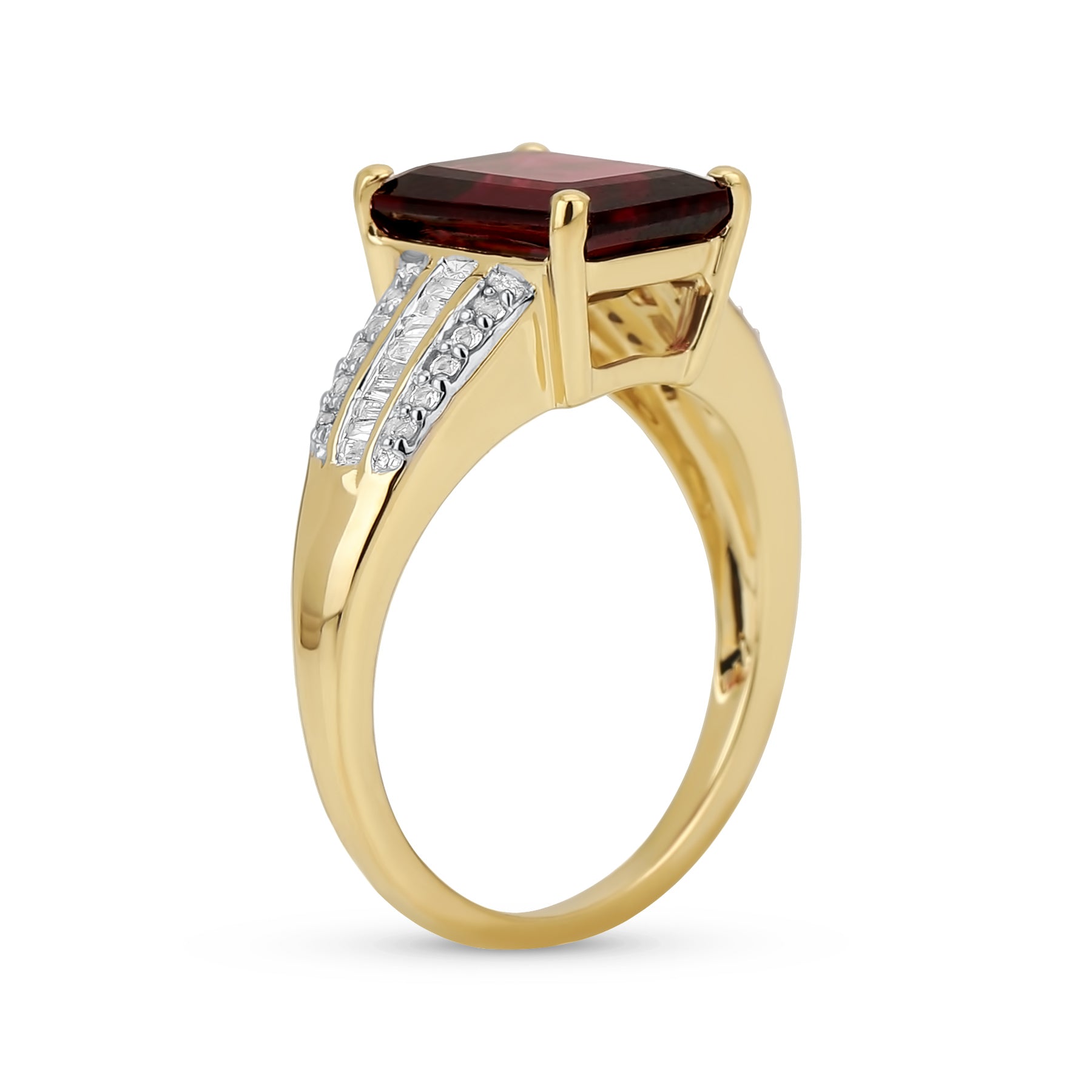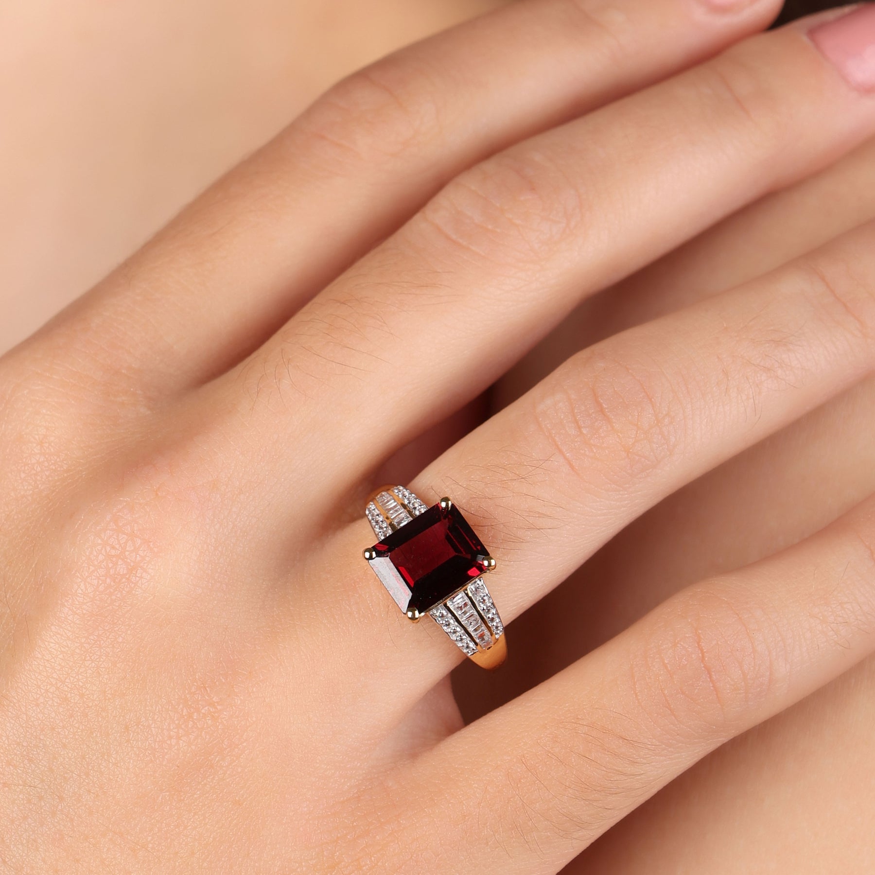 • Elevate your evening look with our luxurious, eye-catching ring. Featuring a stunning Emerald cut garnet gemstone, set in pronged yellow gold plated sterling silver. This elegant piece is perfect for January birthdays. A thoughtful and extraordinary gift, this ring is a true showstopper. Treat yourself or a loved one to this unique, breathtaking jewelry. Enjoy joy and admiration for years to come.