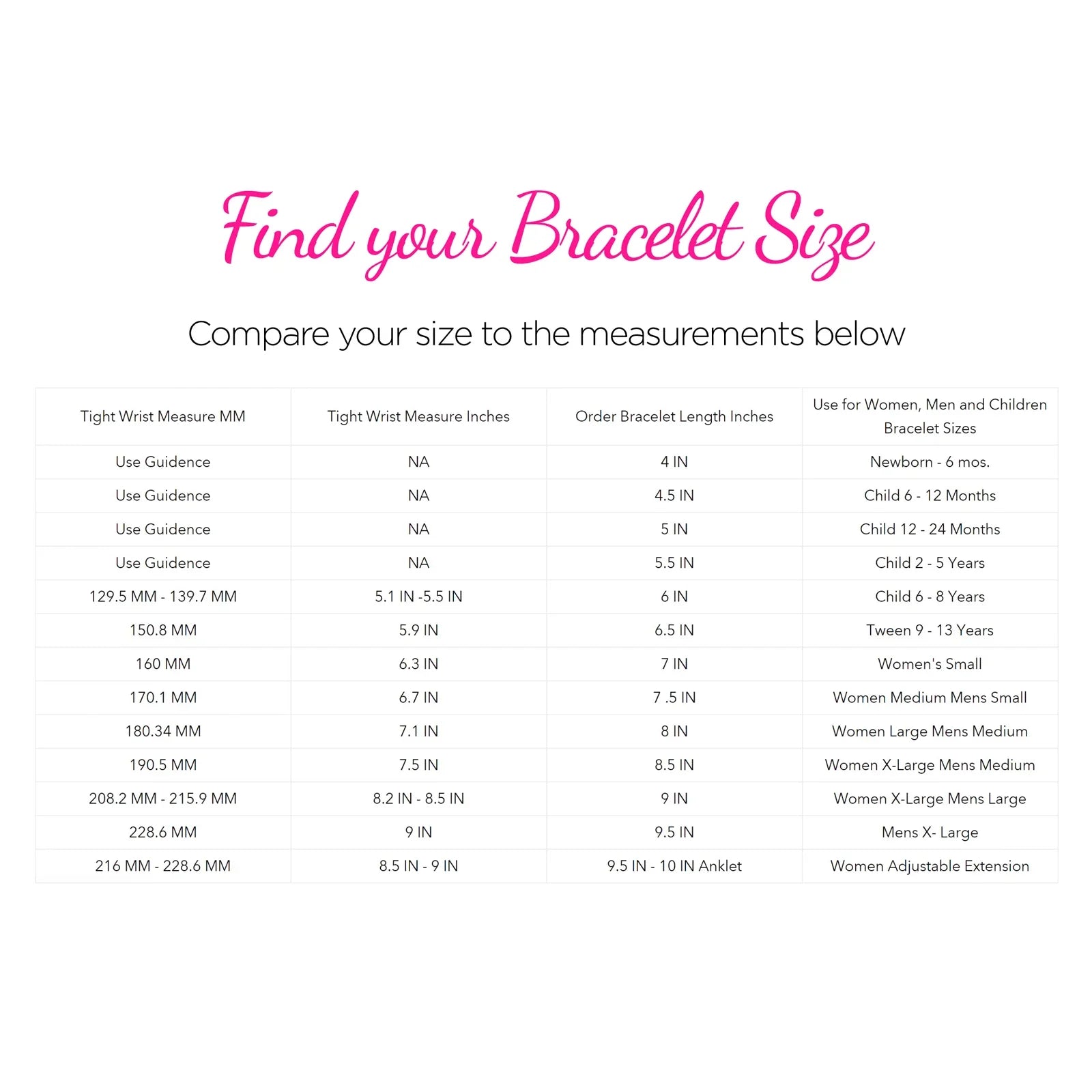STEP 3: To find your bracelet size, just add your wrist size with the appropriate measurements below.
