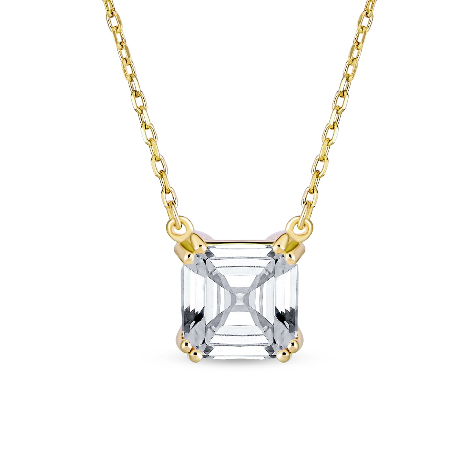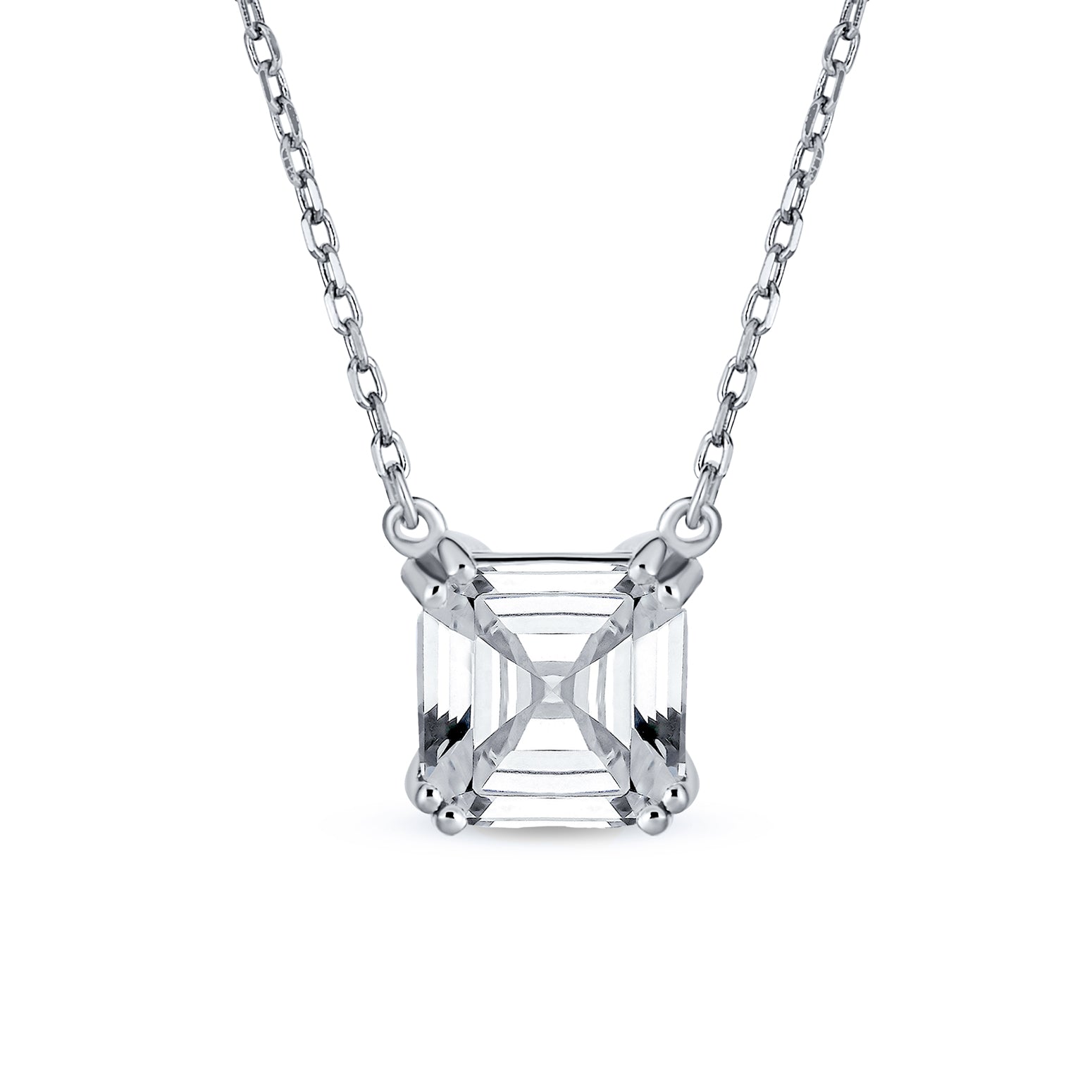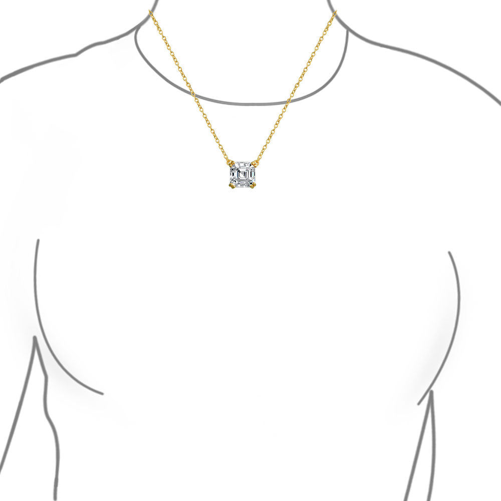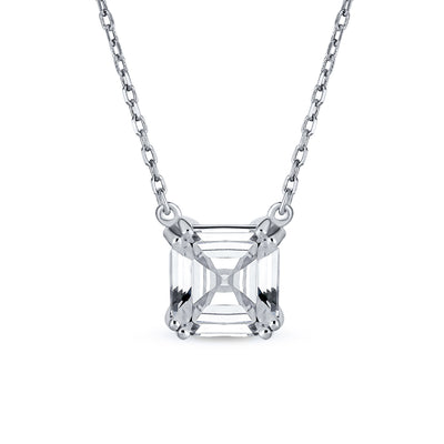 - Make a chic and elegant entrance with this Asscher cut pendant necklace. The modern design subtly updates the classic 4 prong style. The .925 sterling silver rolo chain is adjustable from 16 to 18 inches. You won't want to take this gem off; it works day and night. The 8 mm Asscher cut stone captures light beautifully, adding sophistication to any outfit. Just like the lady who wears it, this necklace will garner endless compliments. An affordable Cubic Zirconia necklace, it's a perfect gift for the special women in your life.