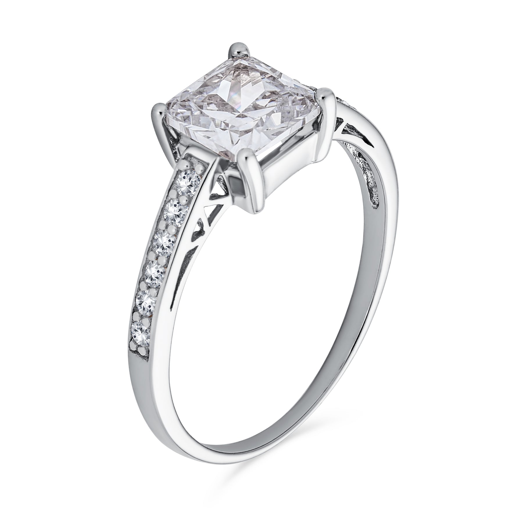 • This traditional sterling silver CZ engagement ring is a timeless choice. Crafted in gleaming .925 silver, it features glittering CZ stones. Round cut stones line the band, leading to an 8mm princess cut centerpiece. Show your love with this dazzling CZ jewelry. Order solitaire engagement ring today and get ready to pop the question.