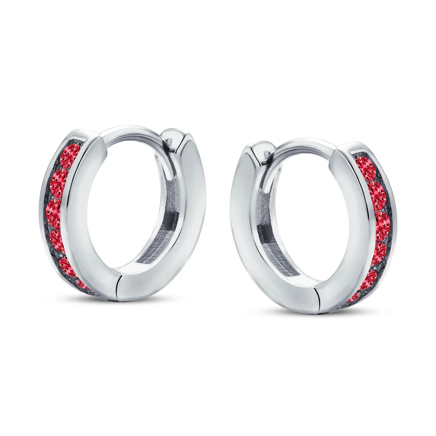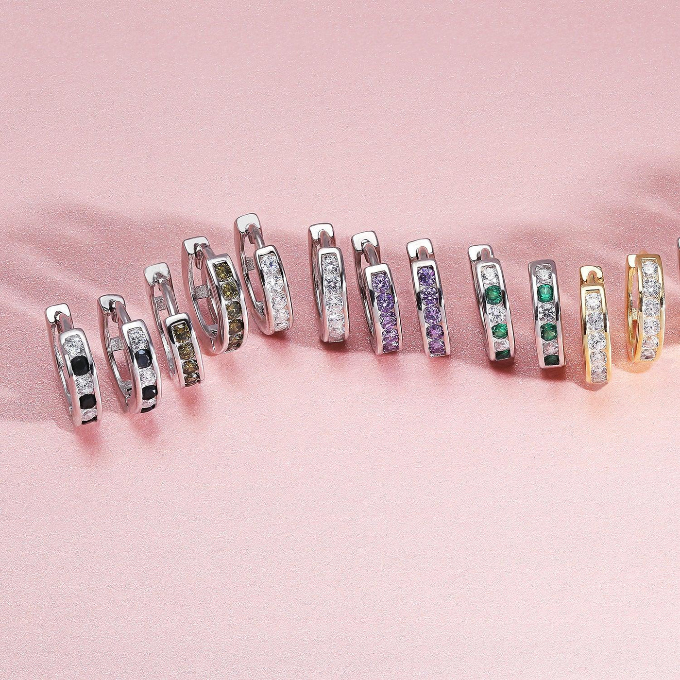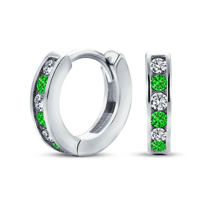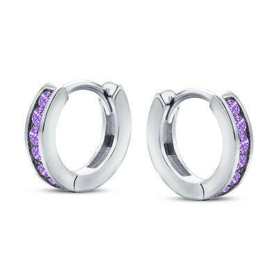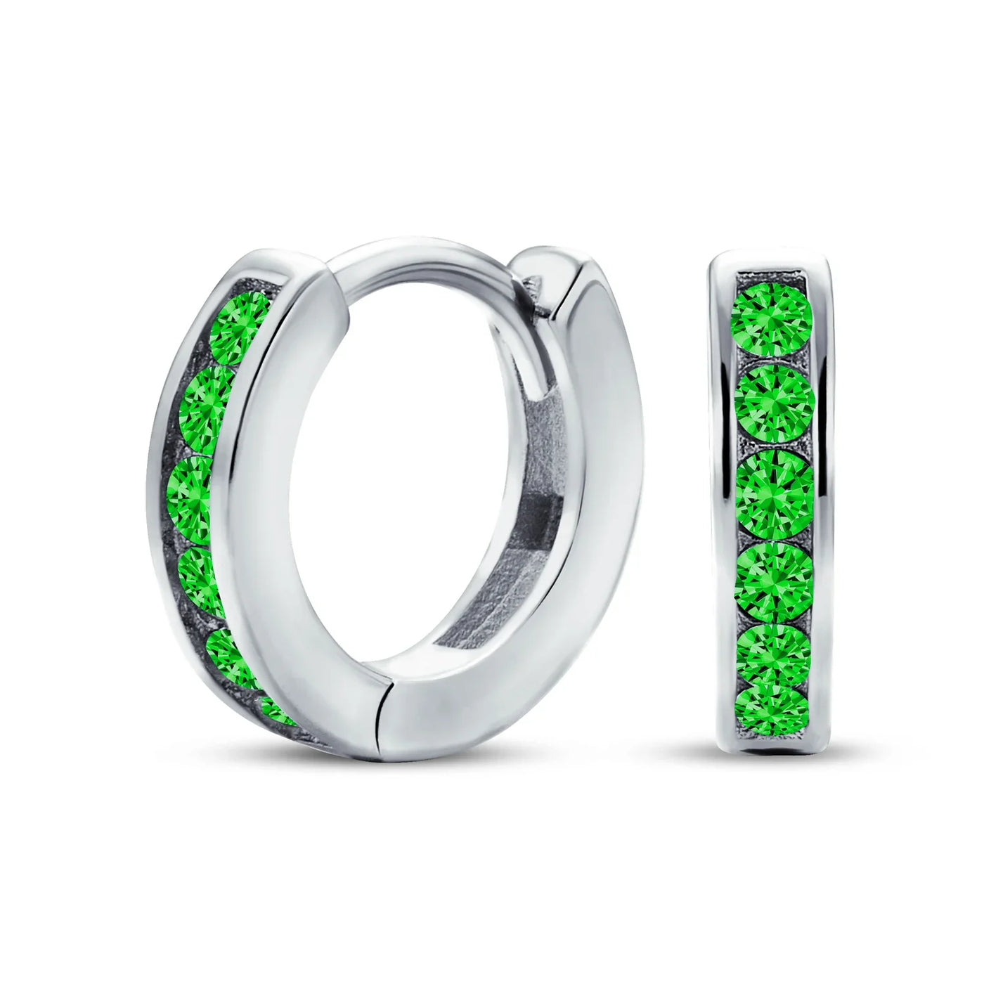 - Enhance your look with our vibrant CZ huggie earrings. Crafted from 925 sterling silver, these hoops feature simulated amethyst, emerald, garnet, and sapphire CZs. Perfect birthstone jewelry for January, February, May, and September. Order now!