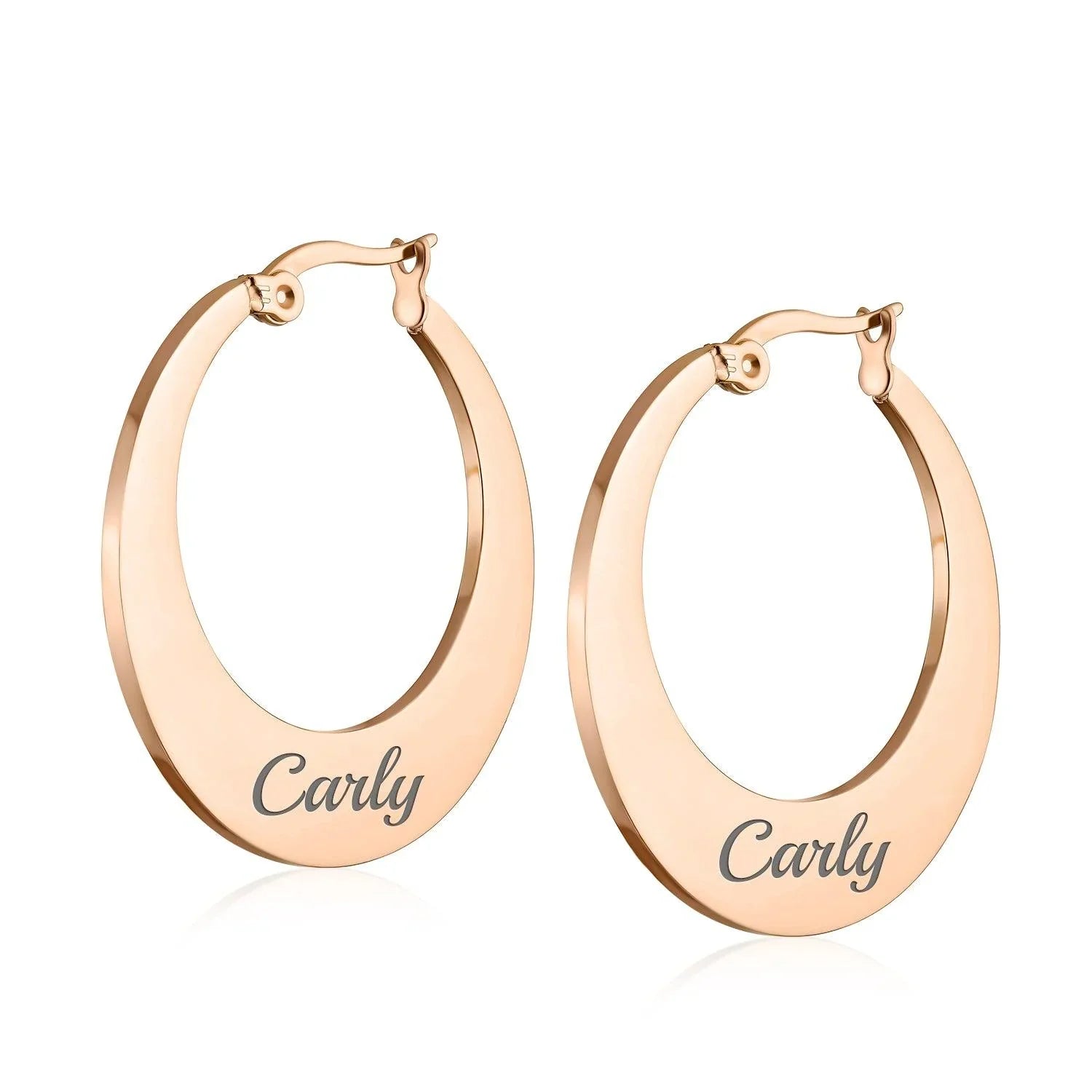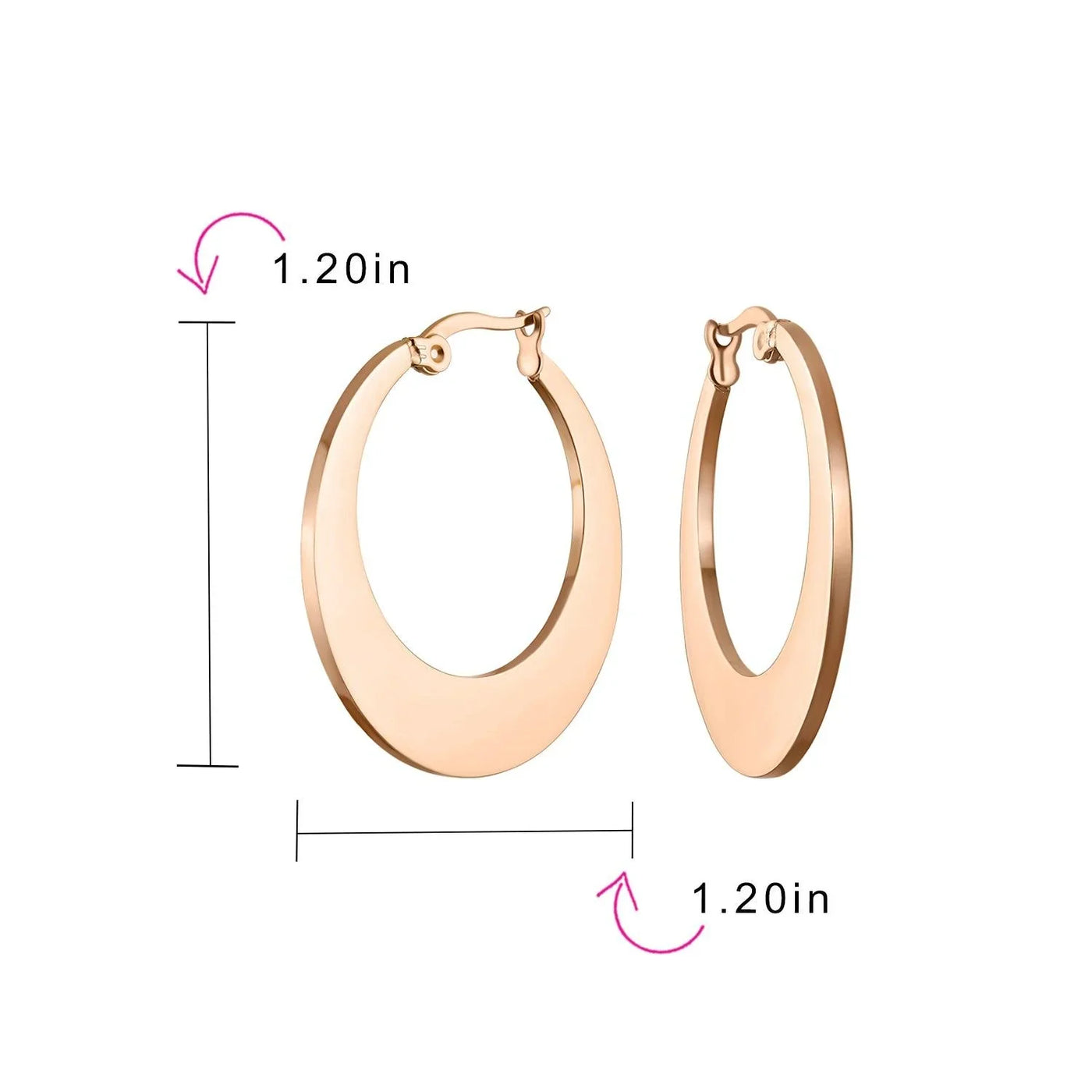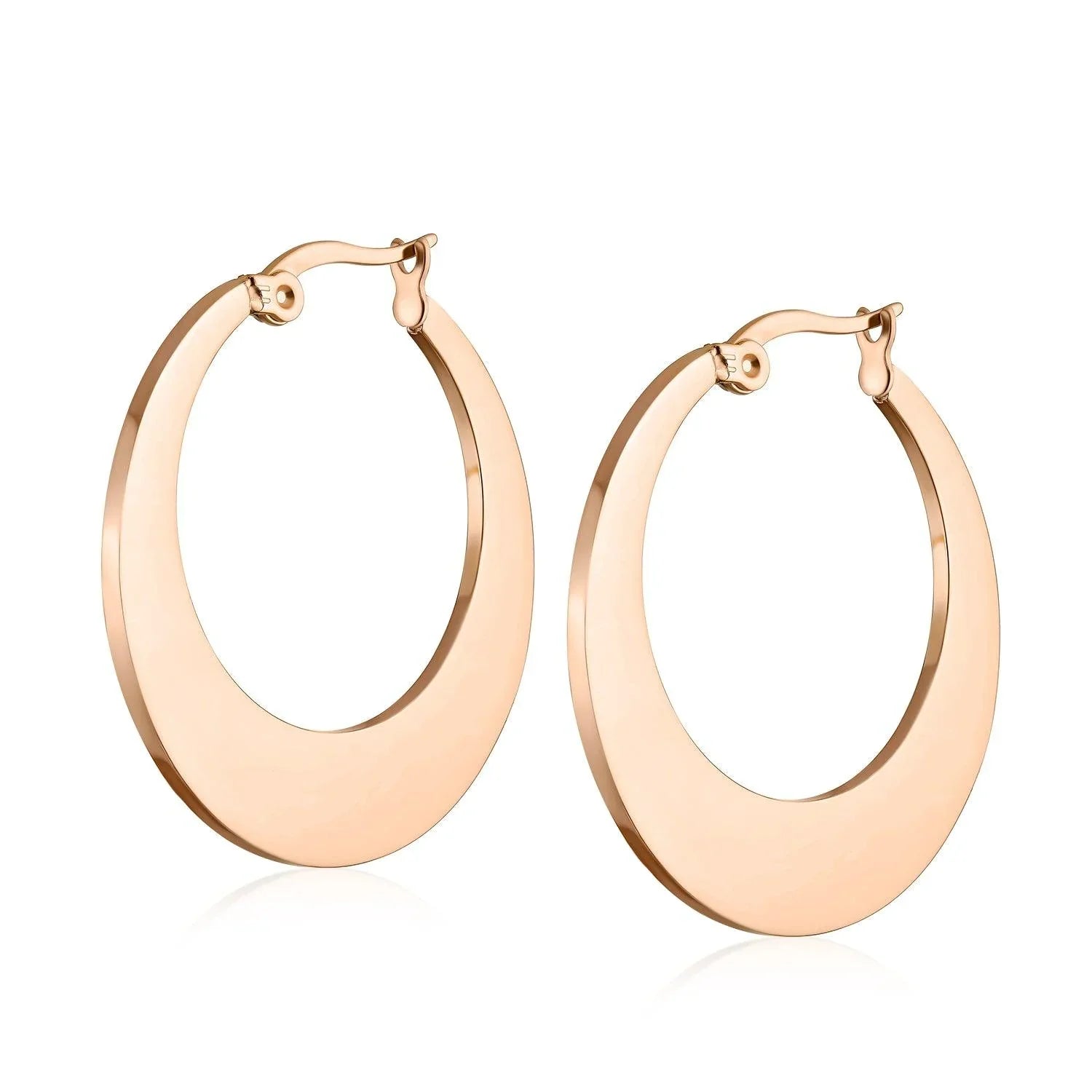 - Add an element of feminine radiance with timeless style with these chic, rose gold plated stainless steel, hoop earrings. Featuring a flat hoop design with an up to the minute feel and finished in brilliant, rose gold plating.