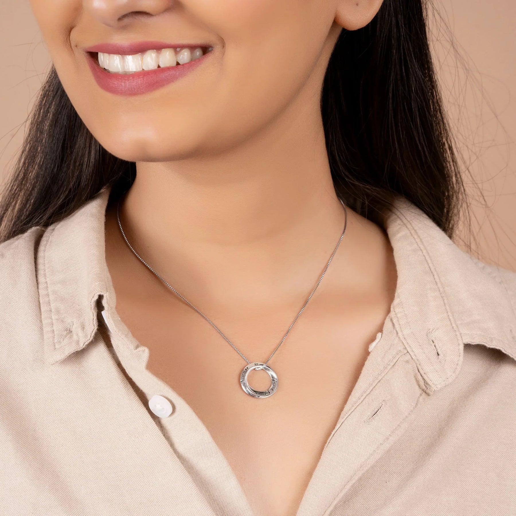 • ELEGANT DESIGN - Show your sister or soul sister how much she means to you with this beautifully crafted open circle necklace. Engraved with a heartfelt message, this sterling silver pendant hangs from a 16in chain, symbolizing the bond of sisterhood and friendship. The delicate design measures just 0.75in, making it a perfect everyday accessory.