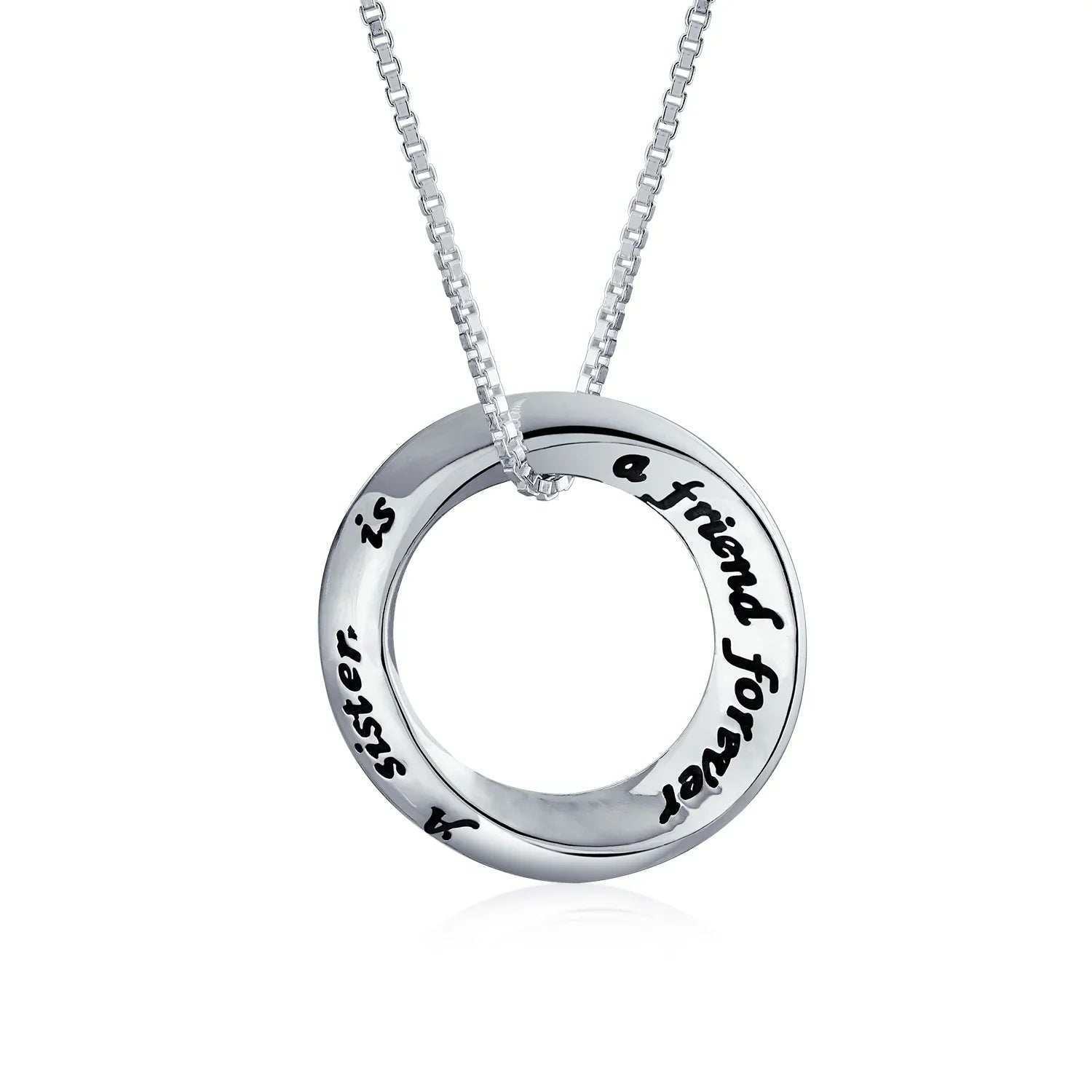 • Show your sister you care with this .925 Sterling Silver message pendant. The open circular ring is engraved with "A Sister Is A Friend Forever." This circular motif symbolizes an unbreakable, eternal bond. Gift your BFF this friends forever silver necklace to show your unwavering support. The delicate rolo chain adds elegance to this lovely piece. The personal message is subtly engraved, making it uniquely special. Perfect for birthdays or just to remind her she's cherished. Any sibling would adore this sister necklace pendant. Make her feel one in a million today.
