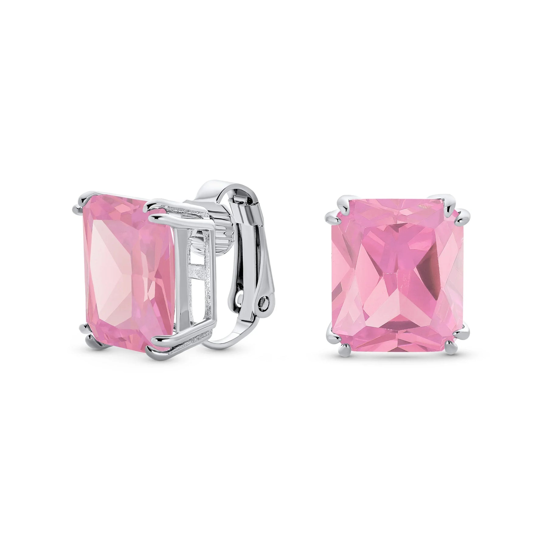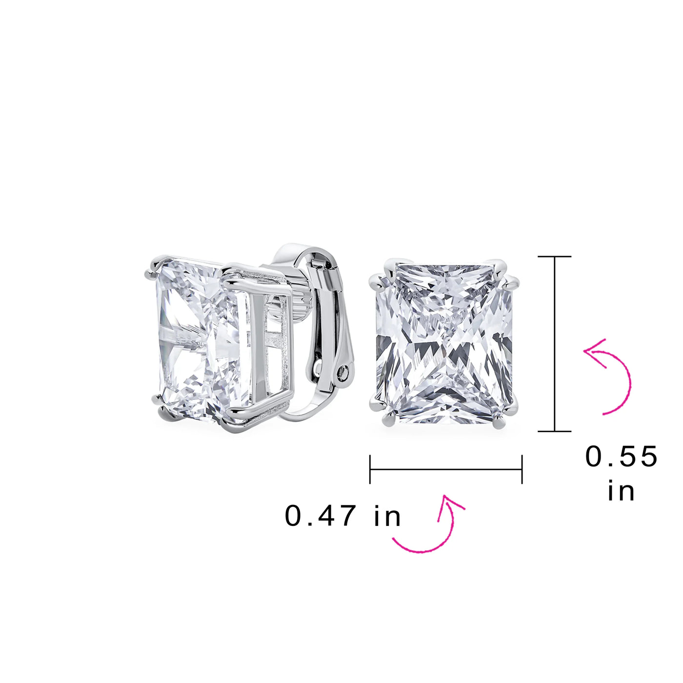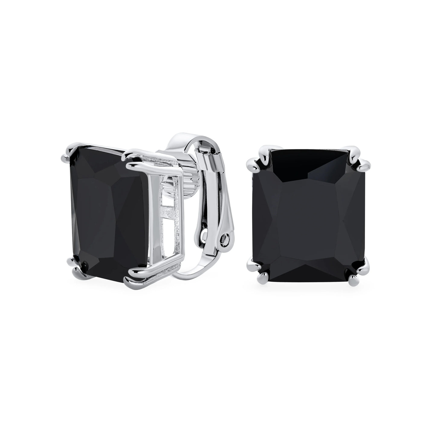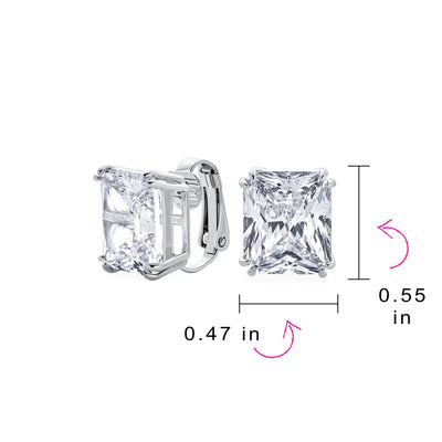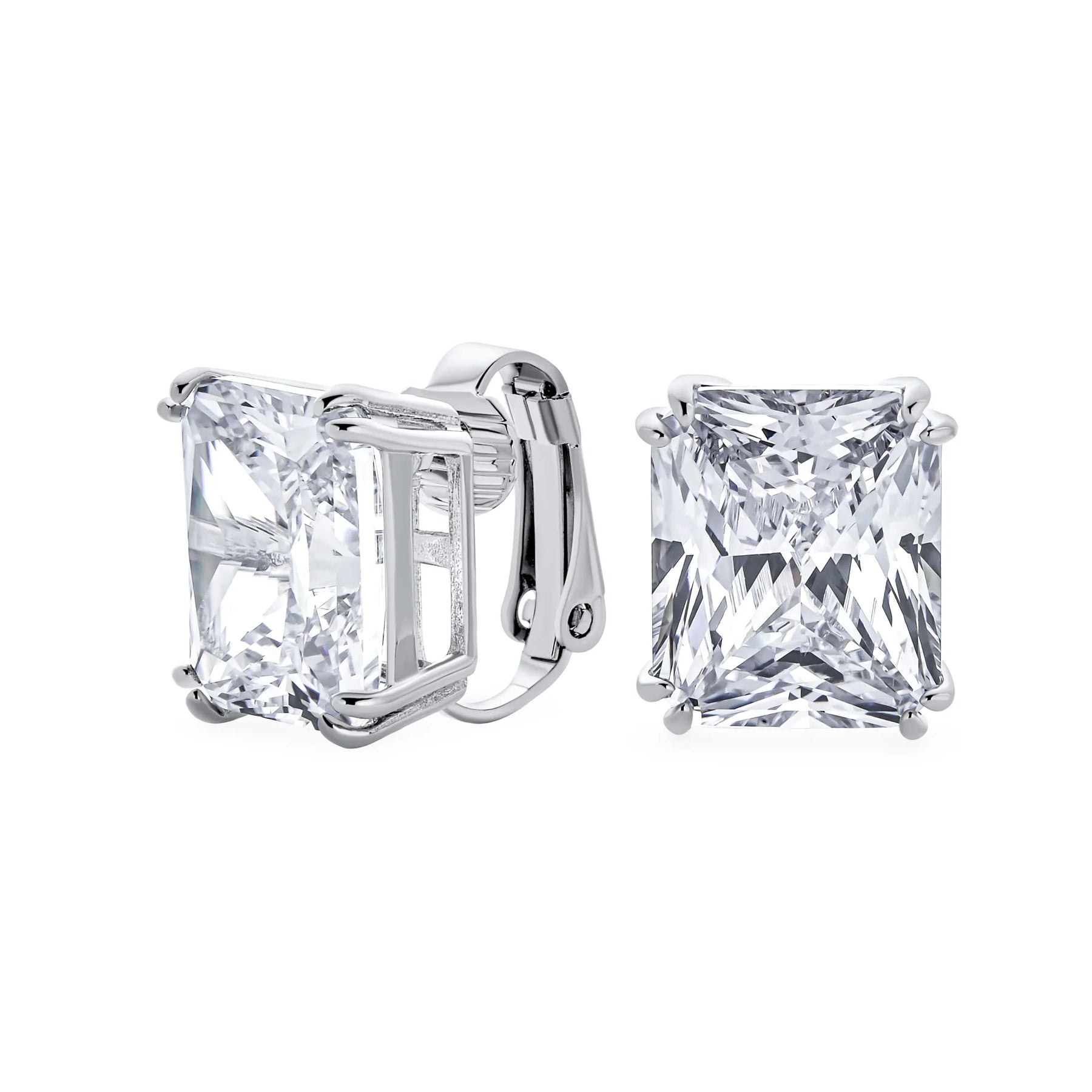 - Our rectangle solitaire clip on earrings are a great choice for the jewelry lover who does not have pierced ears. Featuring an 14mm cubic zirconia clear stone secured by a four prong setting, these clip on stud earrings will look great on you. Made out of silver plating these cz bridal studs attach to your ear comfortably and fashionably. These rectangle cz earrings are rhodium plated so they will remain shiny for years to come. Be prepared to receive compliments when you don this pair of cz stud earrings for women.