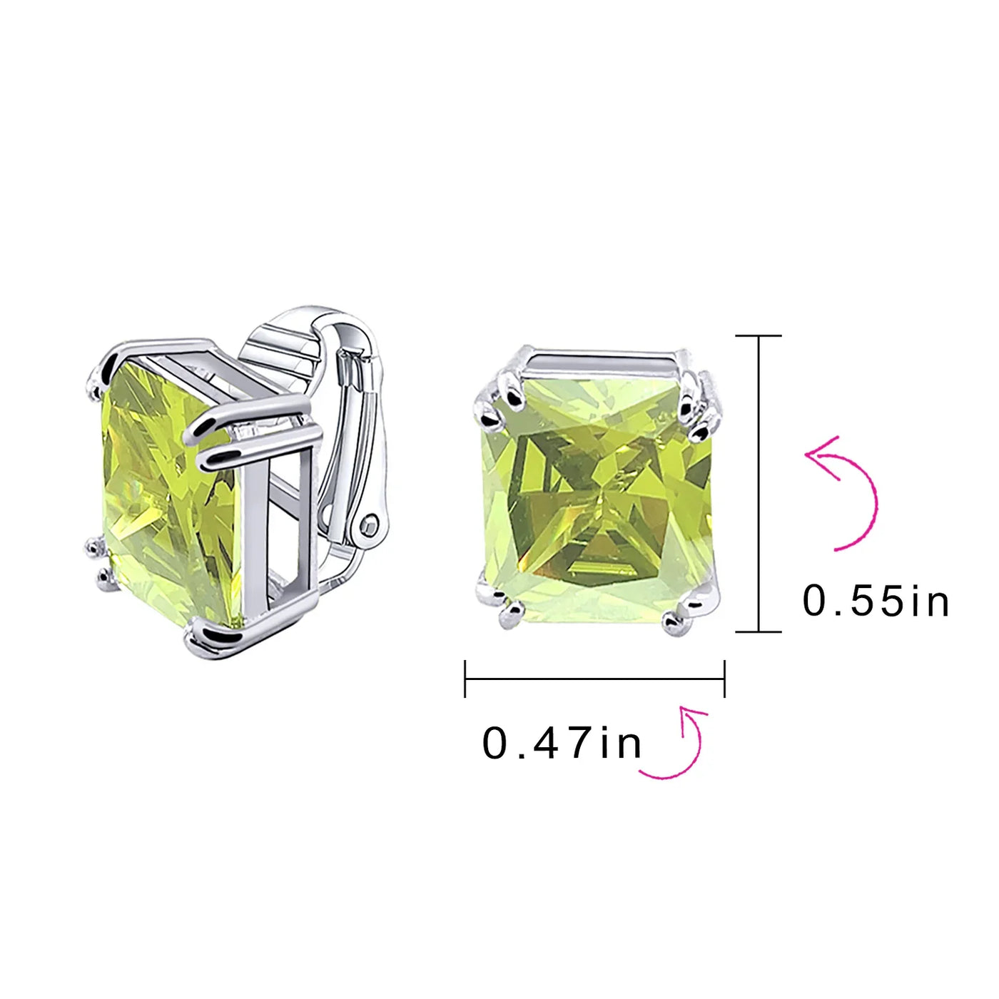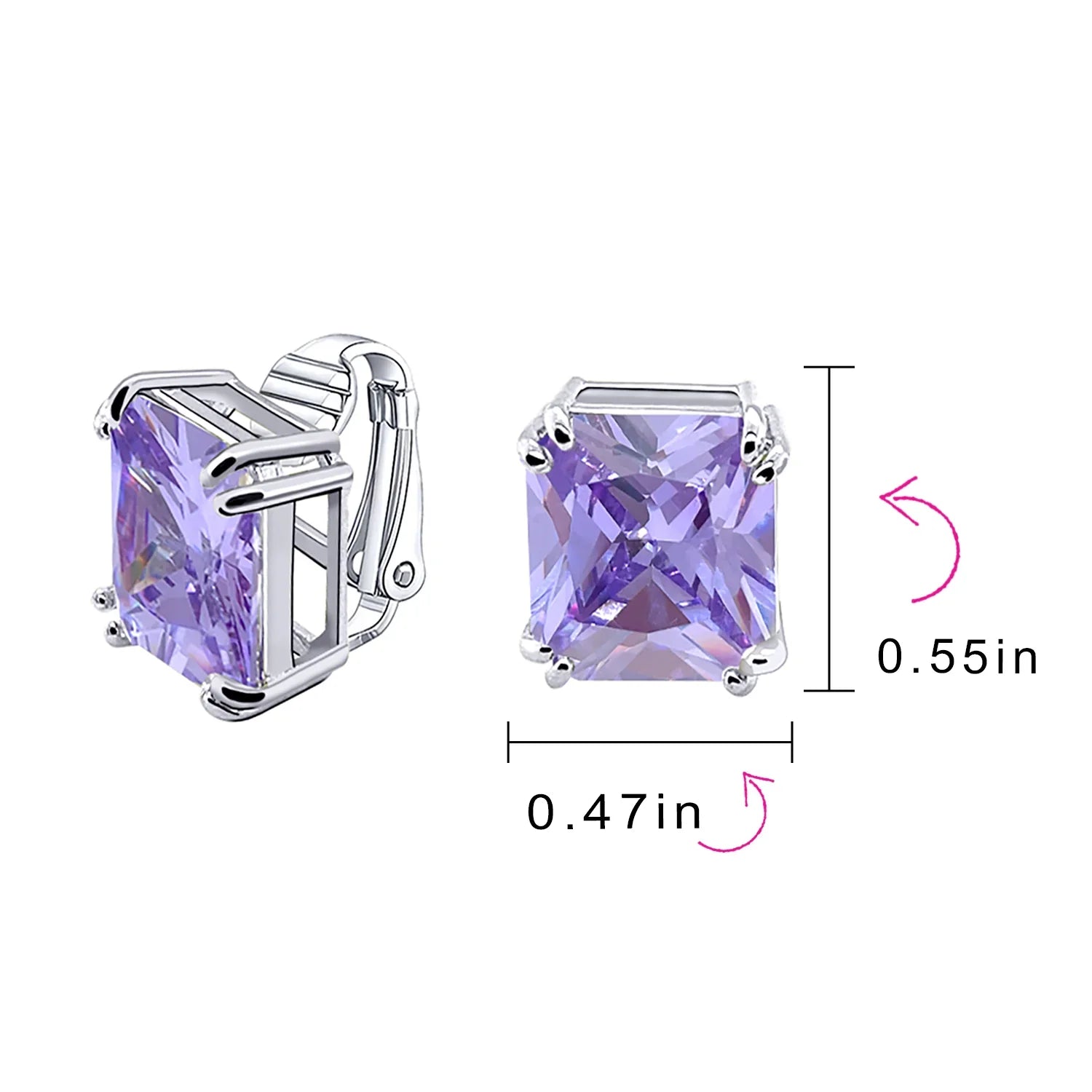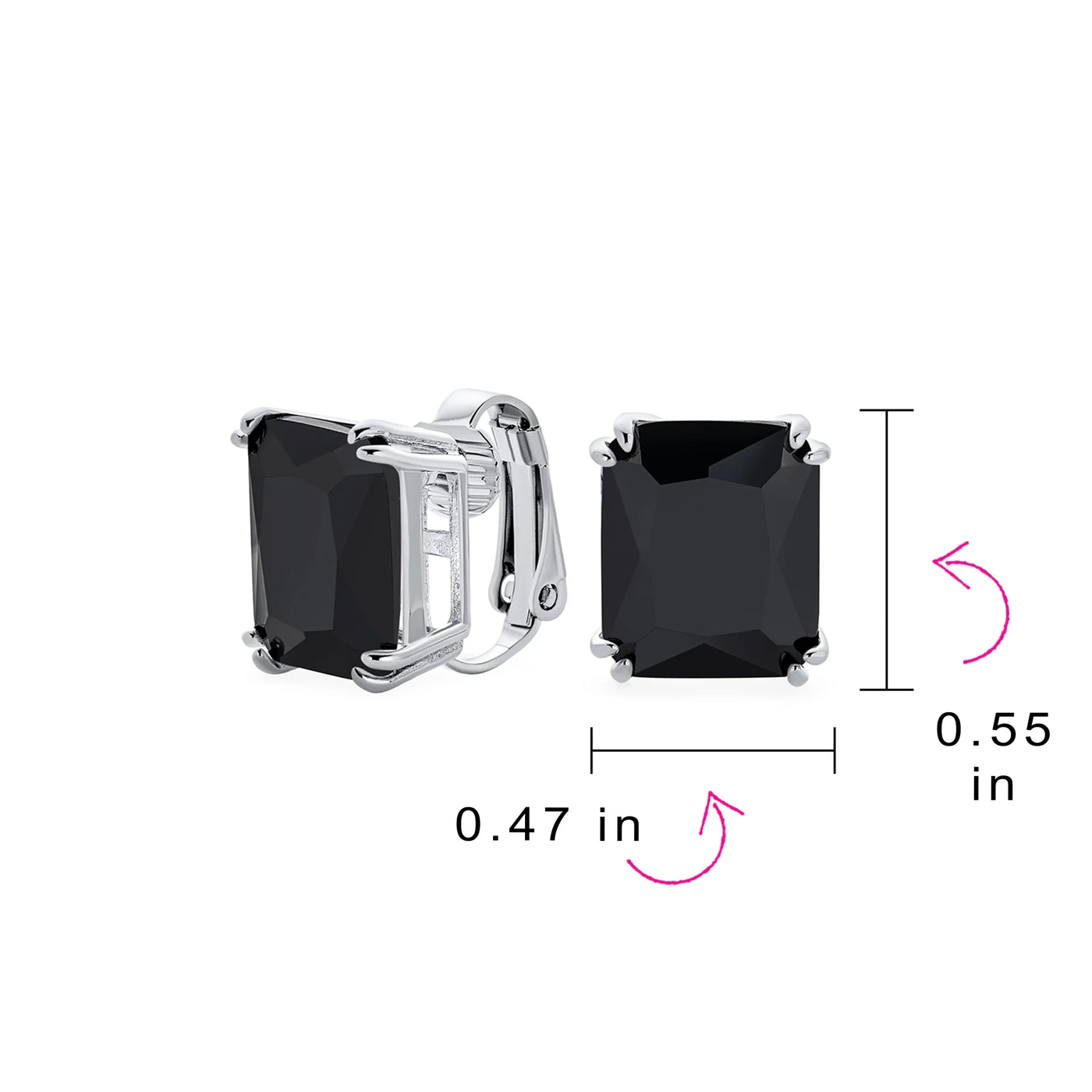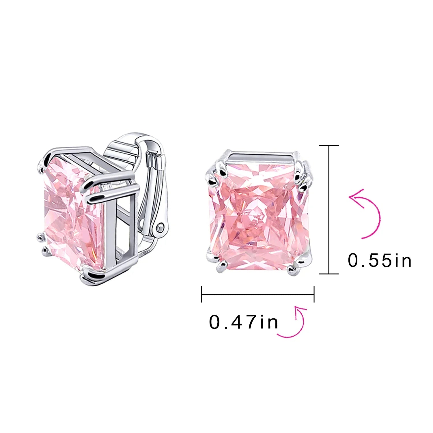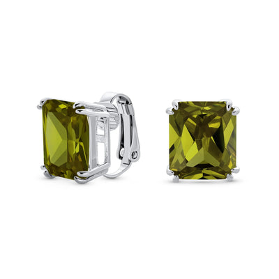 - Our rectangle solitaire clip on earrings are a great choice for the jewelry lover who does not have pierced ears. Featuring an 14mm cubic zirconia clear stone secured by a four prong setting, these clip on stud earrings will look great on you. Made out of silver plating these cz bridal studs attach to your ear comfortably and fashionably. These rectangle cz earrings are rhodium plated so they will remain shiny for years to come. Be prepared to receive compliments when you don this pair of cz stud earrings for women.