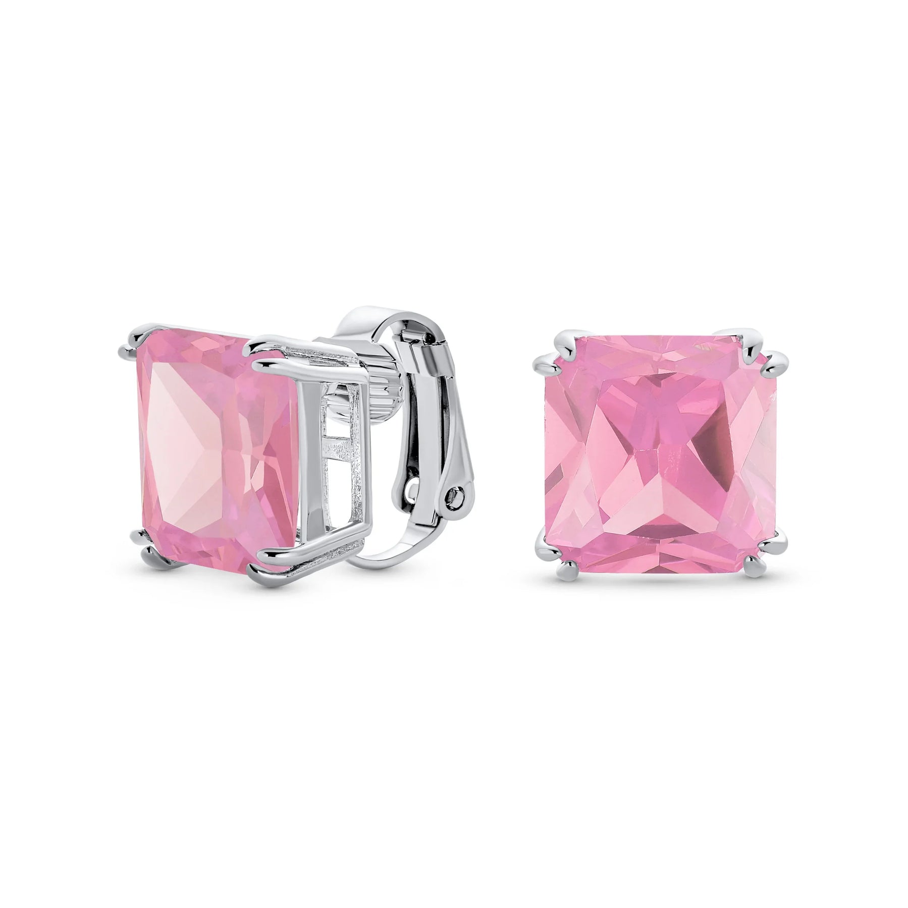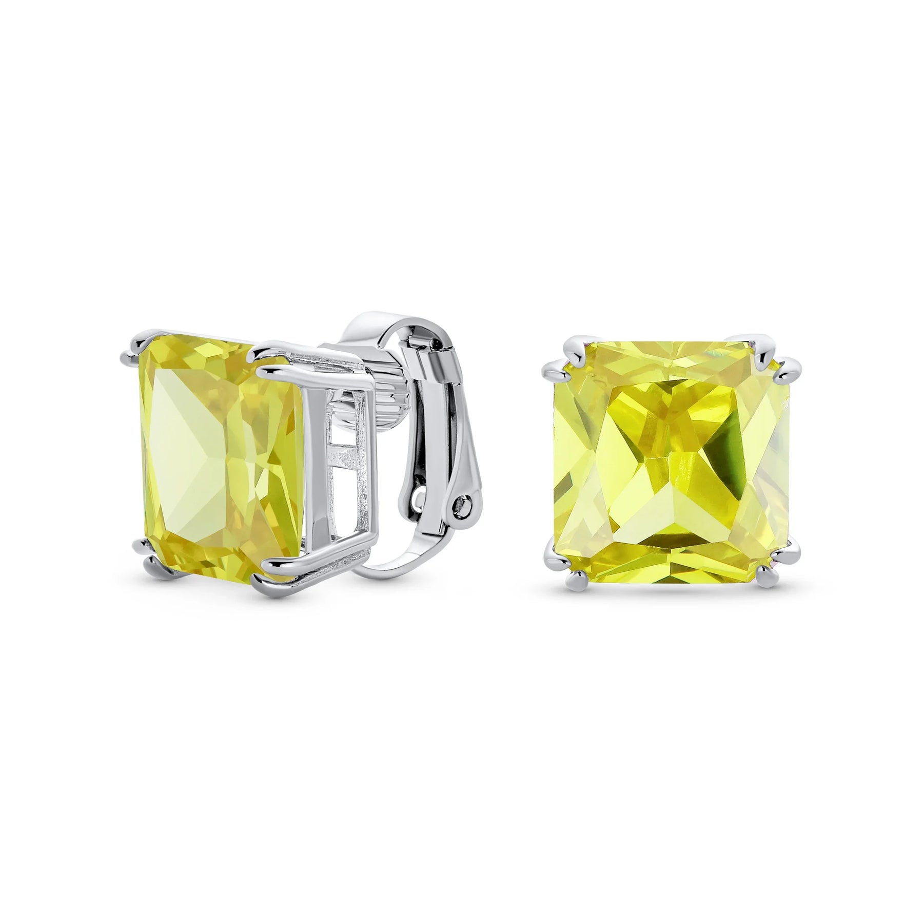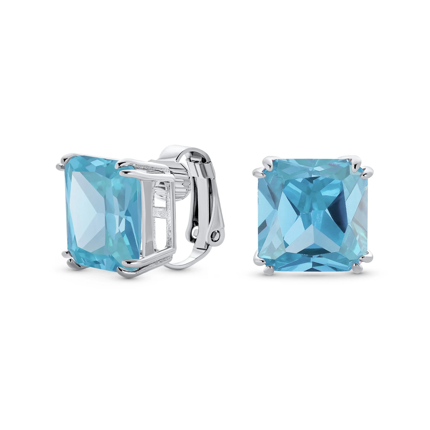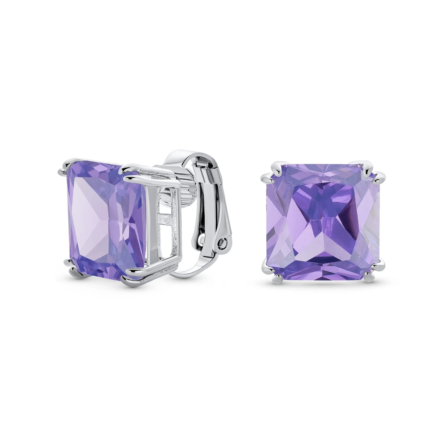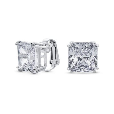 - Our square solitaire clip-on earrings are perfect for non-pierced ears. Featuring a 12mm cubic zirconia stone in a four-prong setting, these earrings shine brilliantly. Made with silver plating, these bridal studs attach comfortably and fashionably. Rhodium plating ensures long-lasting shine. Expect compliments when you wear these stunning cz stud earrings for women.