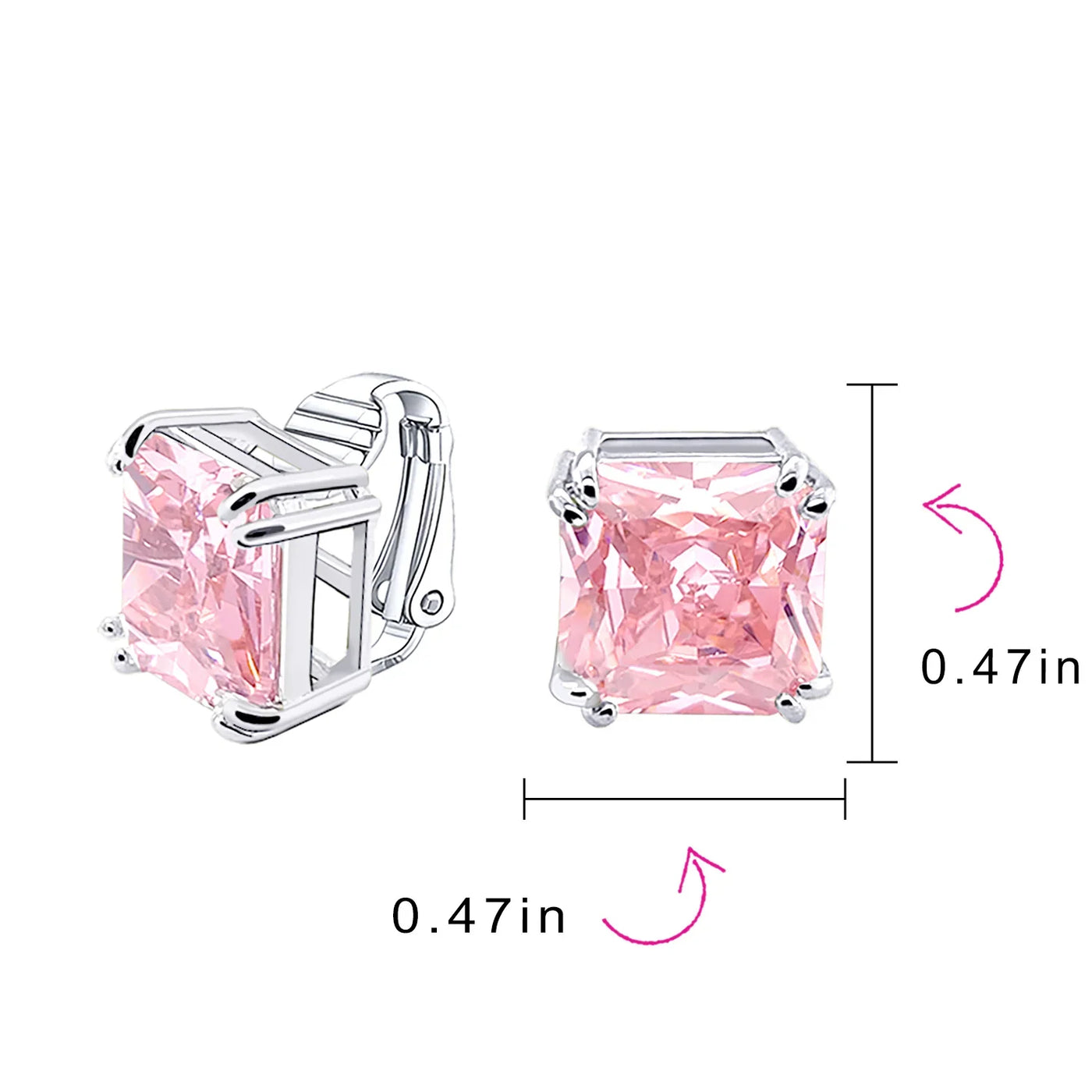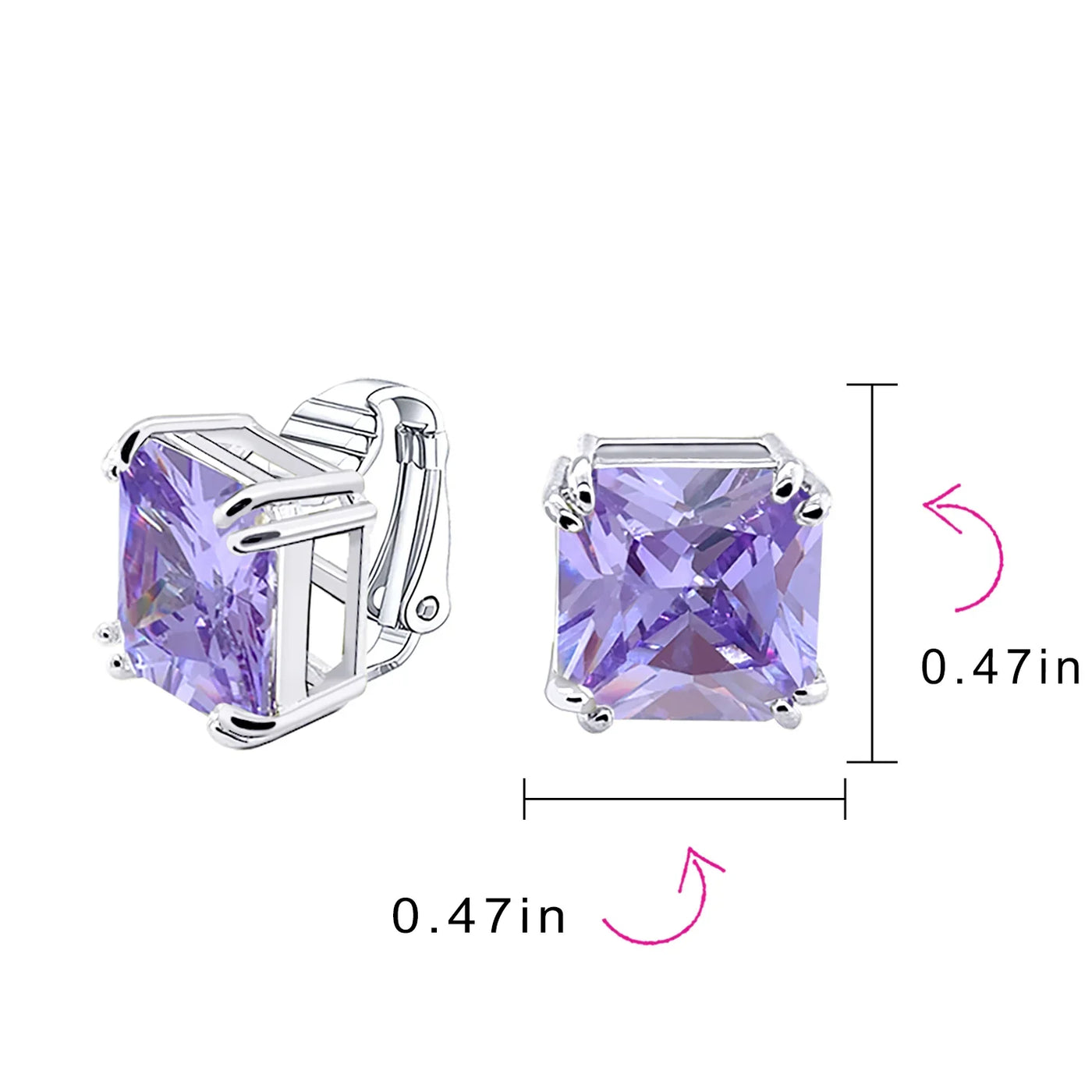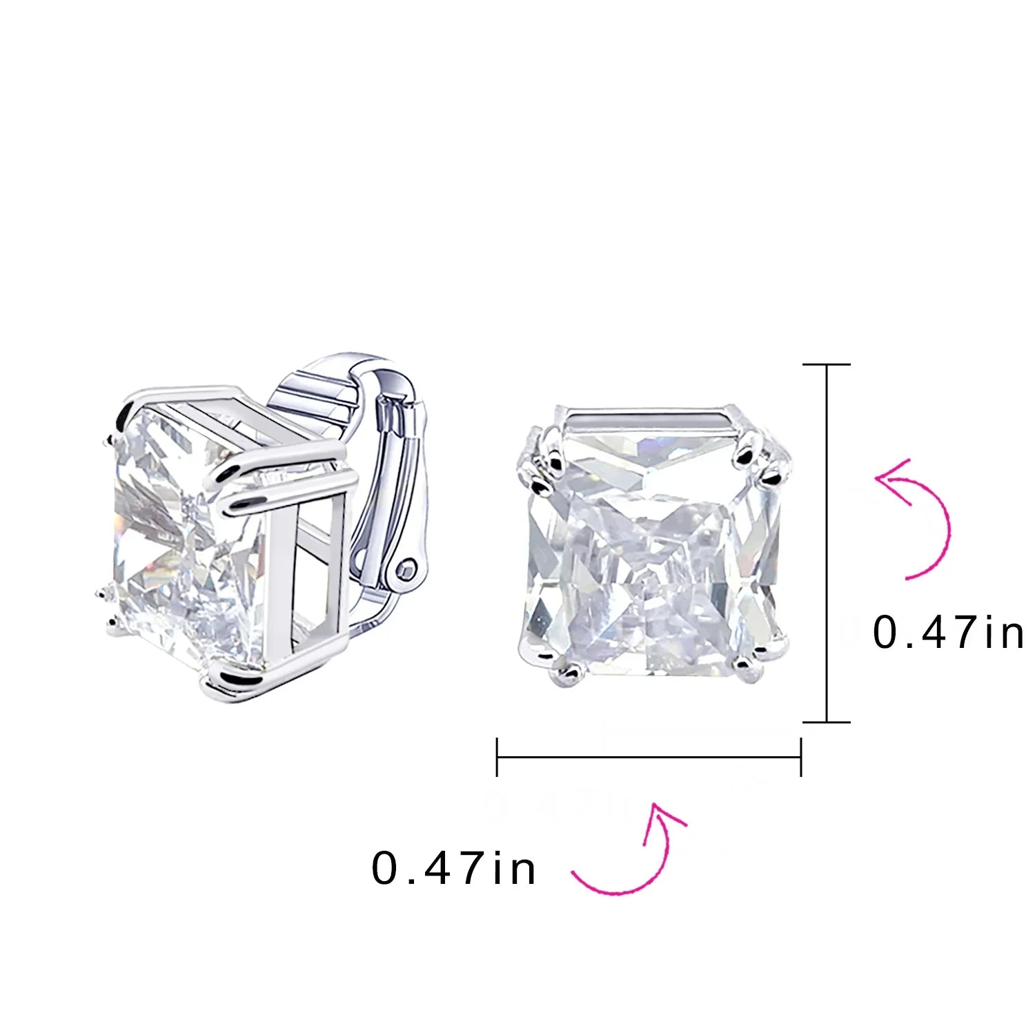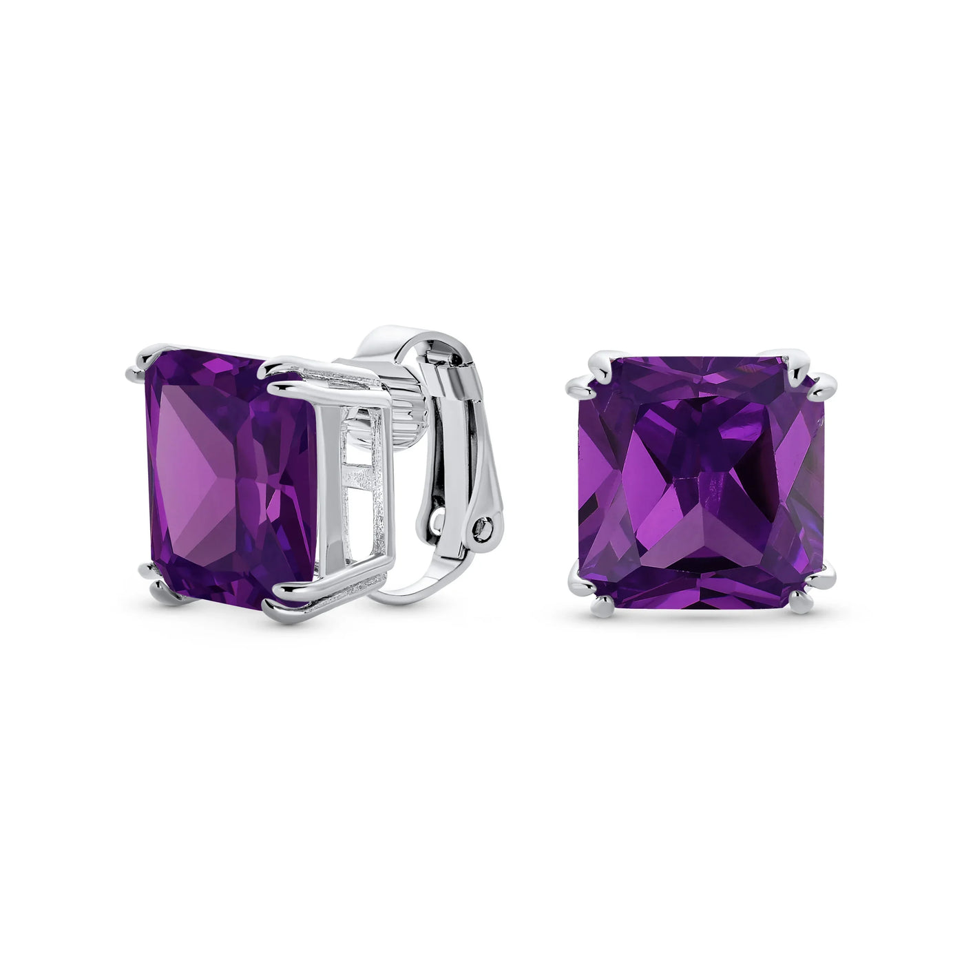 - Our square solitaire clip-on earrings are perfect for non-pierced ears. Featuring a 12mm cubic zirconia stone in a four-prong setting, these earrings shine brilliantly. Made with silver plating, these bridal studs attach comfortably and fashionably. Rhodium plating ensures long-lasting shine. Expect compliments when you wear these stunning cz stud earrings for women.