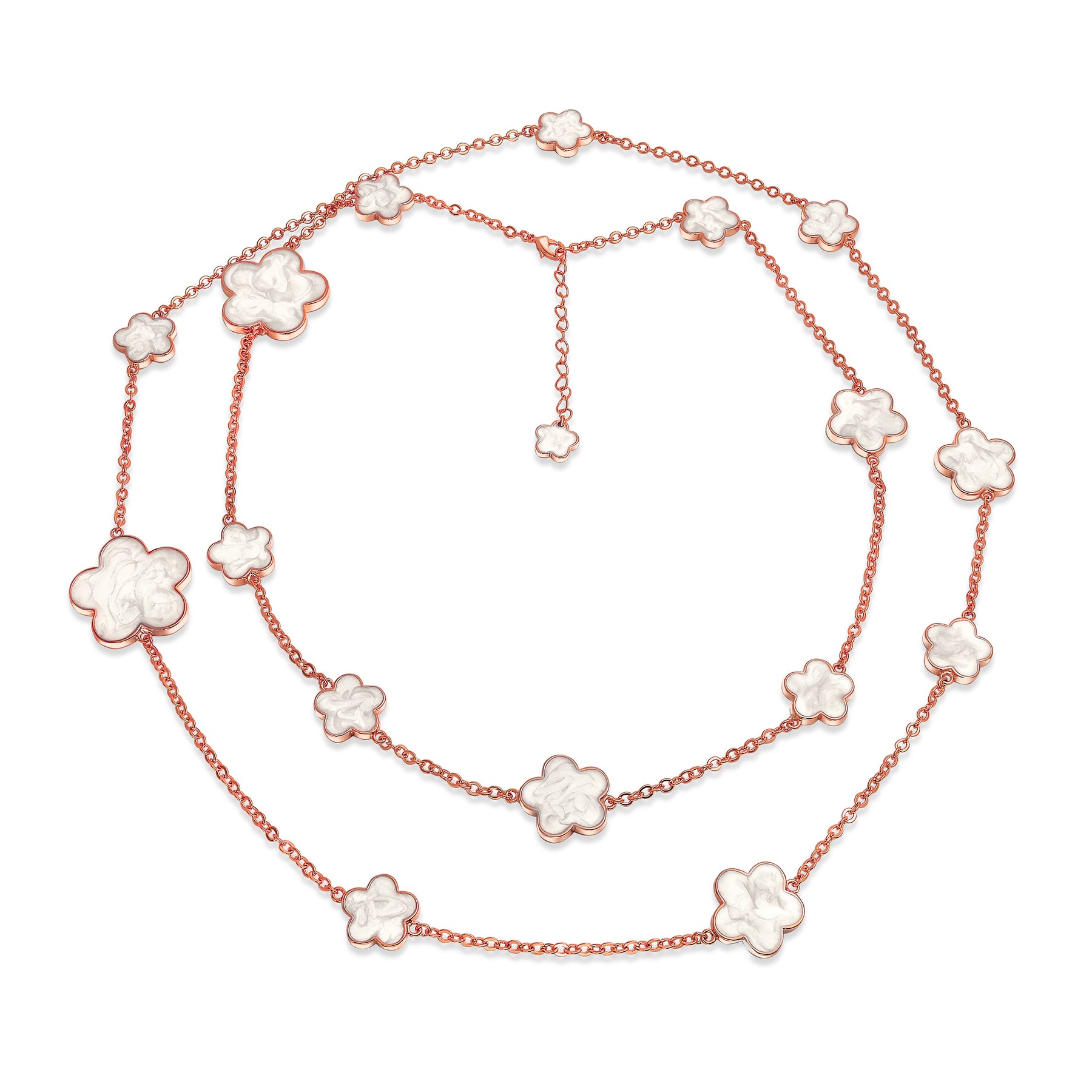 - Our Enamel Flower Clover Necklace is the season's must-have. Perfect for fashionable and chic ladies, this 42-inch rhodium-plated necklace features 16 sleek white enamel clovers. Clover sizes range from 0.5 to 1.5 inches in diameter. According to Irish legend, a five-leaf clover brings more luck and financial success than a four-leaf clover. Add this lucky charm to your jewelry collection. Wear it as a single chain or double it for a layered look. Sophisticated and feminine, this versatile piece transitions from daytime to nighttime glam effortlessly. Part of our latest flower jewelry collection.