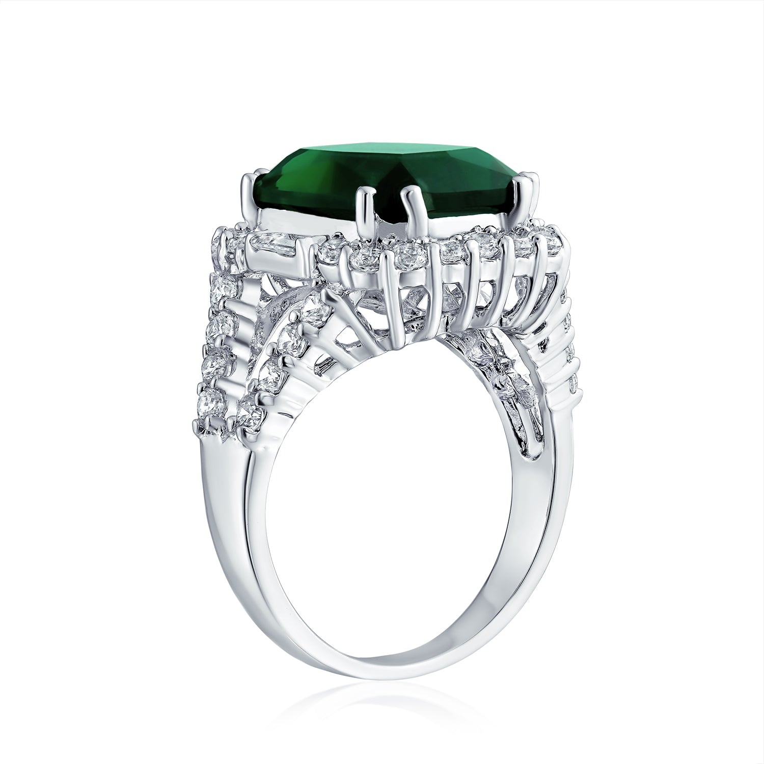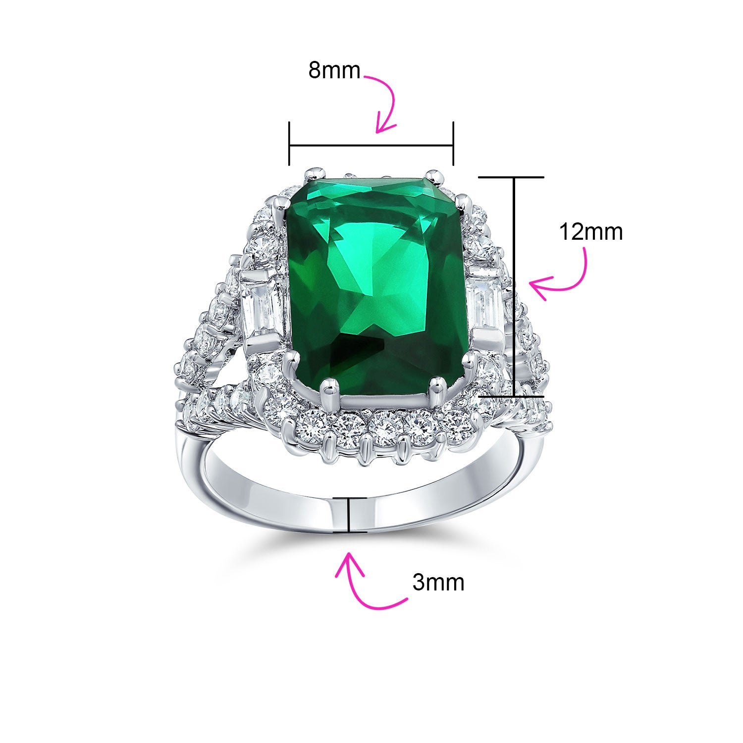 • This beautiful radiant cut Simulated Emerald color CZ engagement ring is the epitome of elegance. It has dazzling cubic zirconia accents bordering the large green Simulated Emerald CZ. It has a double split shank on both sides embedded with smaller round cut CZs. Our rhodium plated brass CZ engagement ring features as a four prong set center stone. It is a dazzling green Simulated Emerald color radiant cut cubic zirconia stone that measures 15mm by 10mm. On either side of the radiant cut ring are two baguette cut cubic zirconia stones, as the rest of the Simulated Emerald color stone is accented by small round cut cubic zirconia stones. This ring is glittering with beauty and class. Say yes to the ring and if the love of your life is a May born sweetheart, this magnificent ring will be perfect.