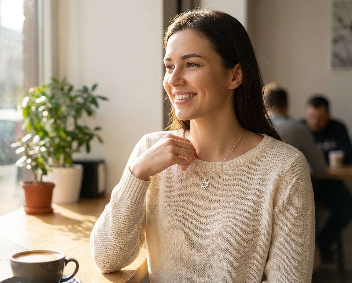 - Spiritual Style: Celebrate share your faith or heritage with this beautifully designed necklace featuring a cutout open Magen star charm. This Star of David pendant stand out in the realm of religious jewelry, blending traditional aesthetics with a modern vibe. A wonderful gift for Bat Mitzvah, Passover, or Chanukah.