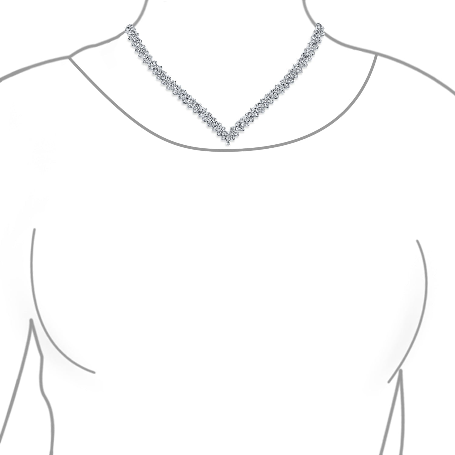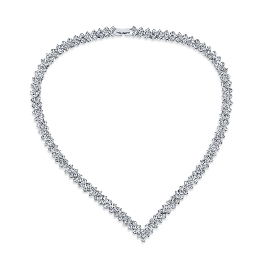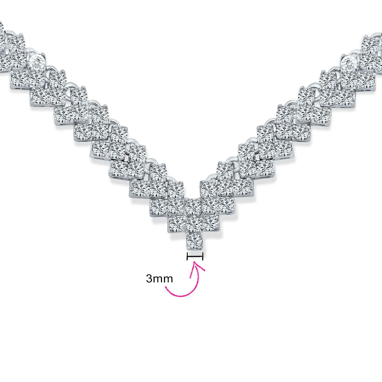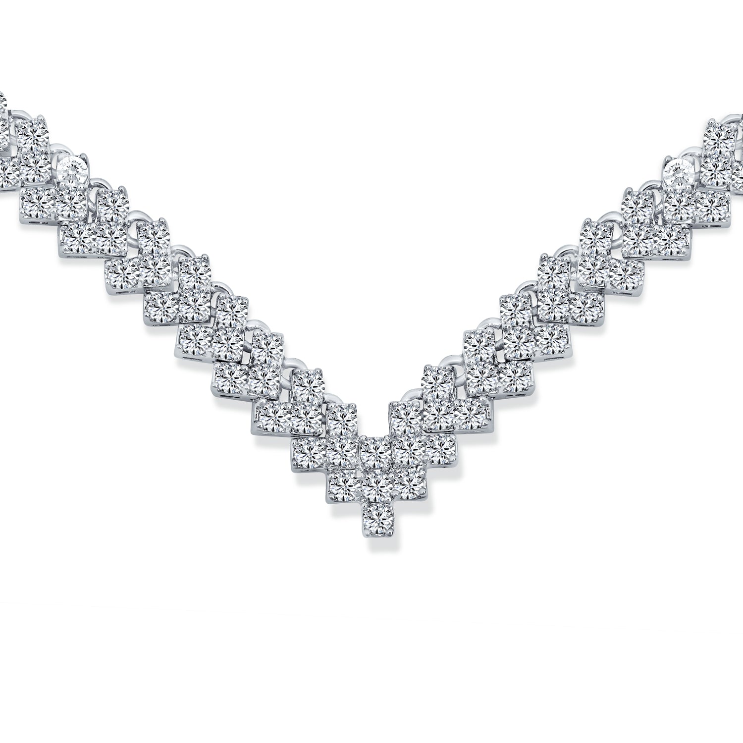 - The V-shaped bridal tennis necklace captures your dream wedding's essence. Romantic, enchanting, refined, and sophisticated. This stunning Cubic Zirconia accessory is perfect for your special day. At 15 inches, it complements any wedding gown style. Ideal for the entire wedding party, including the mother of the bride. Also, a perfect gift for April birthdays and jewelry lovers.