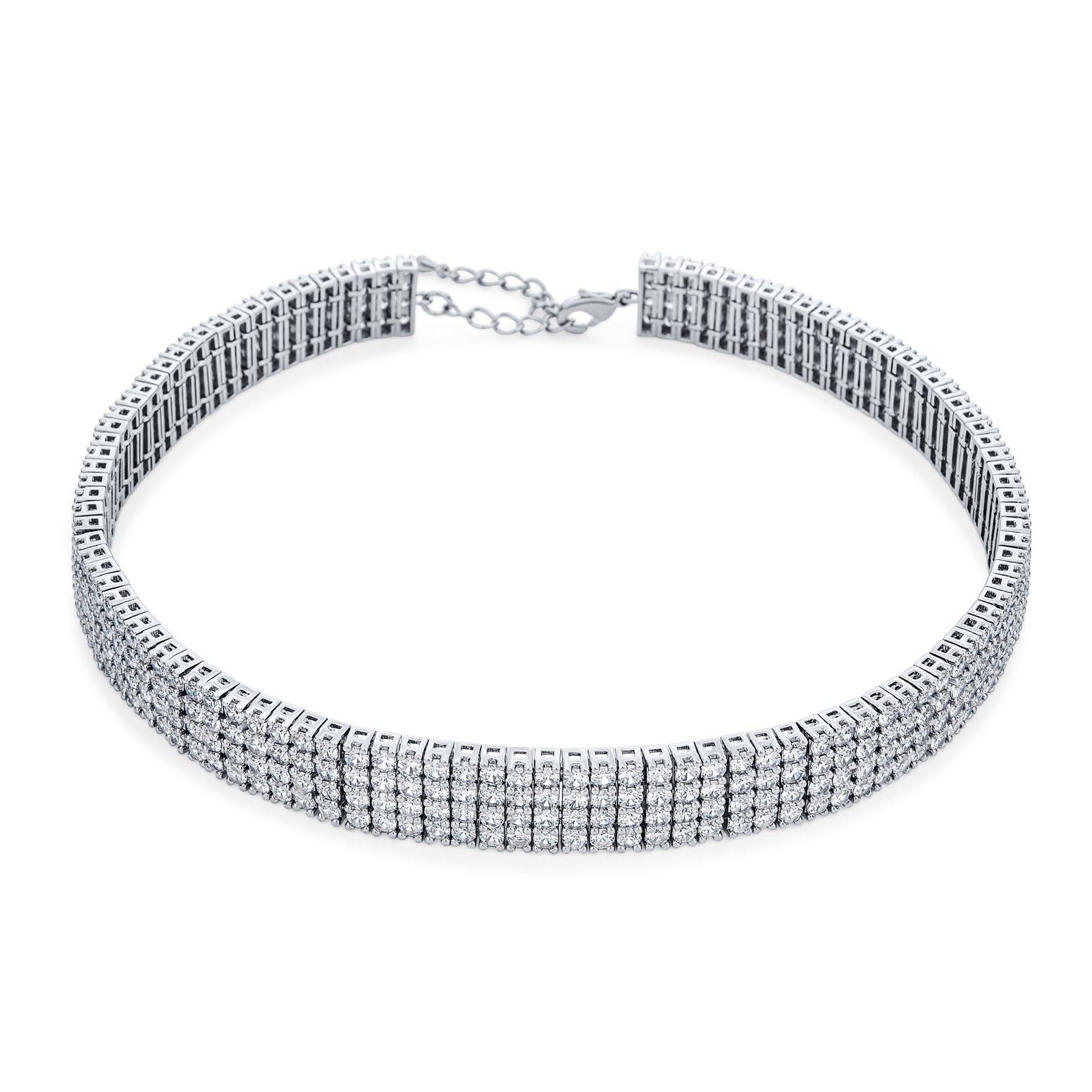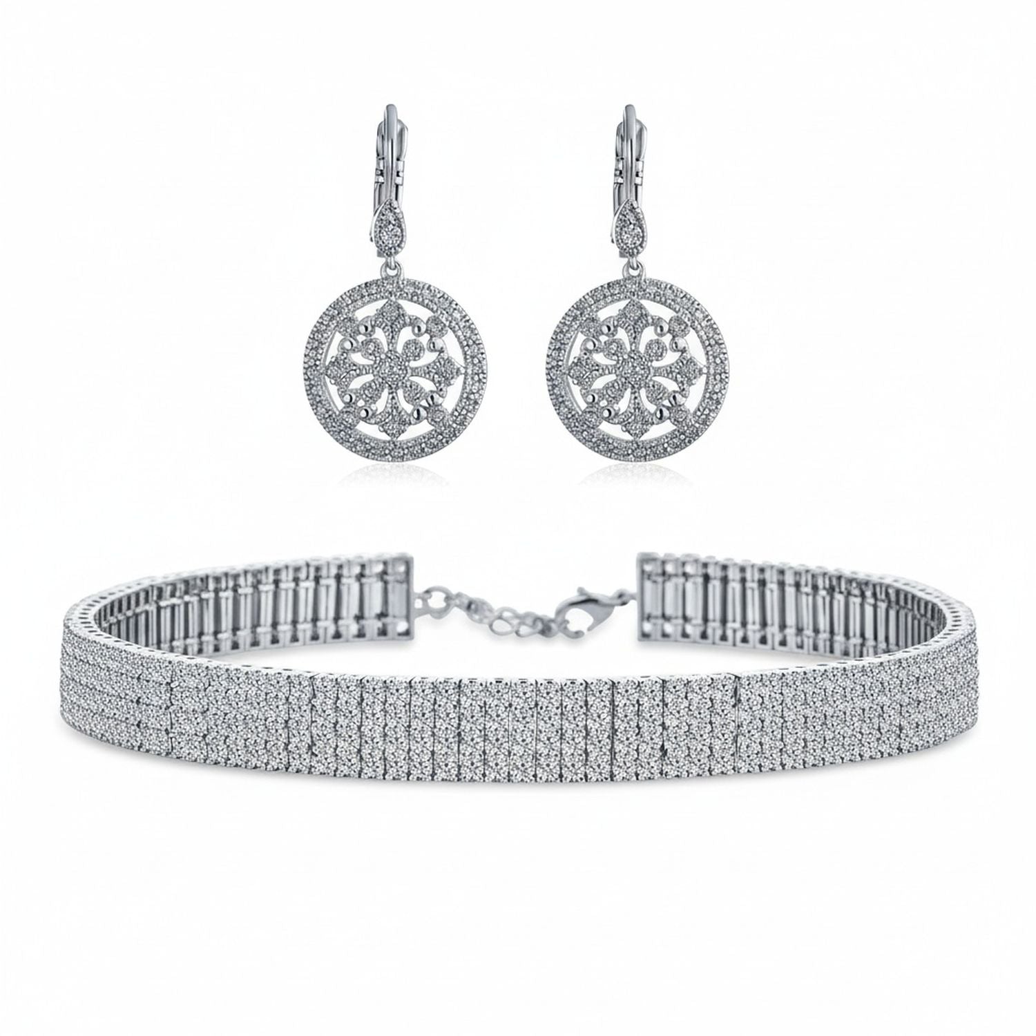 • Enhance your style with this elegant jewelry set featuring a 5-row crystal 1920s Gatsby-inspired choker and vintage-style pave CZ circle earrings. Both pieces are rhodium-plated for lasting shine, with a lobster clasp and lever back for a secure, comfortable fit. Perfect for weddings, proms, or special occasions, this set adds timeless sparkle and art deco charm to any outfit.